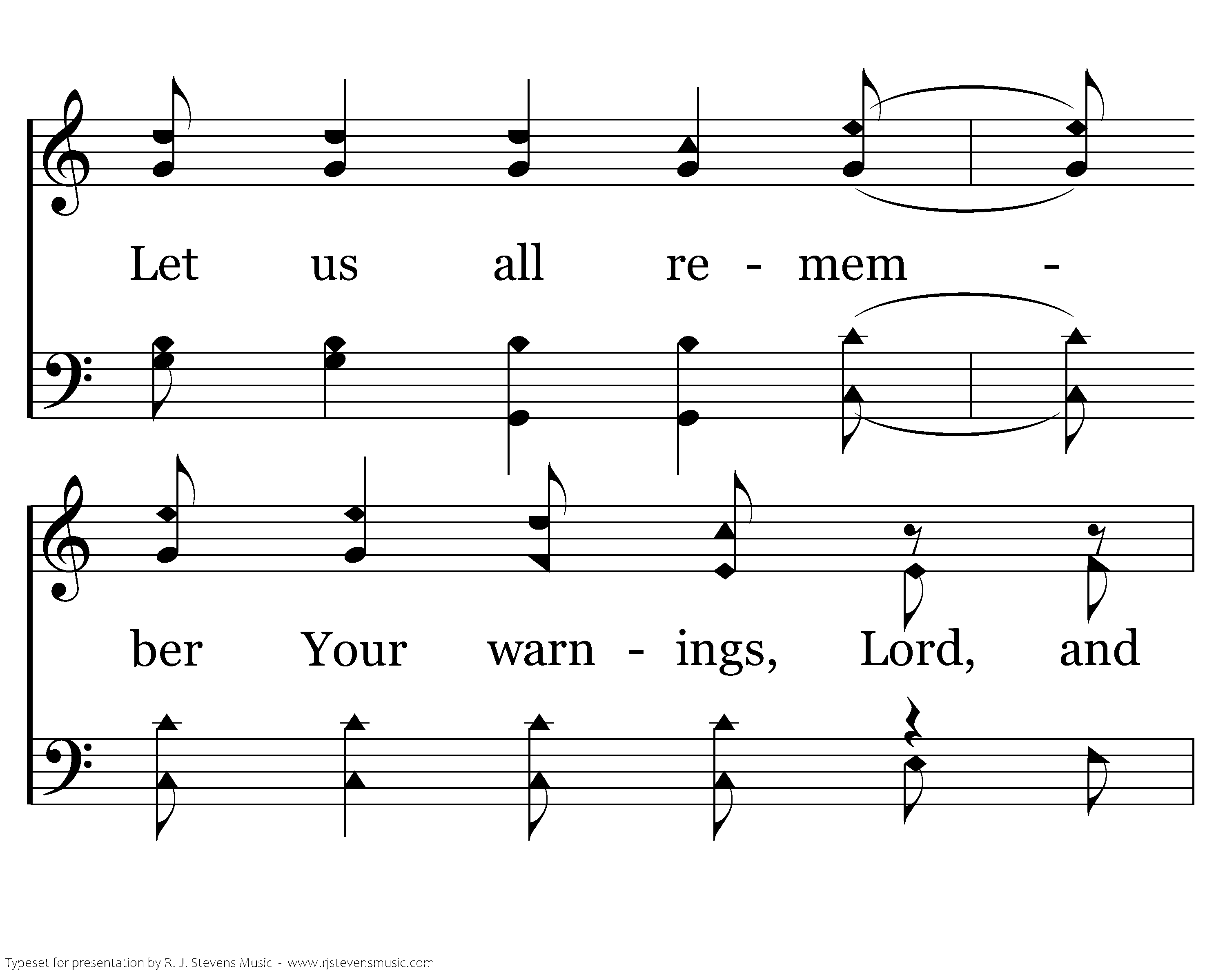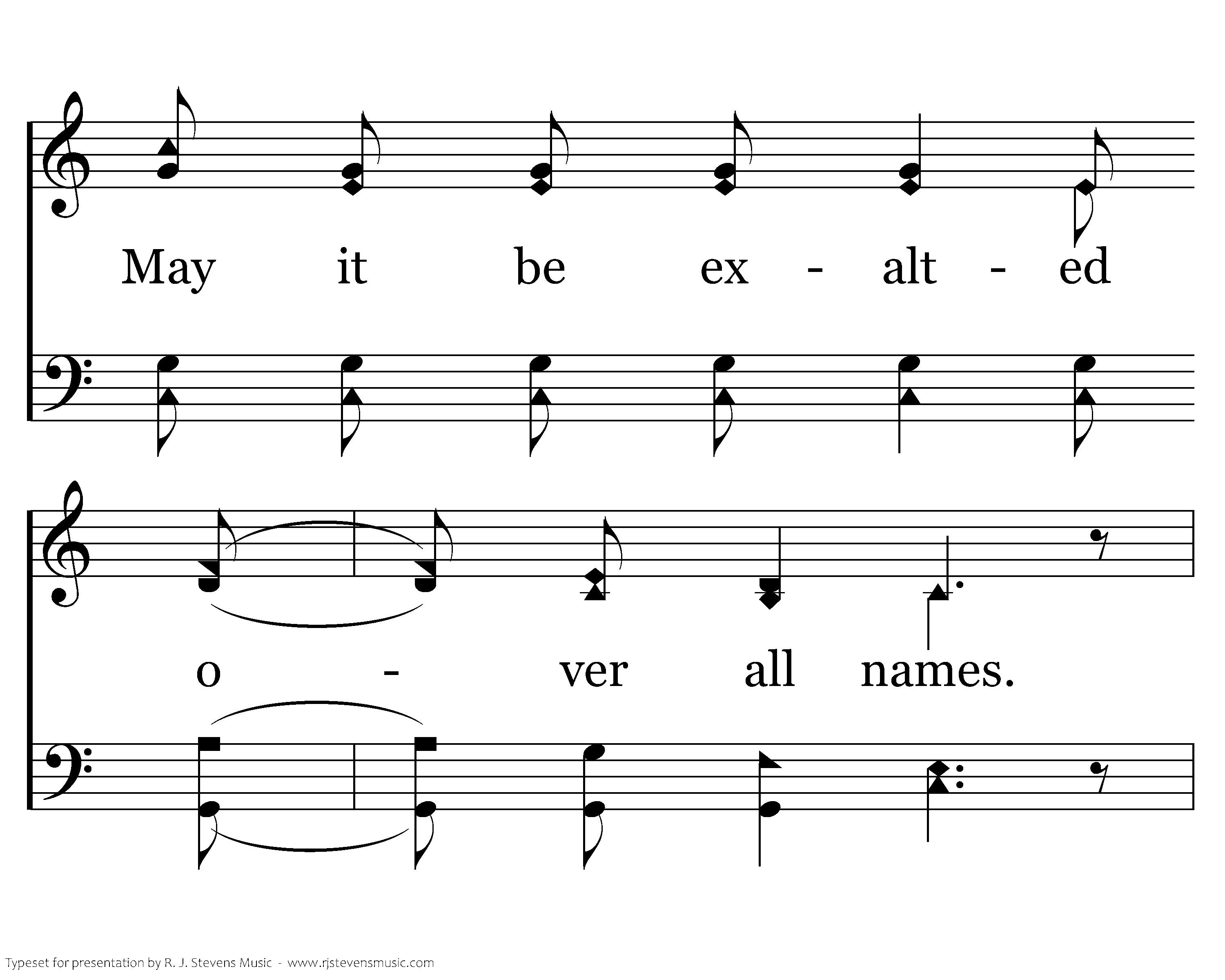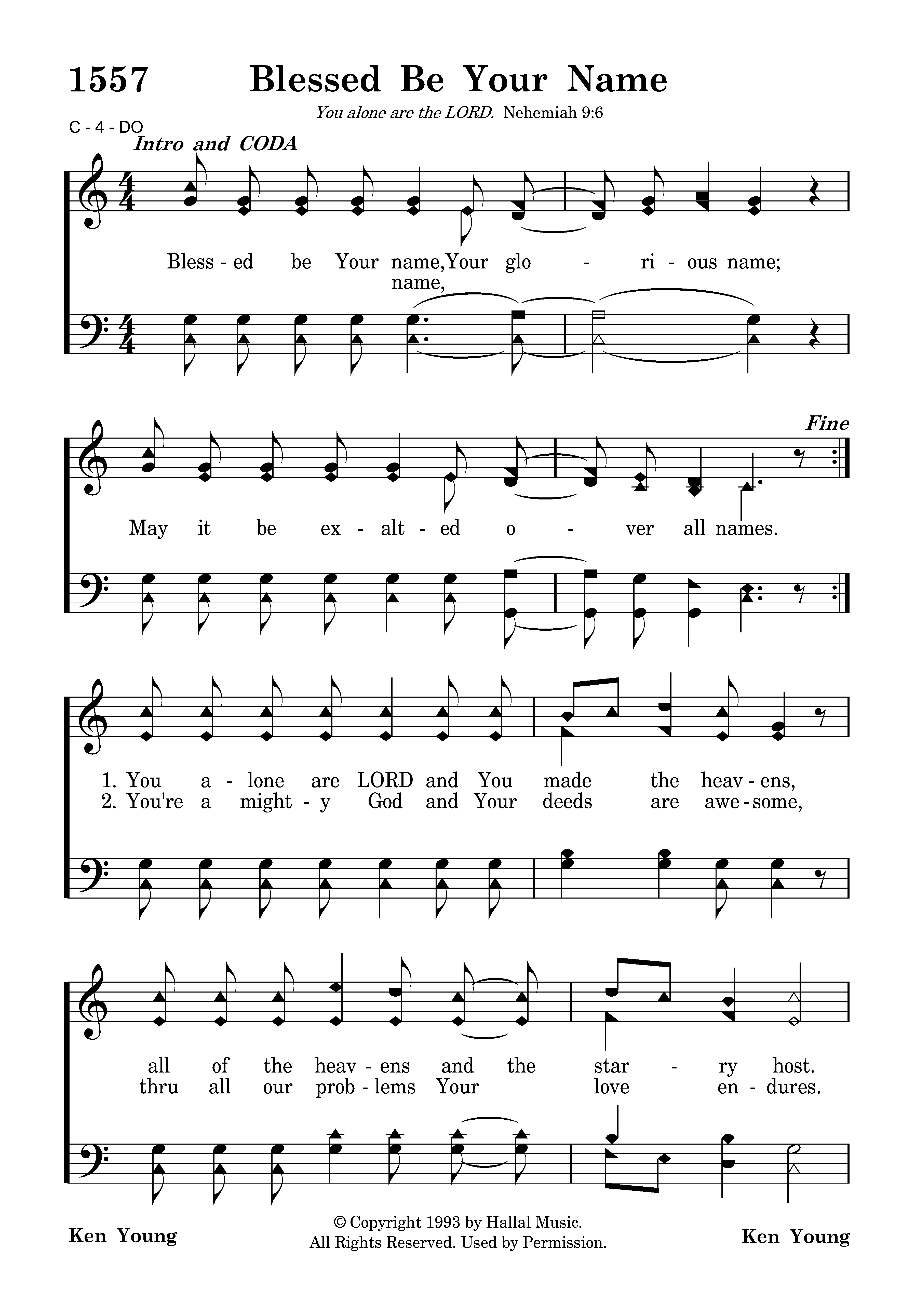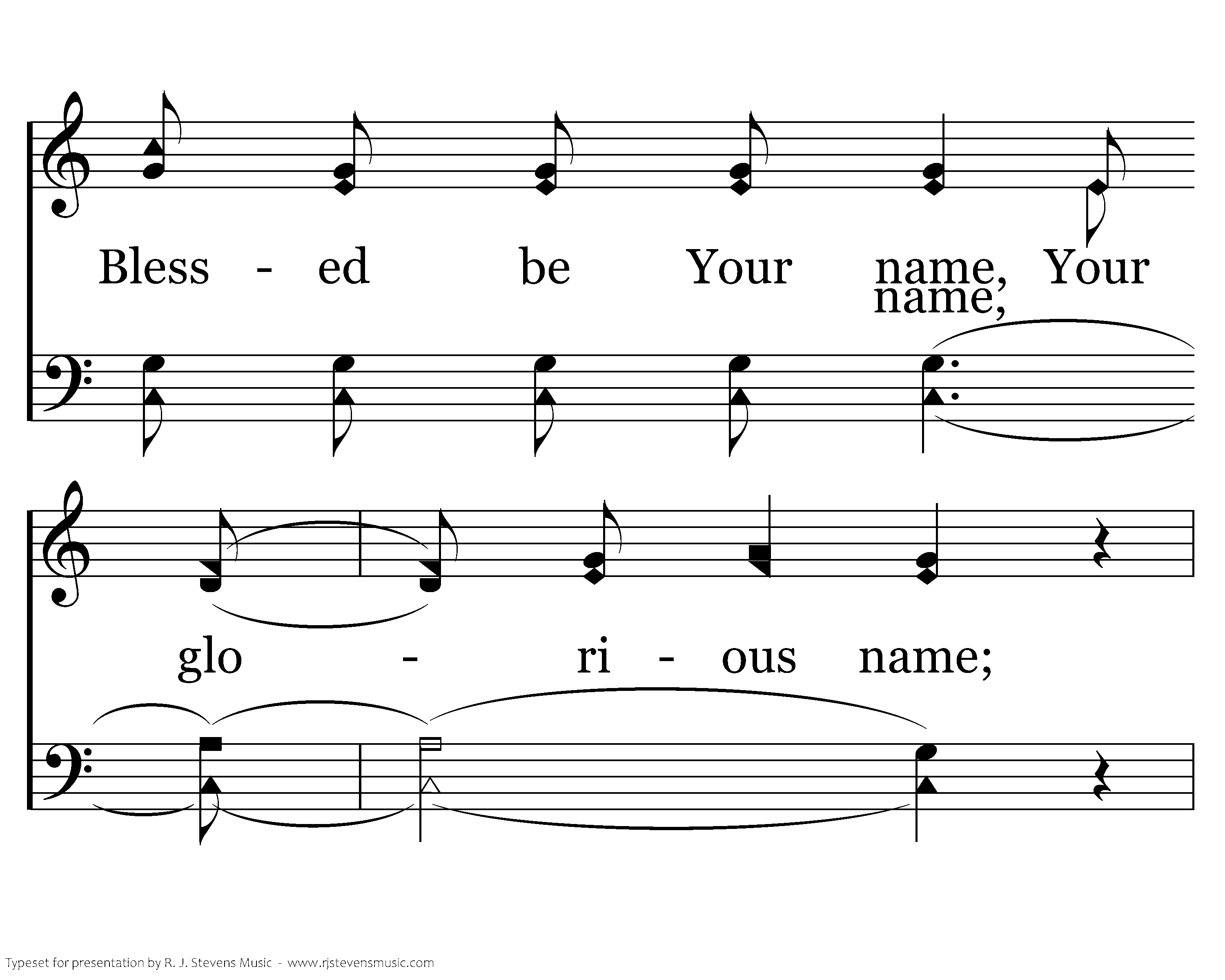 Blessed be Your name, Your glorious name; May it be exalted over all names. You're a mighty God and Your deeds are awesome, thru all our problems Your love endures. Nothing can happen that Your eye does not see it, All of the glory and pow'r is Yours. Let us all remember Your warnings, Lord, and give us strength to obey Your word.