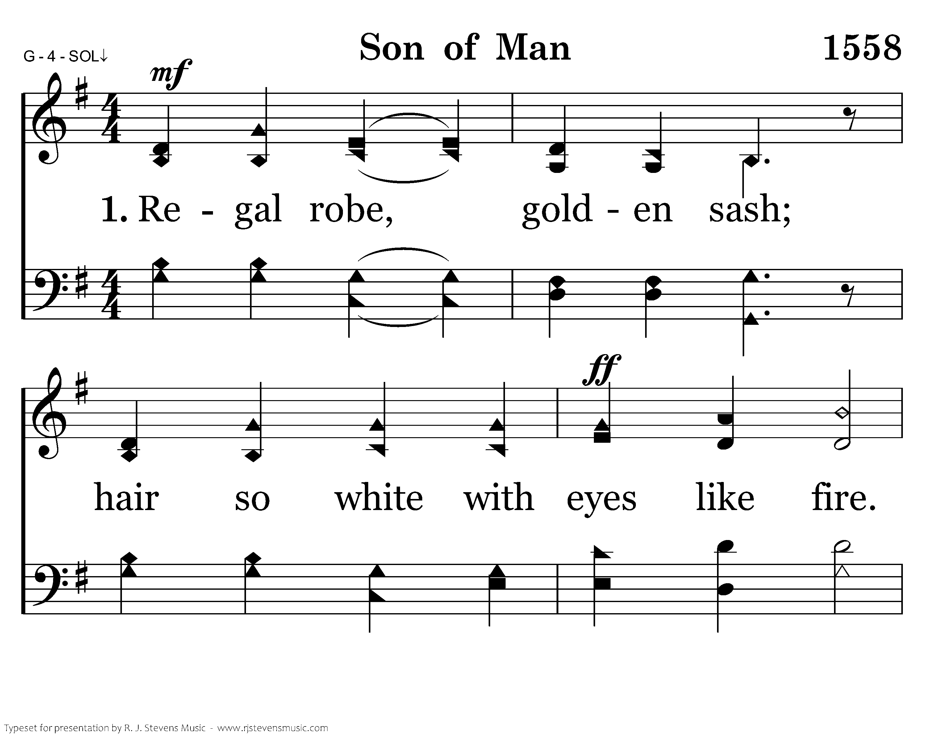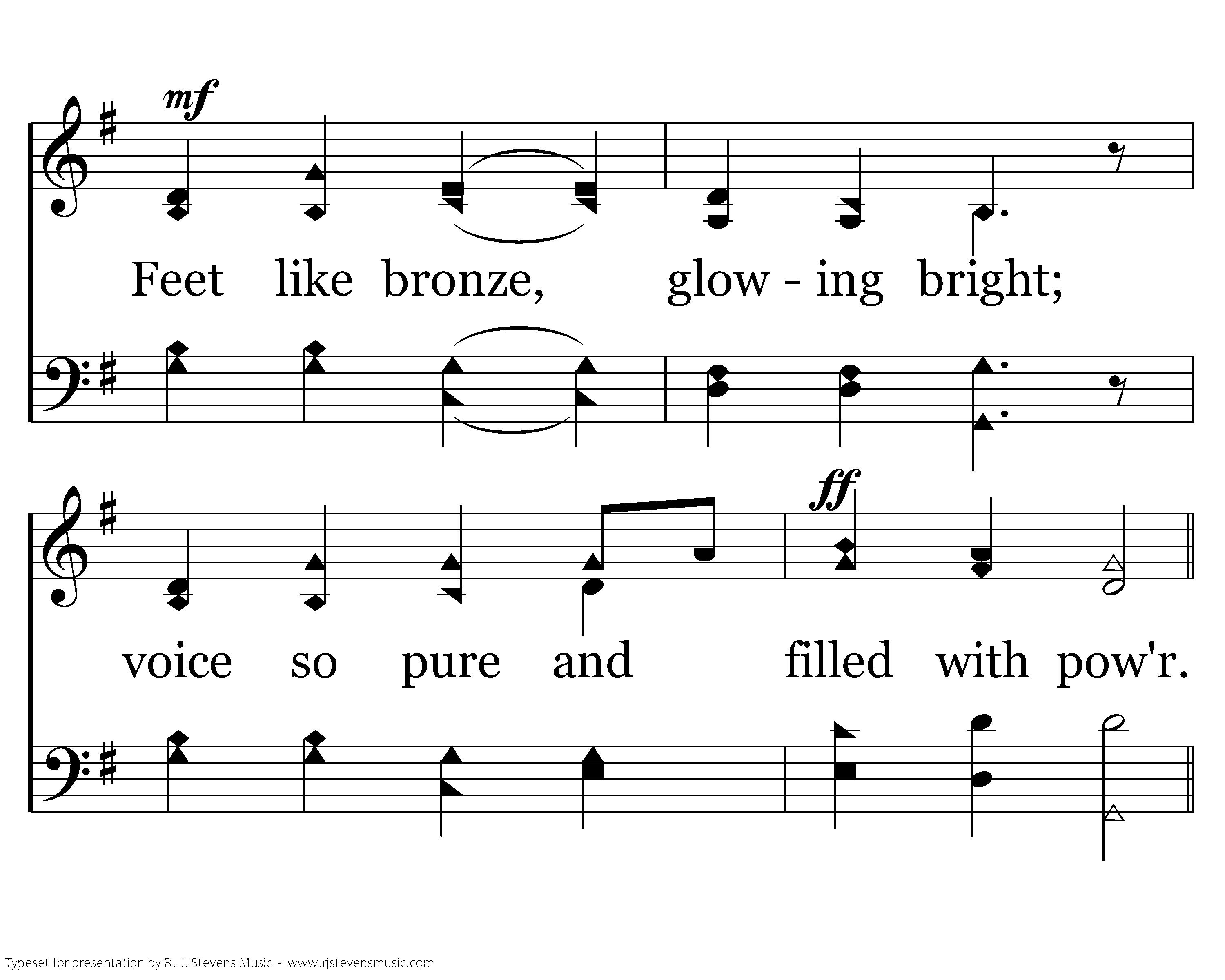 Regal robe, golden sash; hair so white with eyes like fire. Feet like bronze, glowing bright; voice so pure and filled with pow'r.