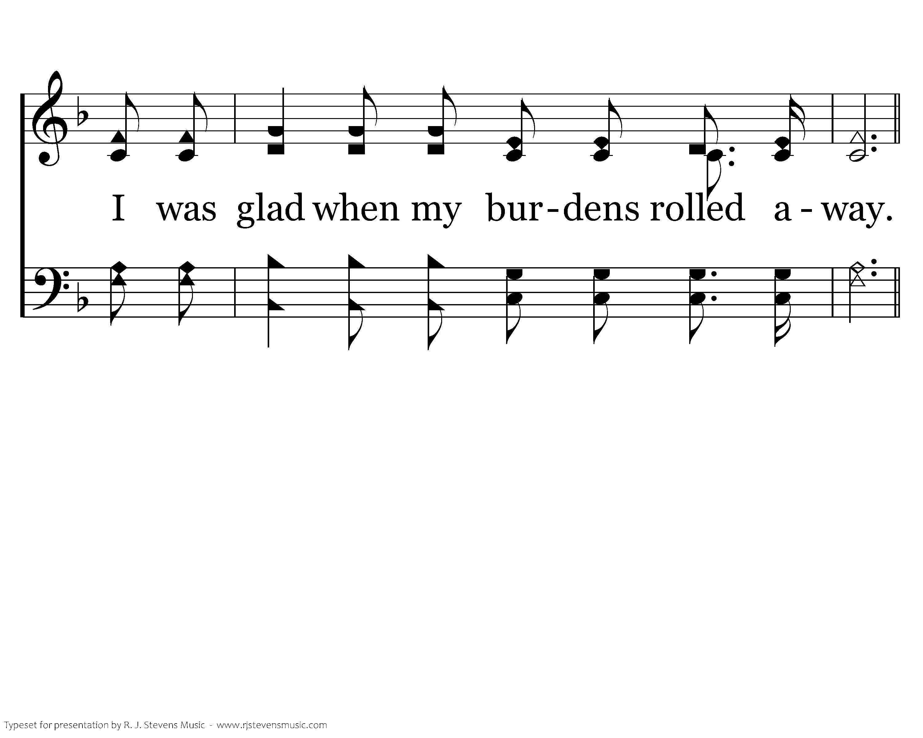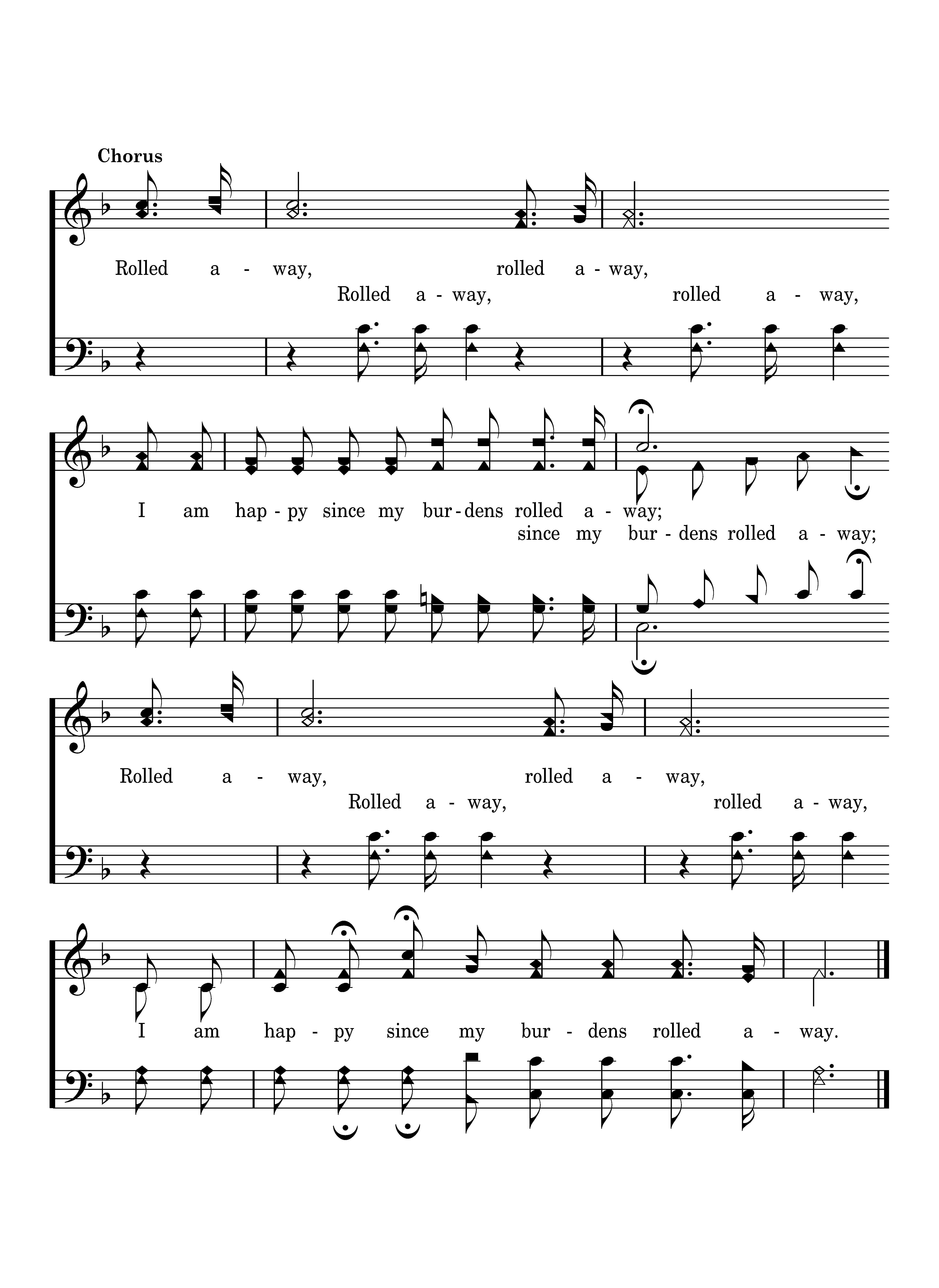 Rolled away, rolled away, I am happy since my burdens rolled away; Rolled away, rolled away, I am happy since my burdens rolled away.