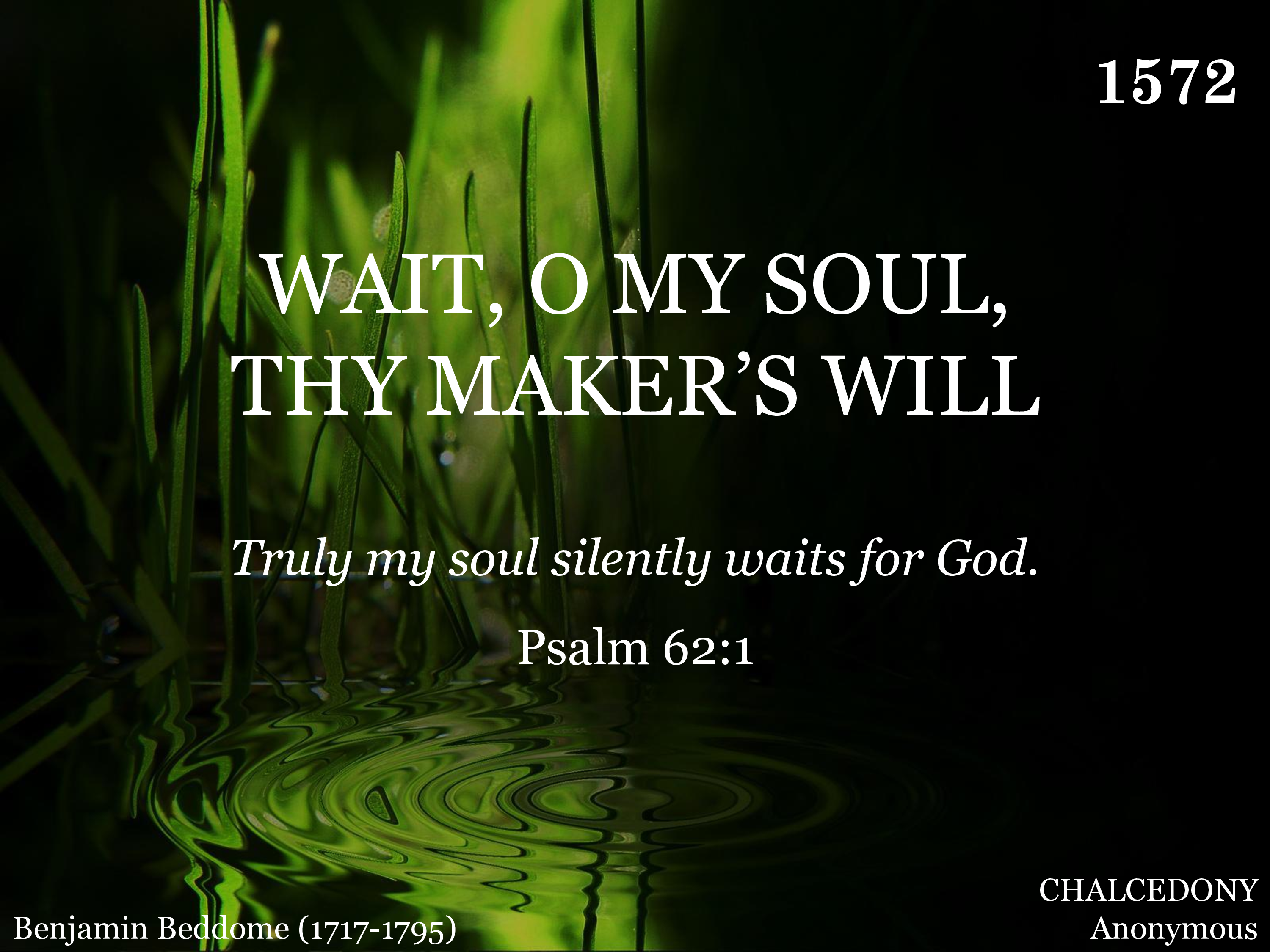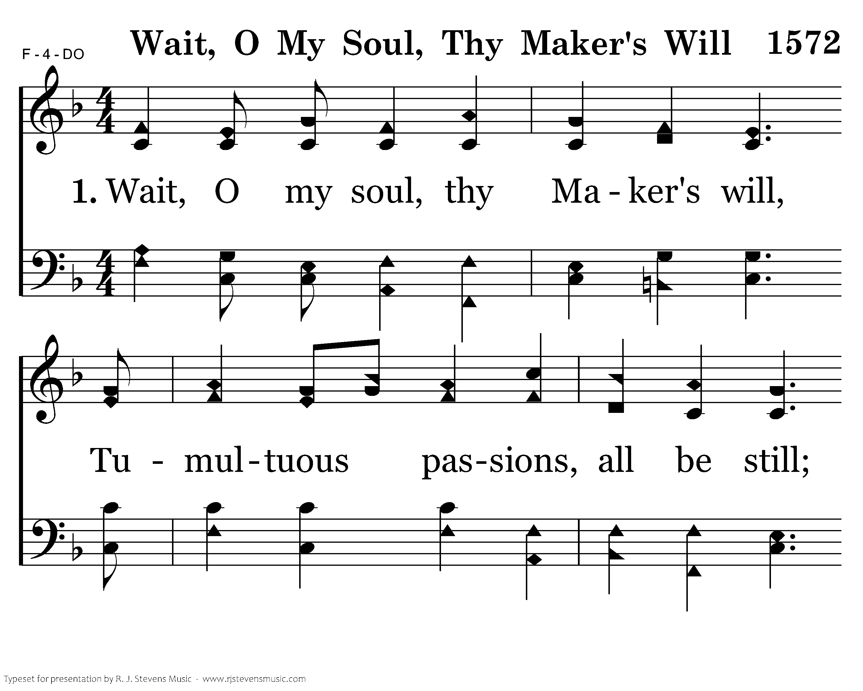 Wait, O my soul, thy Maker's will, Tumultuous passions, all be still; Nor let a murm'ring tho't arise; His ways are just, His counsels wise.