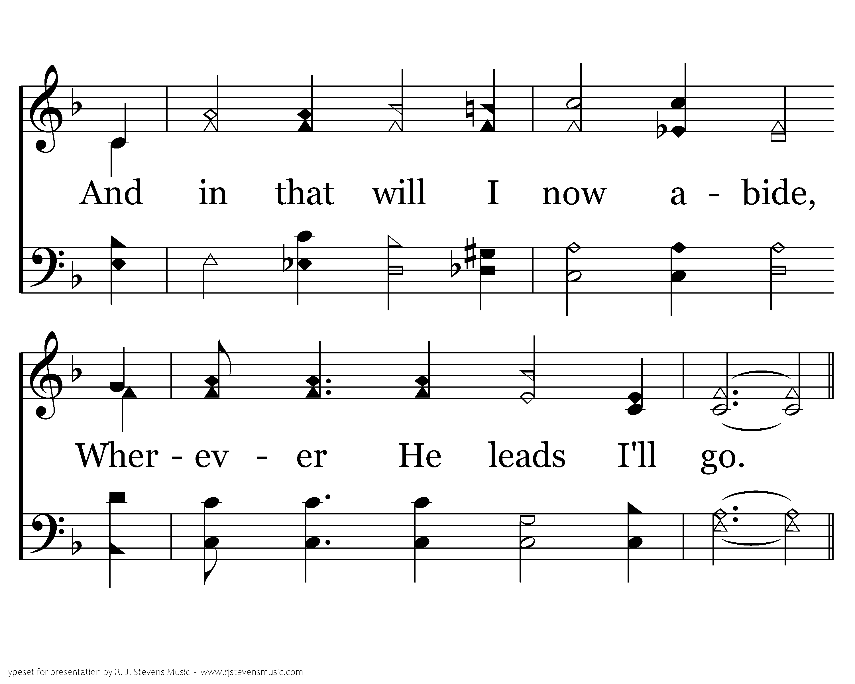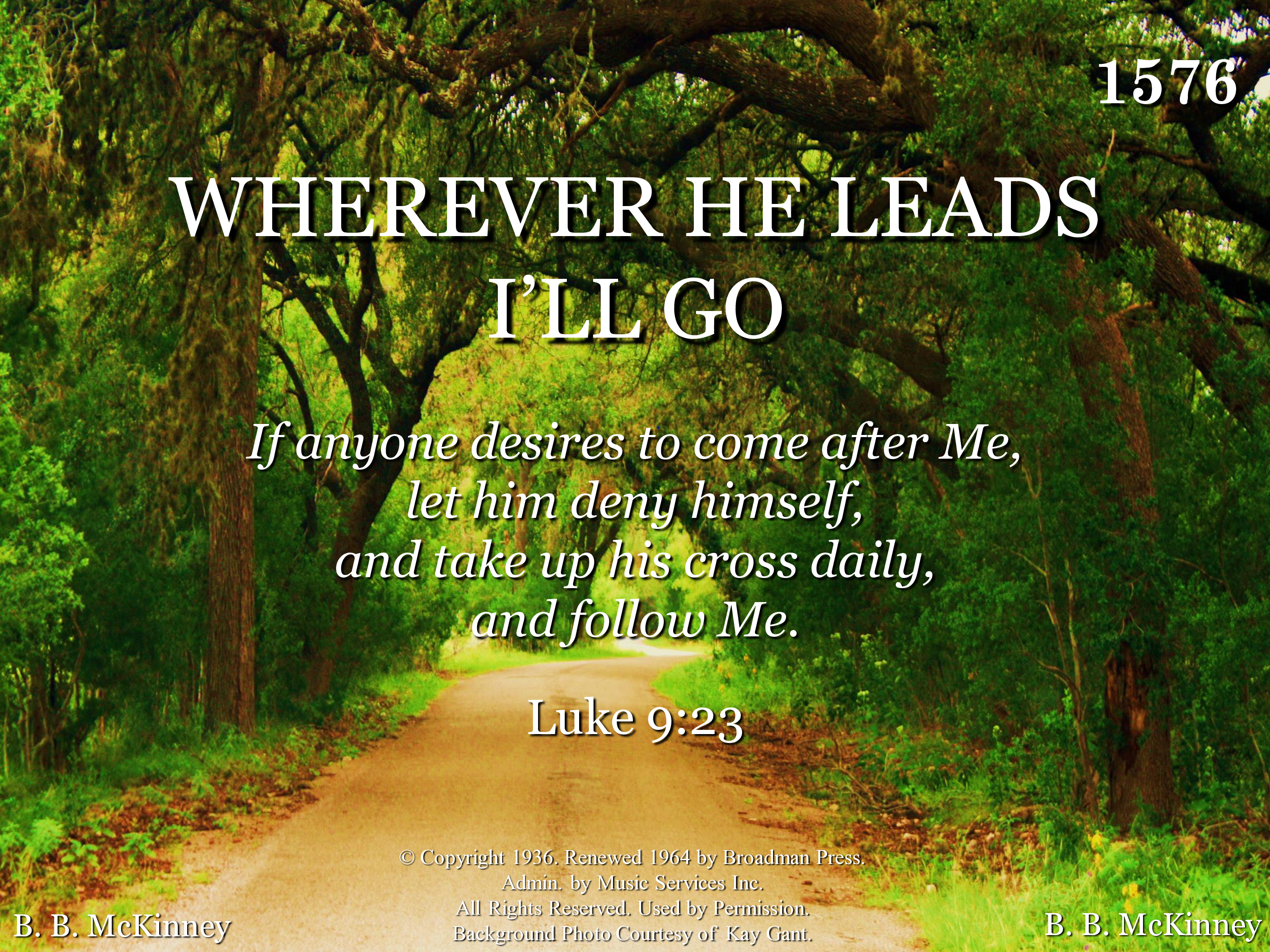 Wherever He leads I'll go, Wherever He leads I'll go, I'll follow my Christ who loves me so, Wherever He leads I'll go.
