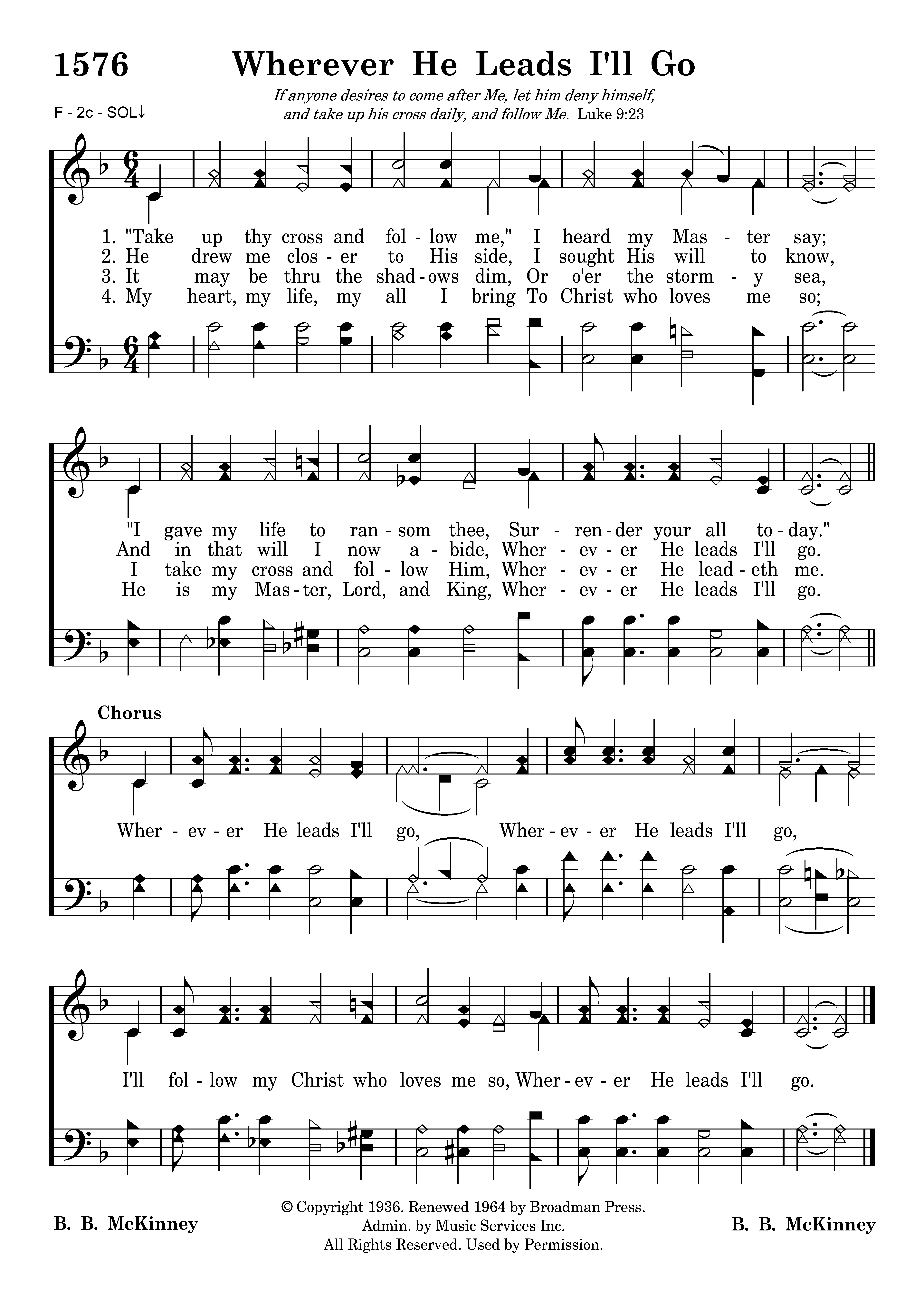 It may be thru the shadows dim, Or o'er the stormy sea, I take my cross and follow Him, Wherever He leadeth me
