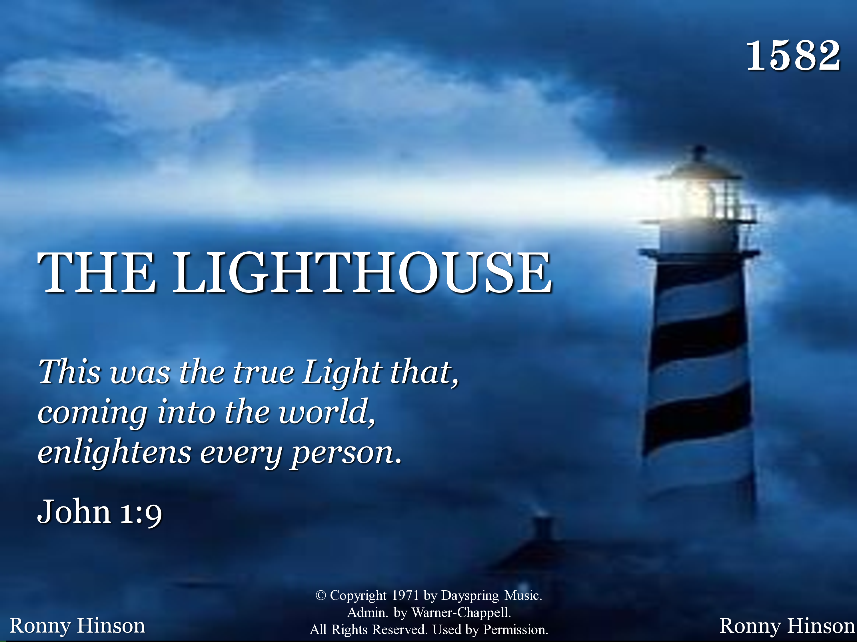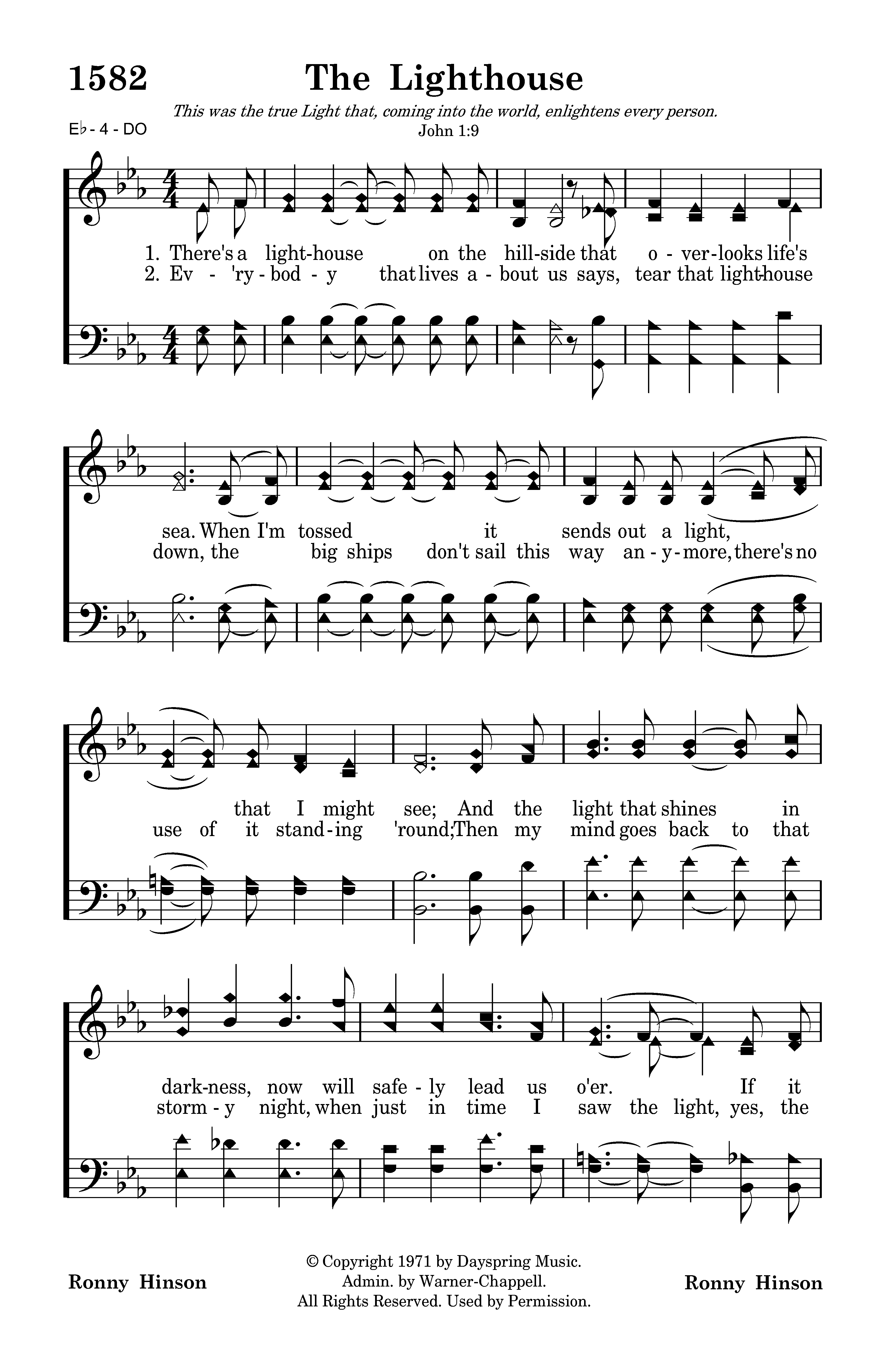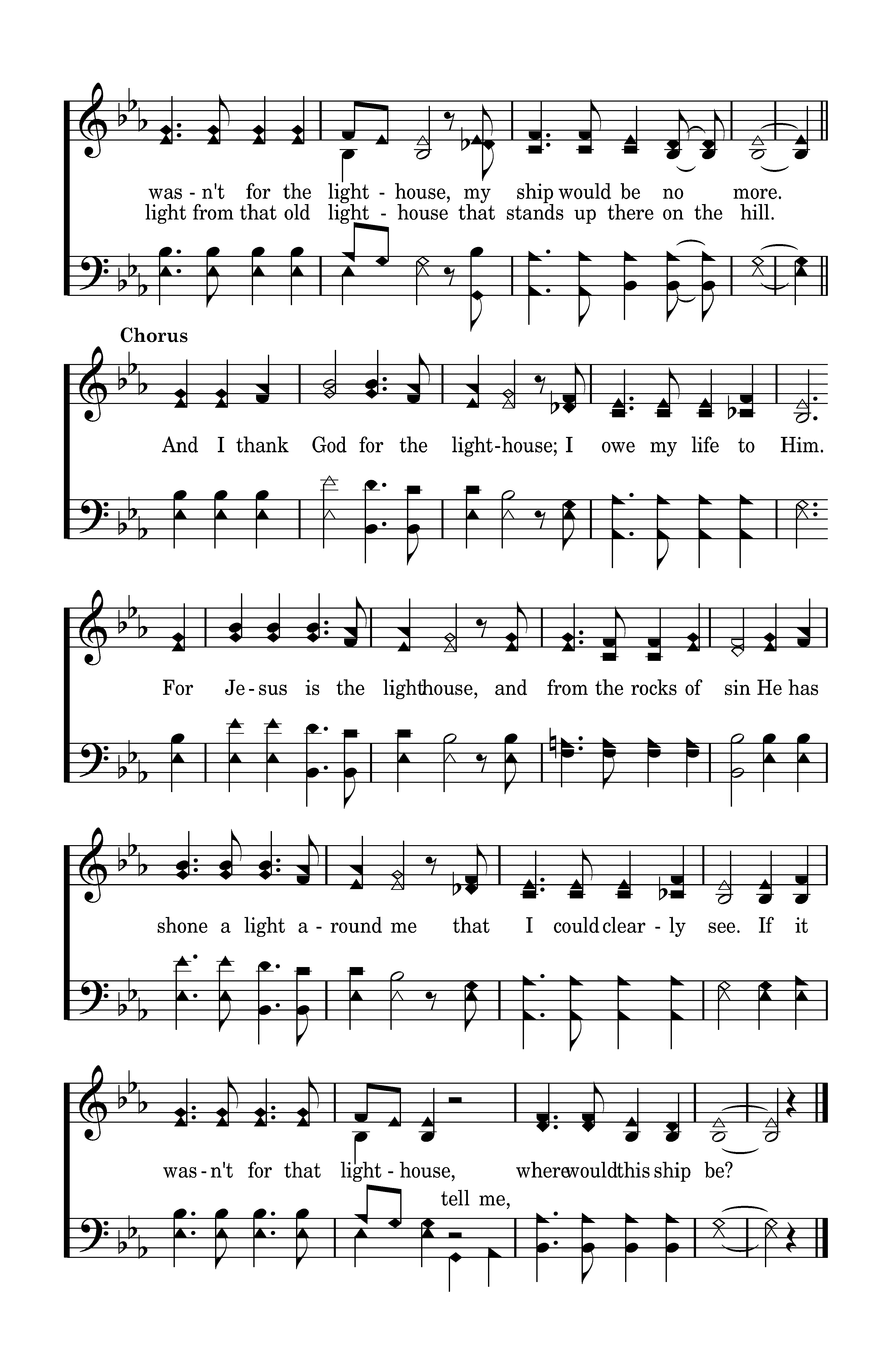 There's a lighthouse on the hillside that overlooks life's sea. When I'm tossed it sends out a light, that I might see; And the light that shines in darkness, now will safely lead us o'er. If it wasn't for the lighthouse, my ship would be no more.