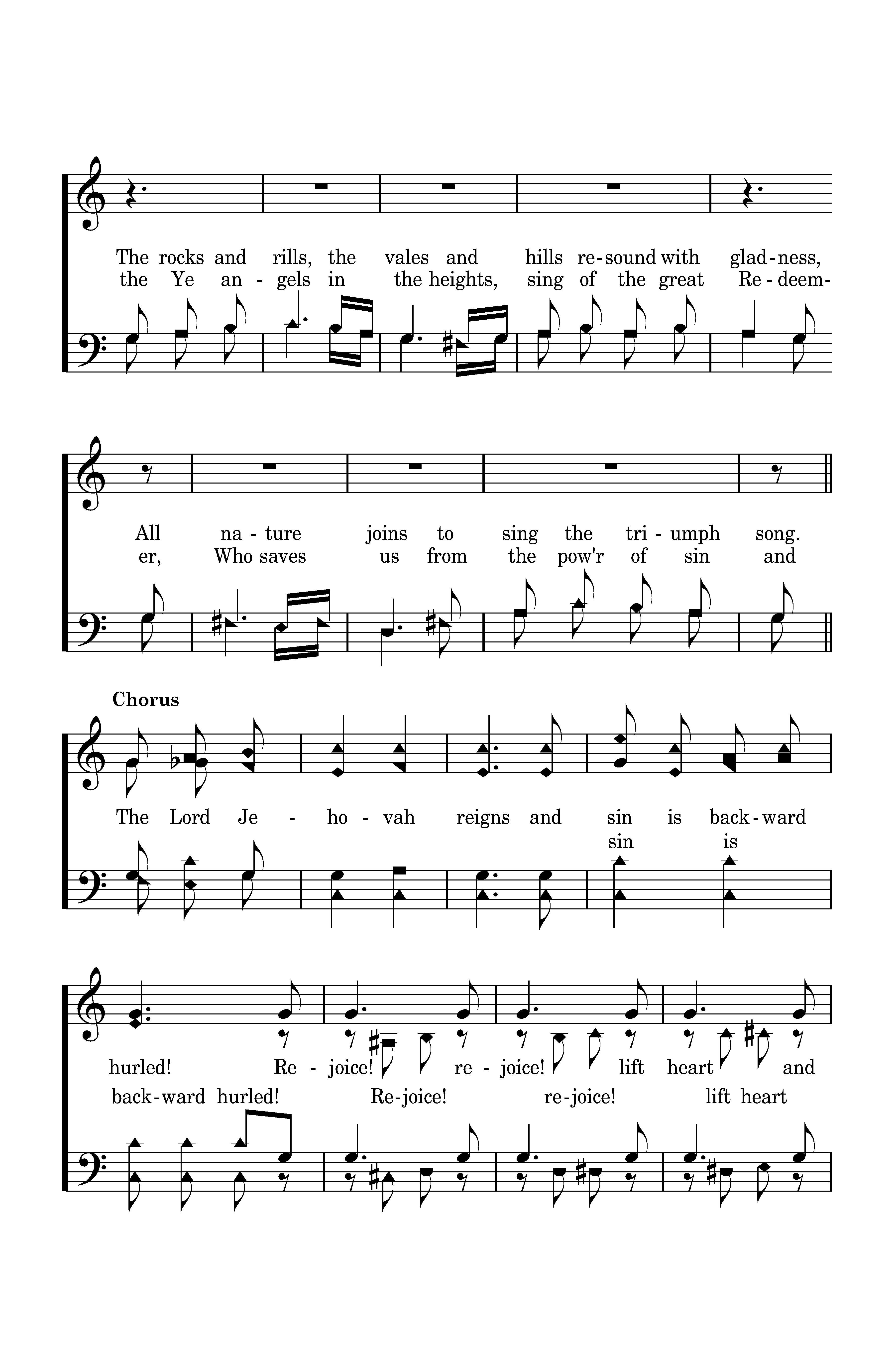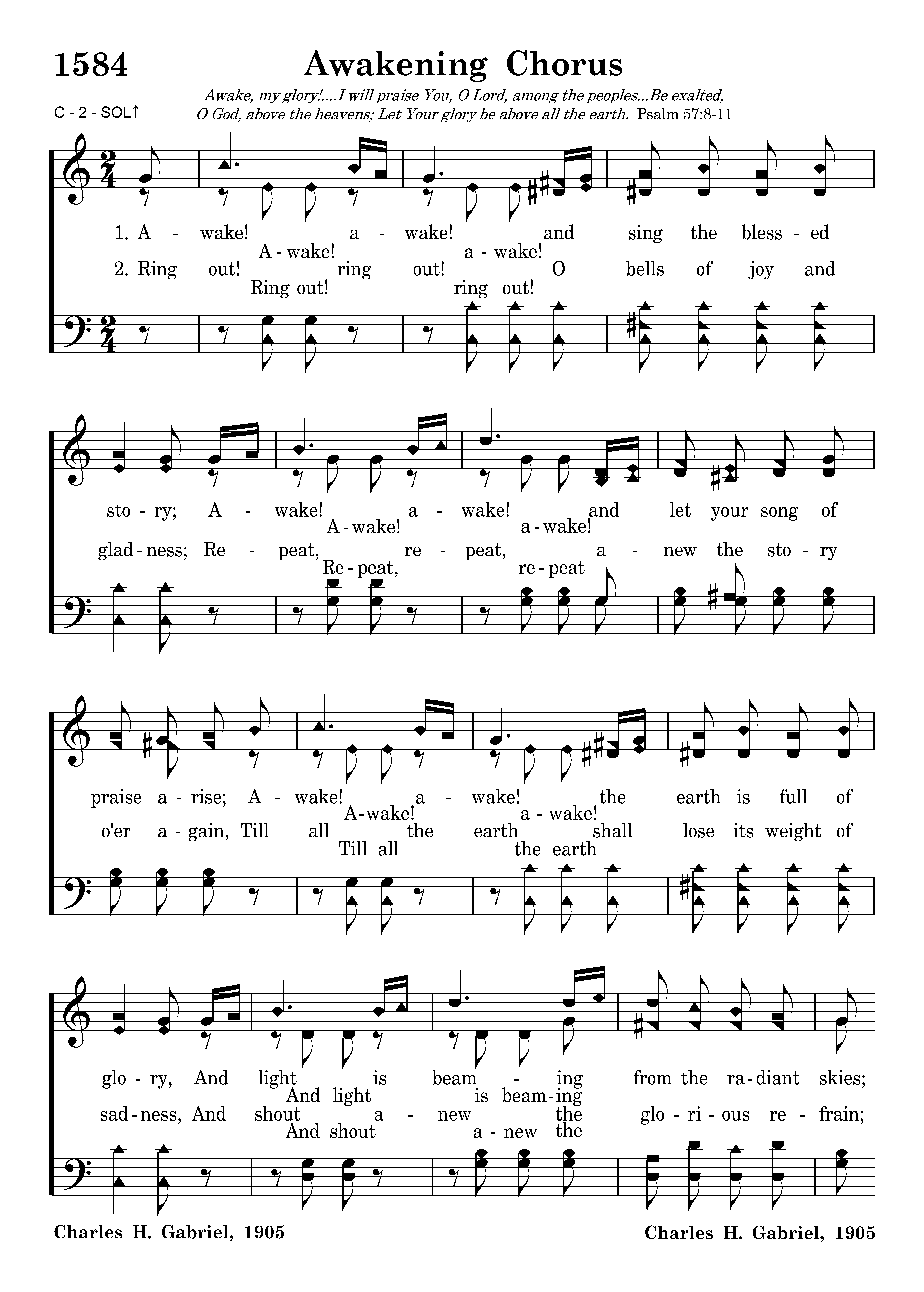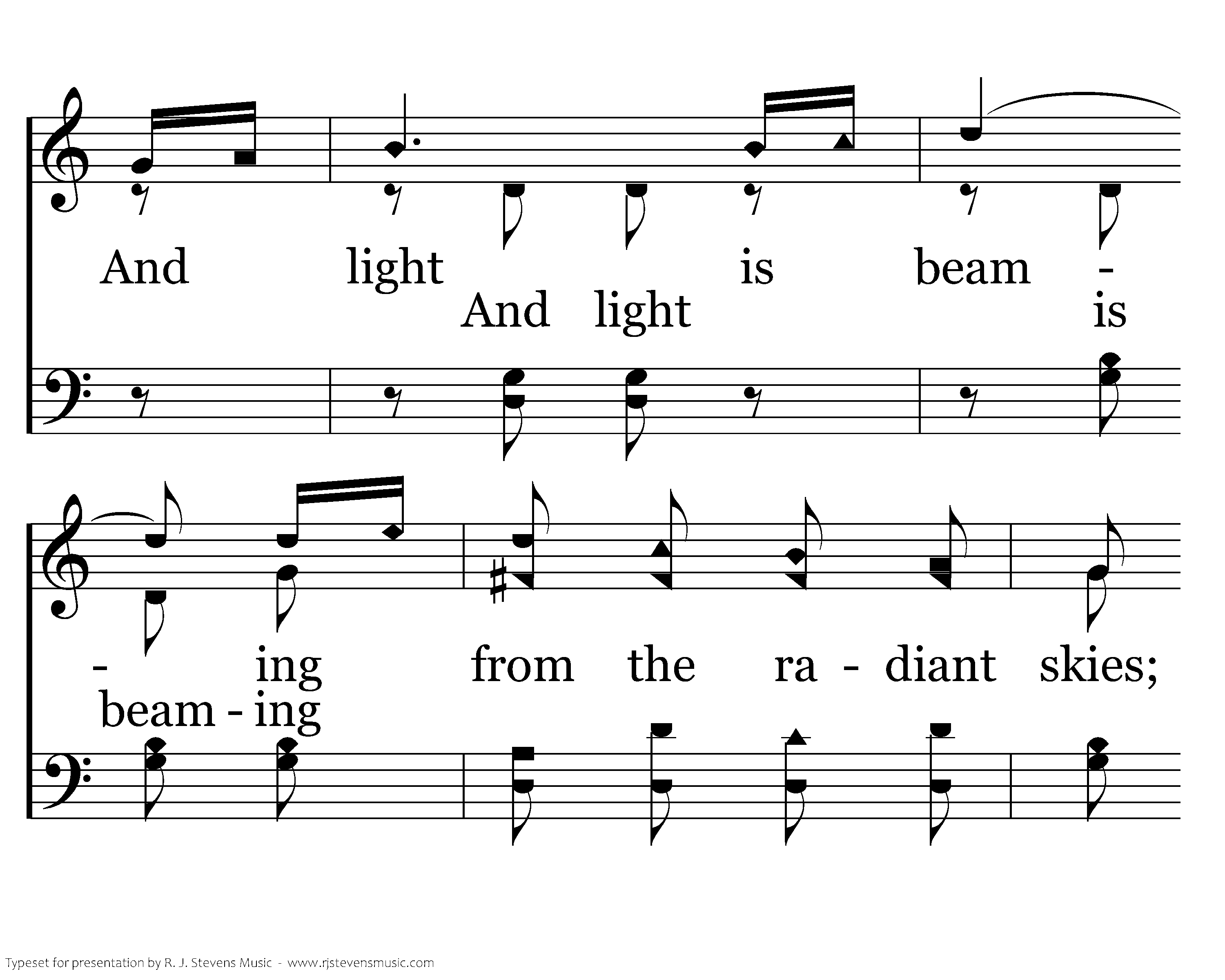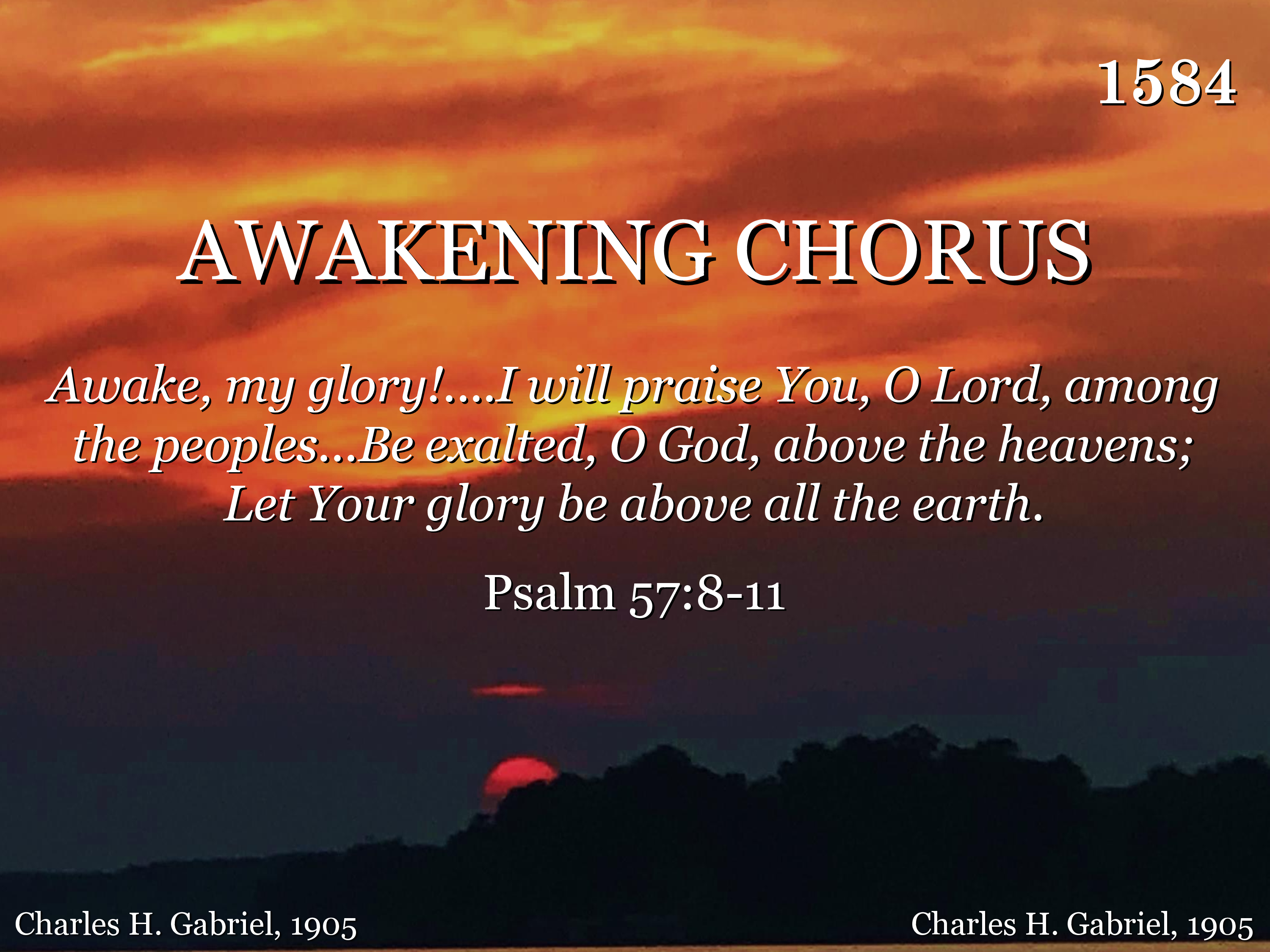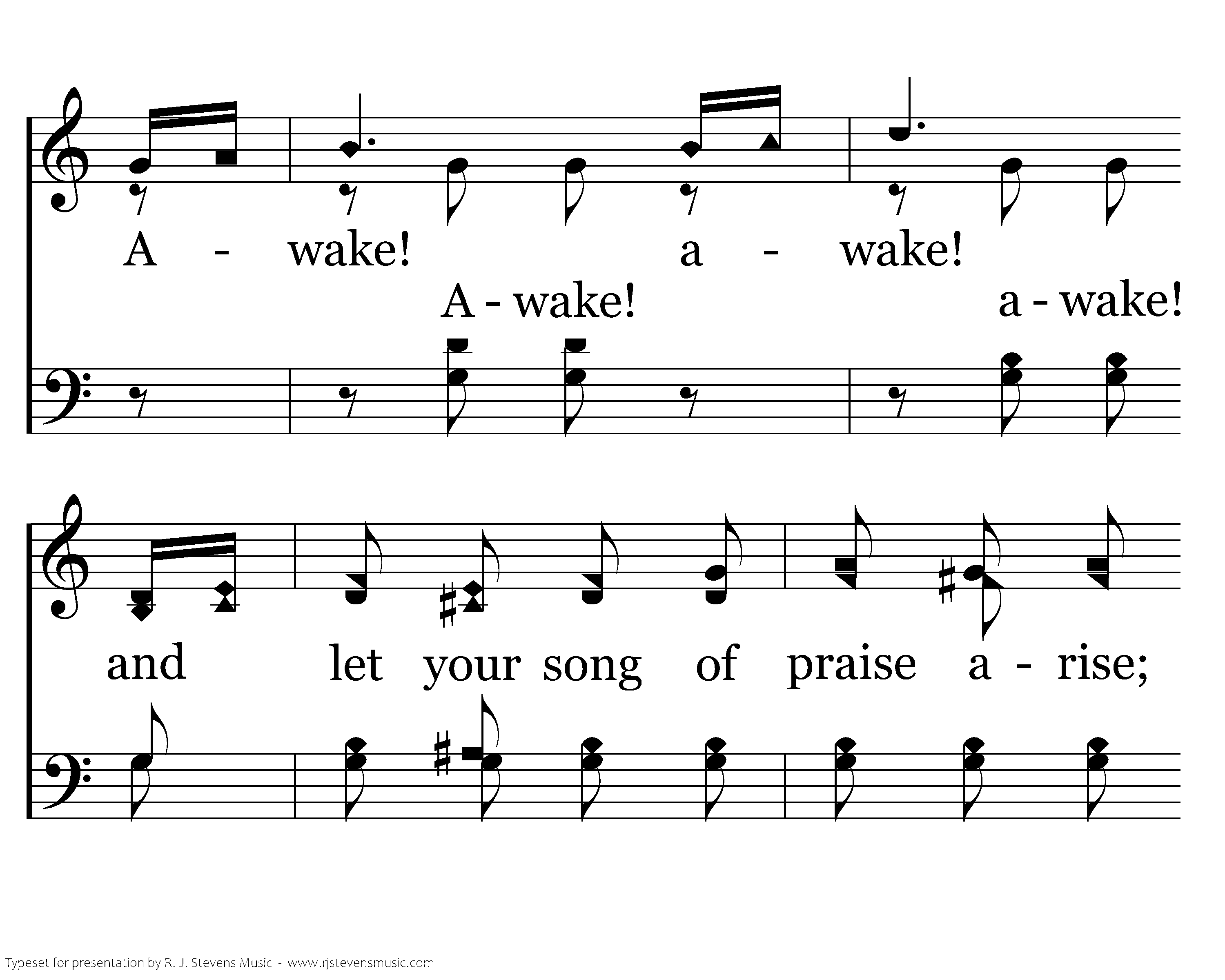 Awake! awake! and sing the blessed story; Awake! awake! and let your song of praise arise; Awake! awake! the earth is full of glory, And light is beaming from the radiant skies; The rocks and rills, the vales and hills resound with gladness, All nature joins to sing the triumph song.