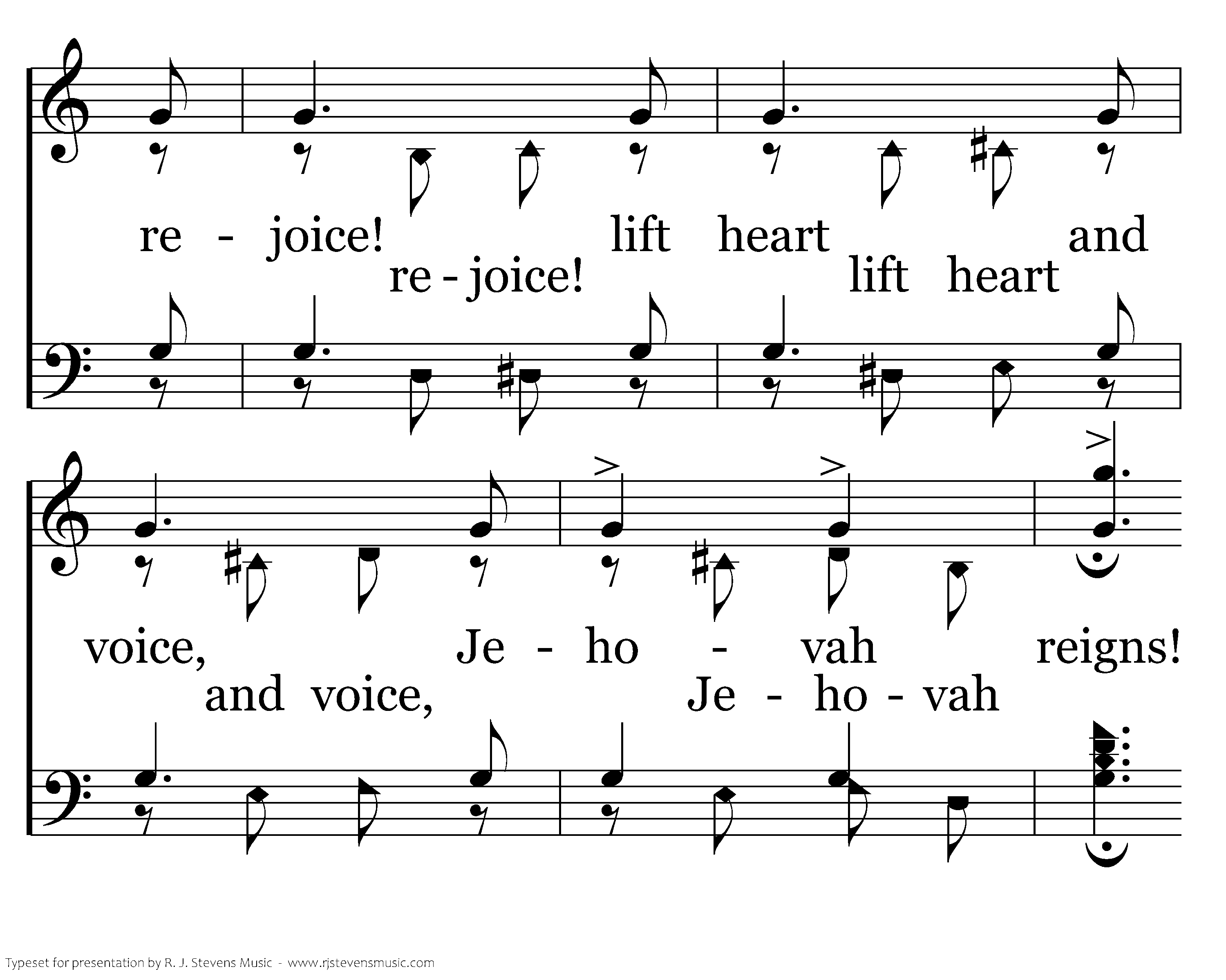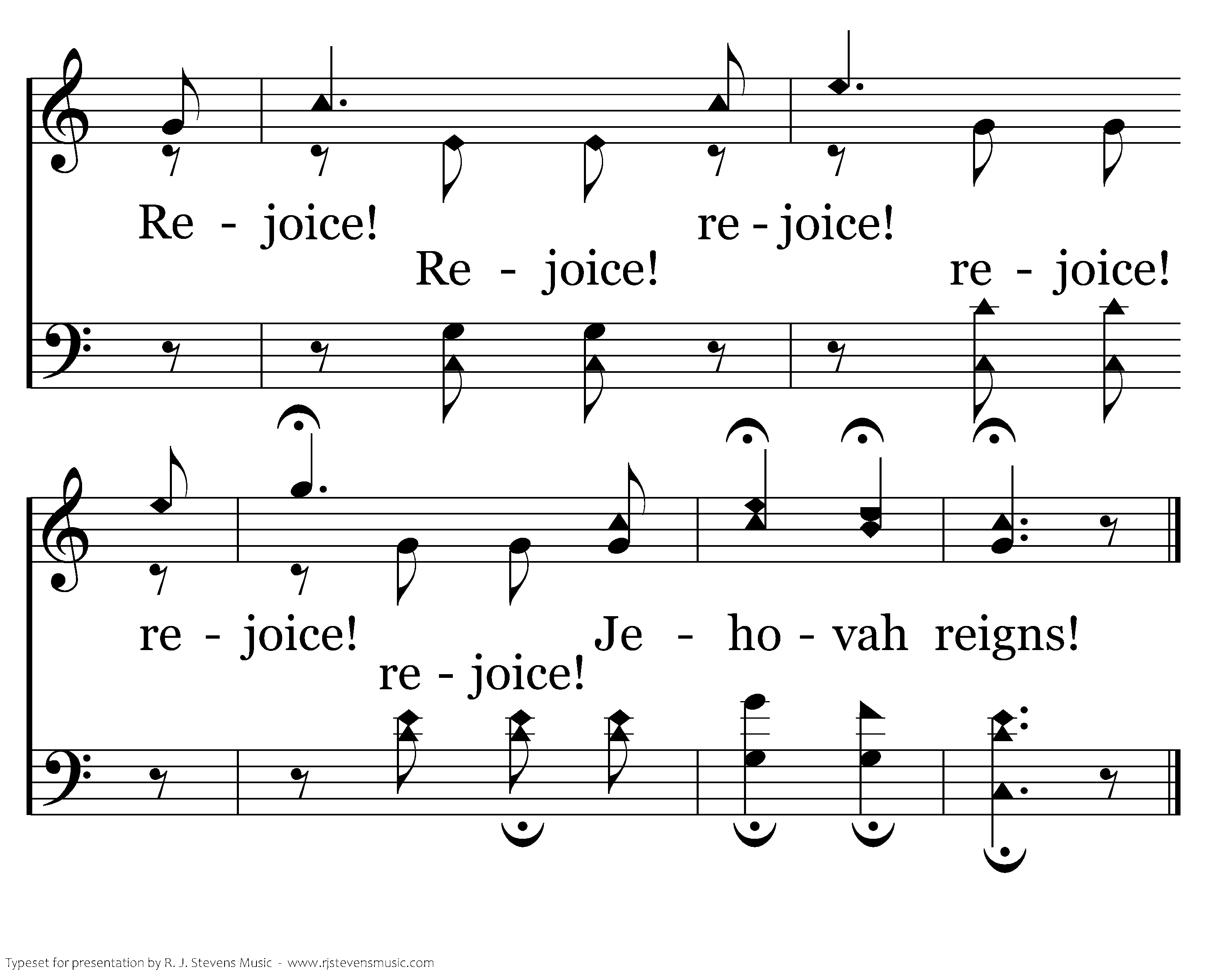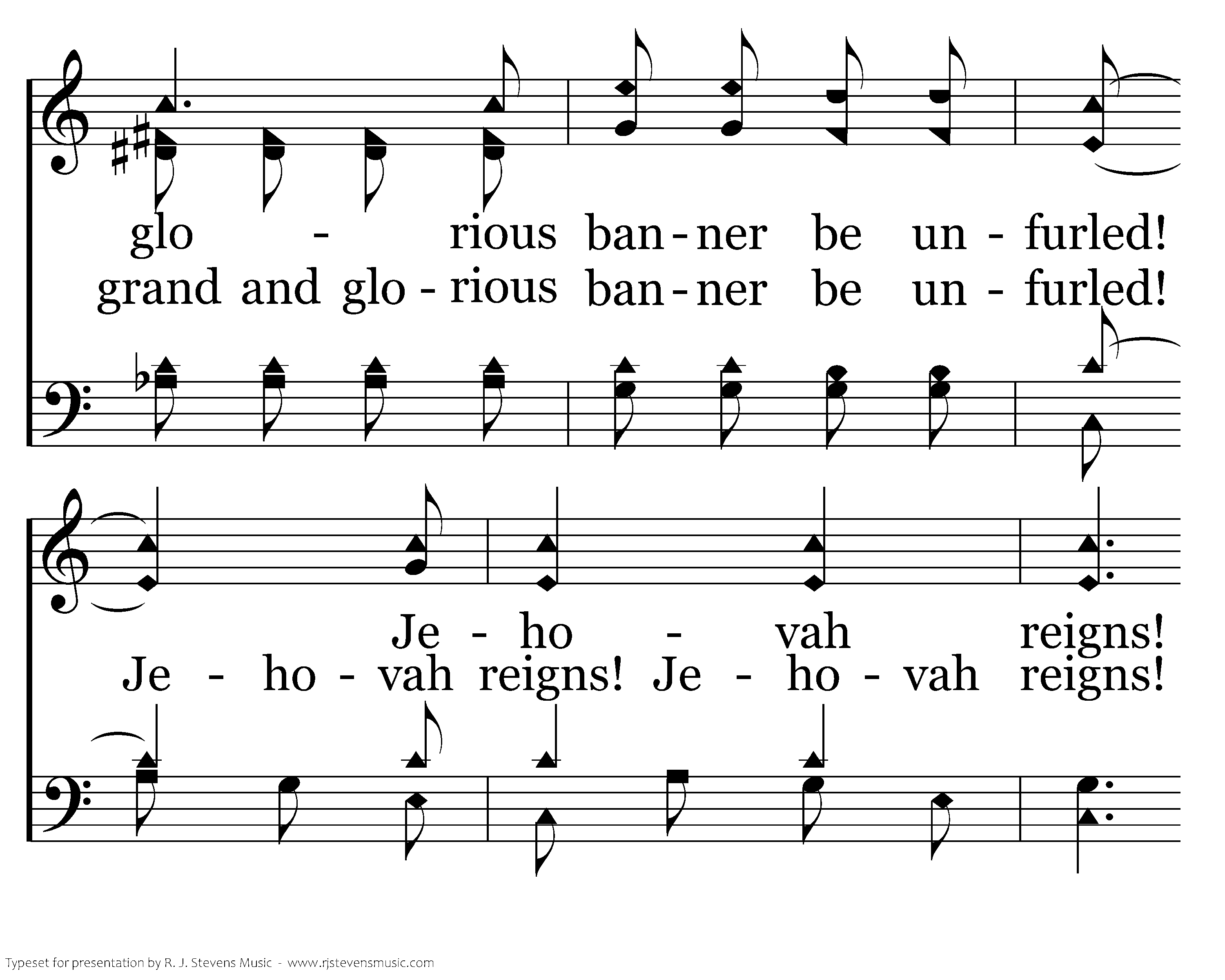 The Lord Jehovah reigns and sin is backward hurled! Rejoice! rejoice! lift heart and voice, Jehovah reigns! Proclaim His sov'reign pow'r to all the world, And let His glorious banner be unfurled! Jehovah reigns! Rejoice! rejoice! rejoice! Jehovah reigns! sin is backward hurled! Rejoice! rejoice! lift heart and voice, Jehovah pow'r to all the world, And let His grand and glorious banner be unfurled! Jehovah reigns! Jehovah reigns! Rejoice! rejoice! rejoice!
