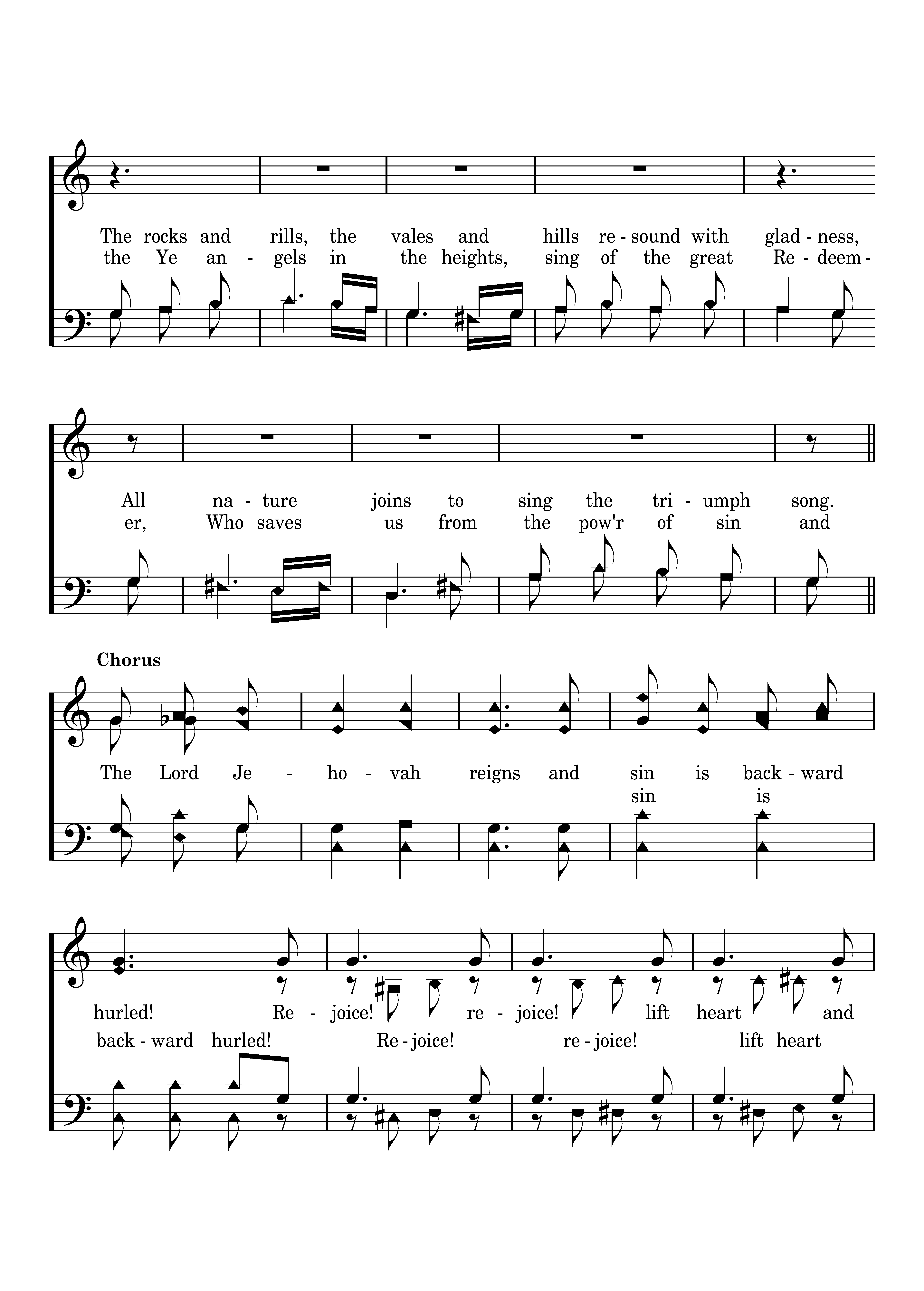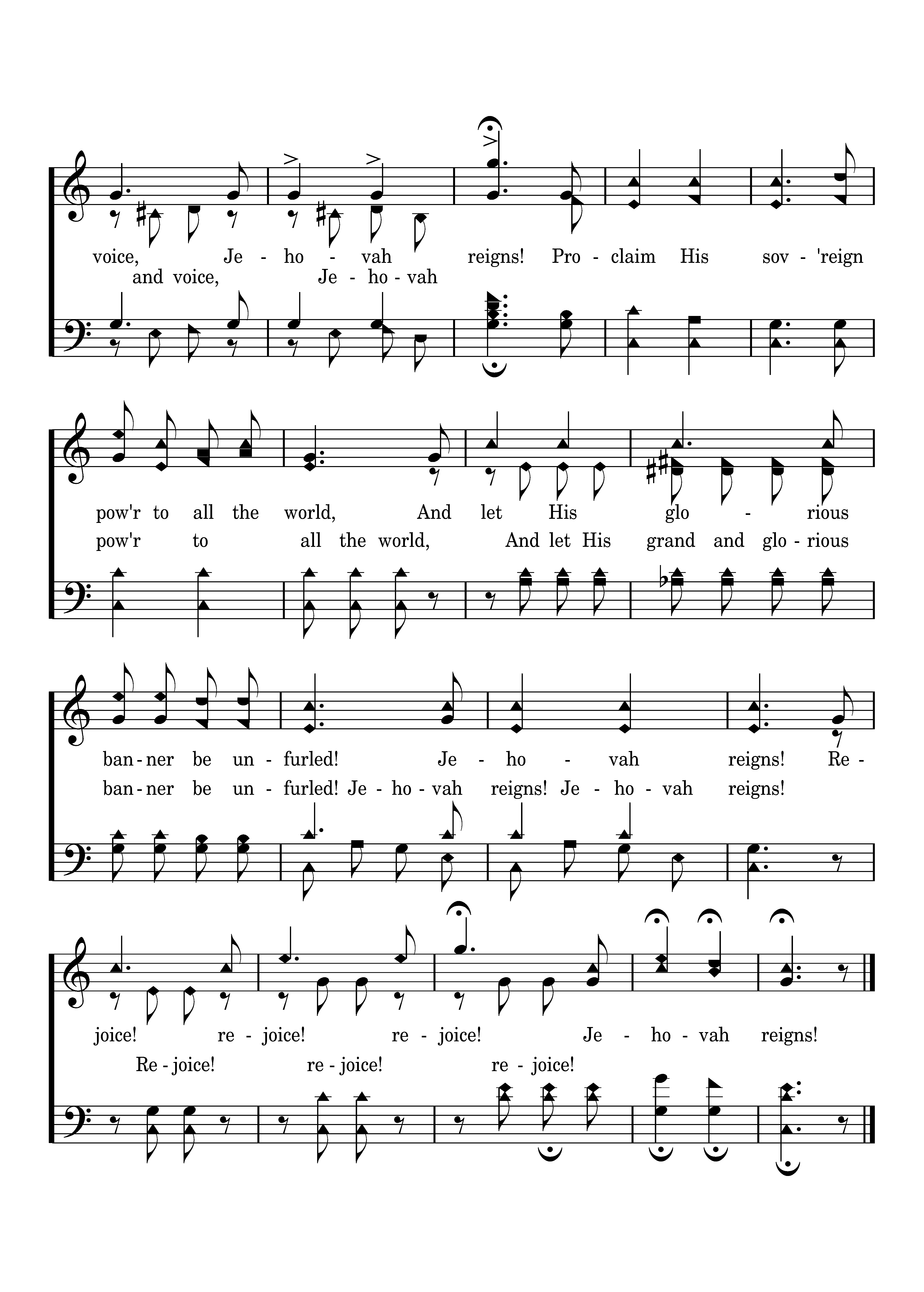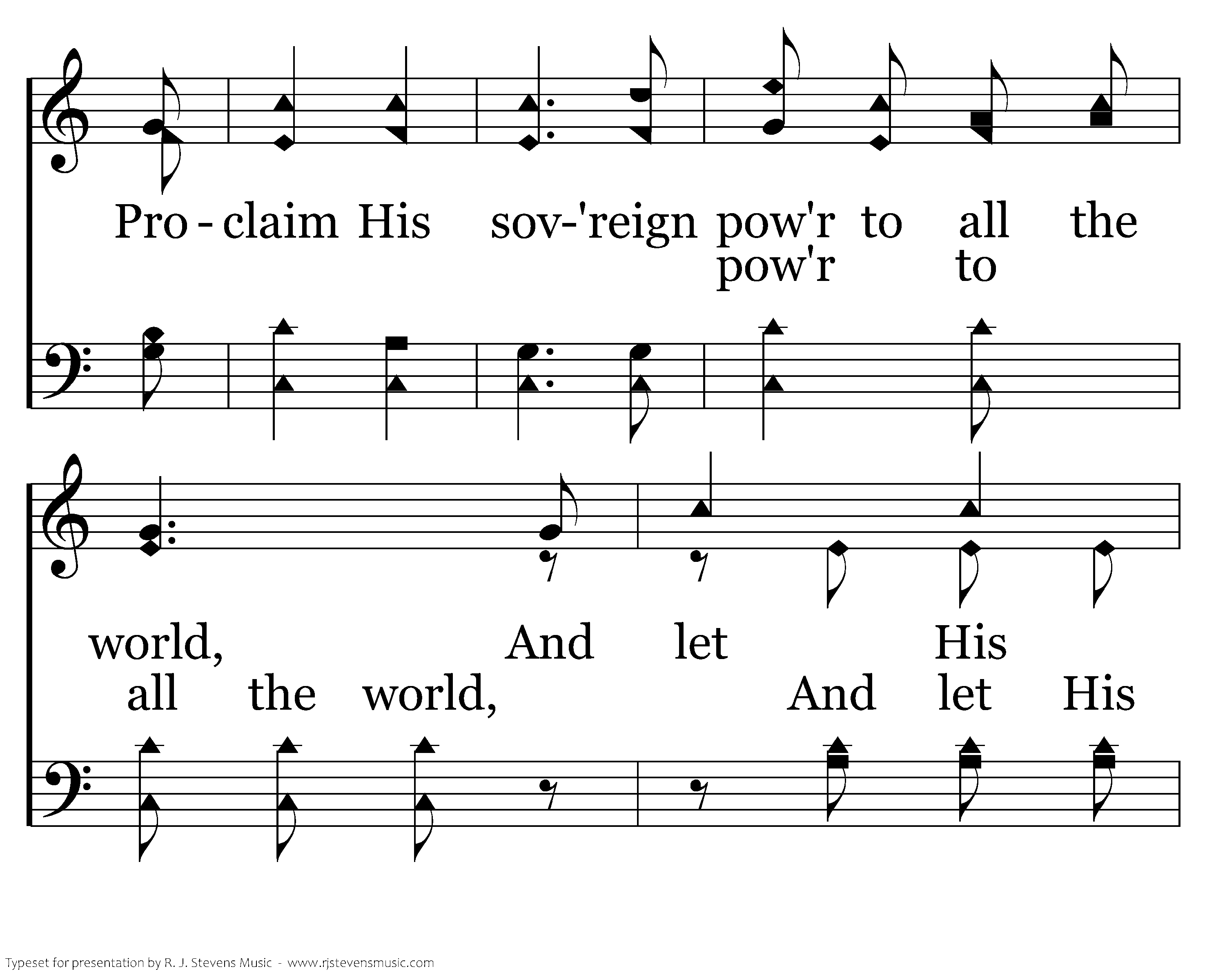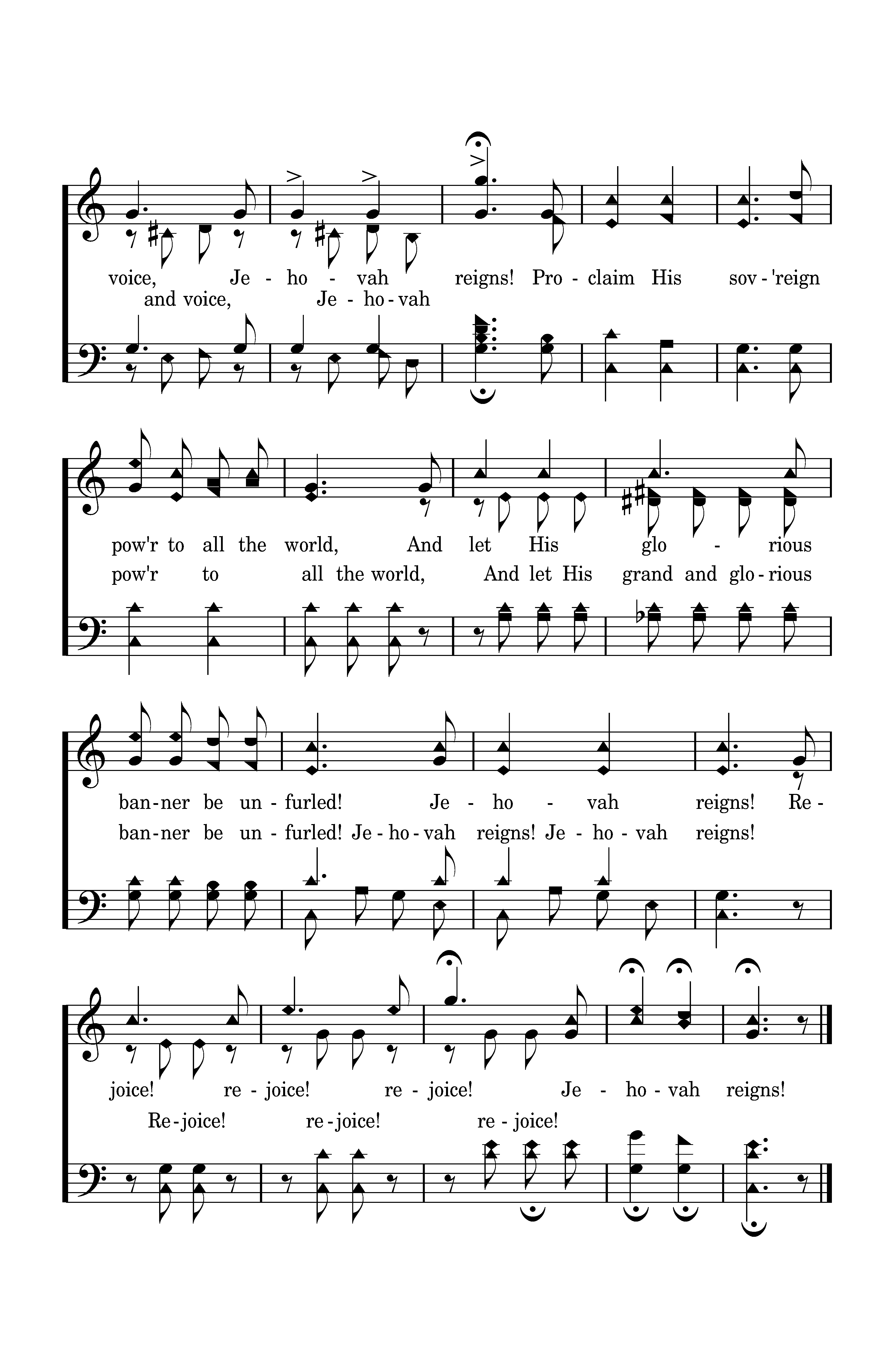 The Lord Jehovah reigns and sin is backward hurled! Rejoice! rejoice! lift heart and voice, Jehovah reigns! Proclaim His sov'reign pow'r to all the world, And let His glorious banner be unfurled! Jehovah reigns! Rejoice! rejoice! rejoice! Jehovah reigns! sin is backward hurled! Rejoice! rejoice! lift heart and voice, Jehovah pow'r to all the world, And let His grand and glorious banner be unfurled! Jehovah reigns! Jehovah reigns! Rejoice! rejoice! rejoice!