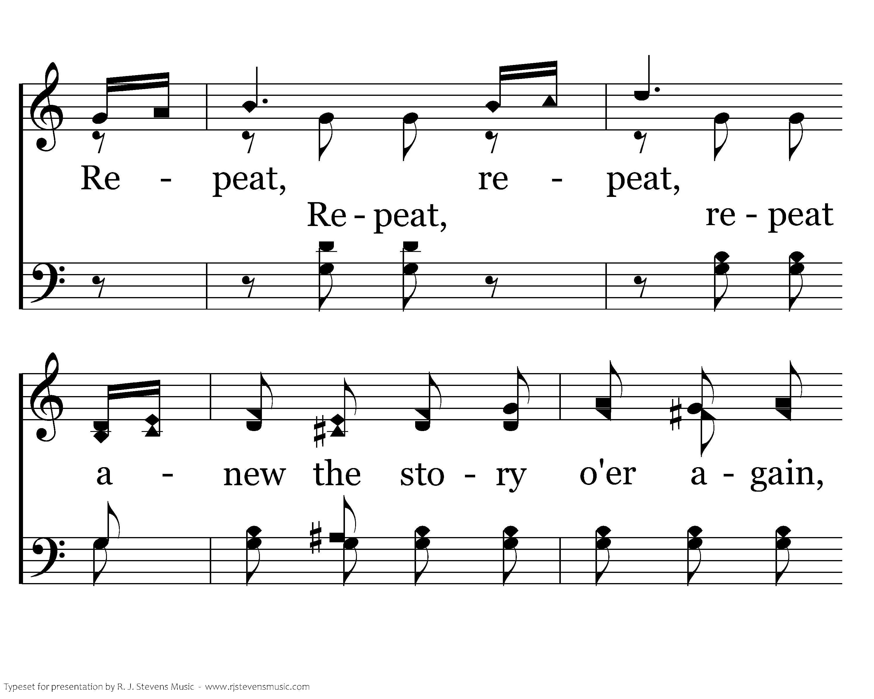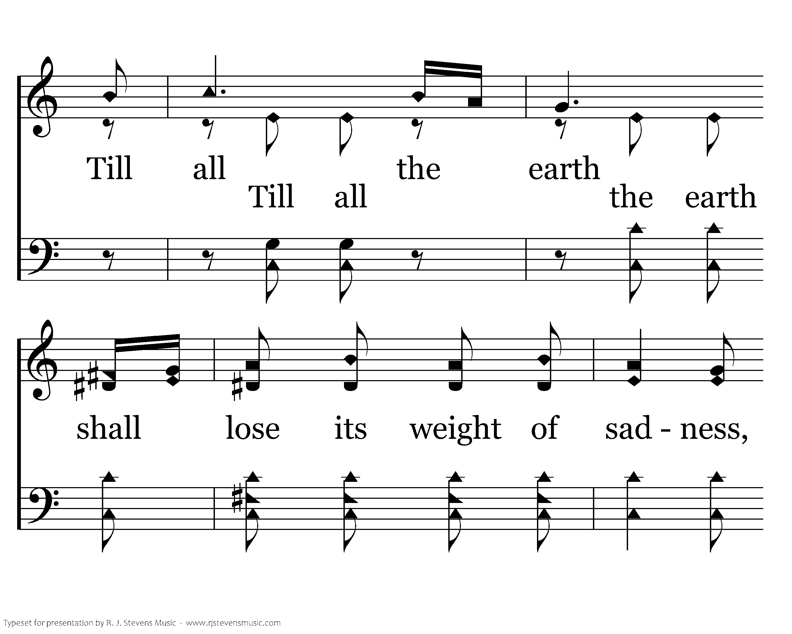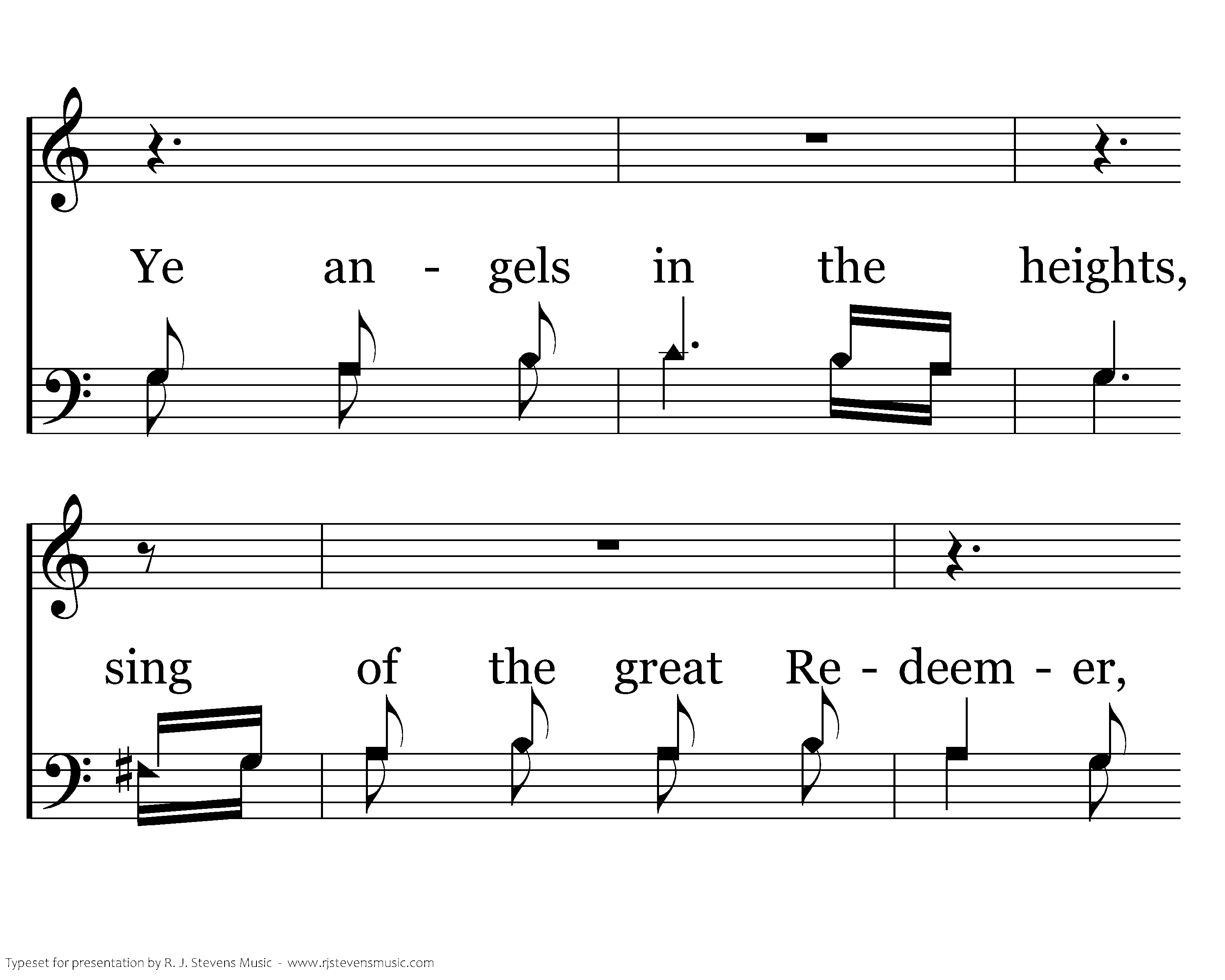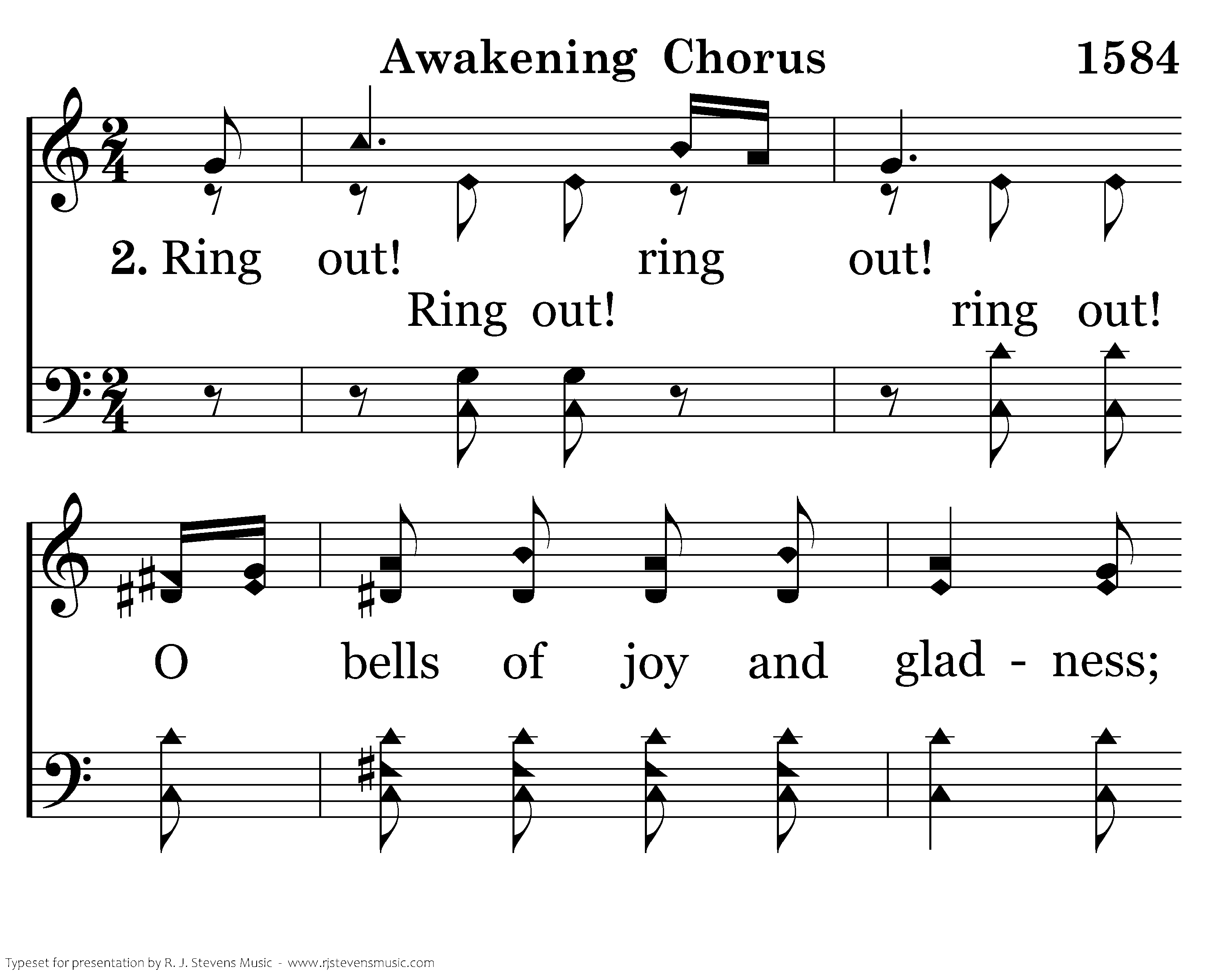 Ring out! ring out! O bells of joy and gladness; Repeat, repeat, anew the story o'er again, Till all the earth shall lose its weight of sadness, And shout anew the glorious refrain; Ye angels in the heights, sing of the great Redeemer, Who saves us from the pow'r of sin and death.