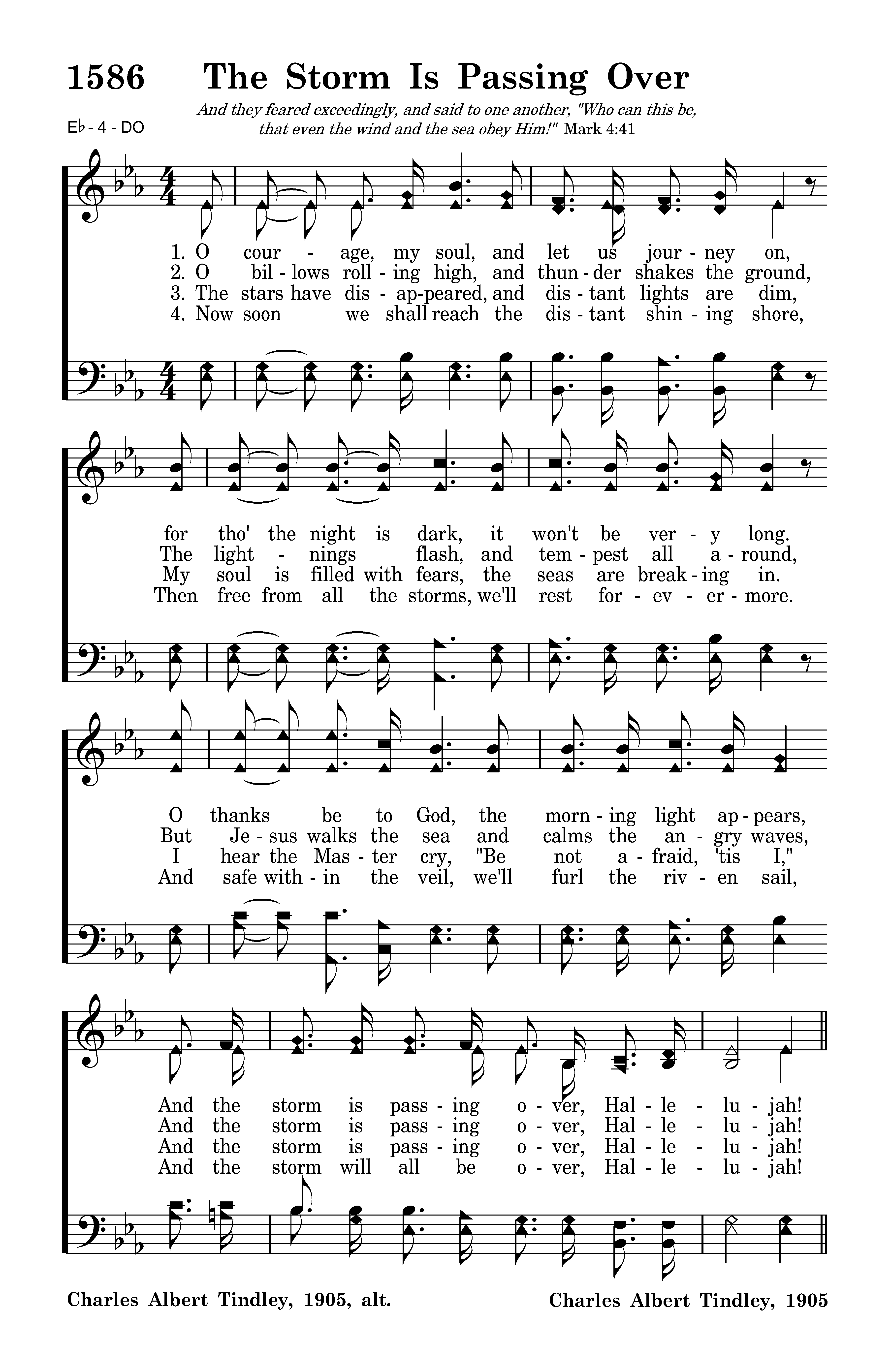 O courage, my soul, and let us journey on, for tho' the night is dark, it won't be very long. O thanks be to God, the morning light appears, And the storm is passing over, Hallelujah!