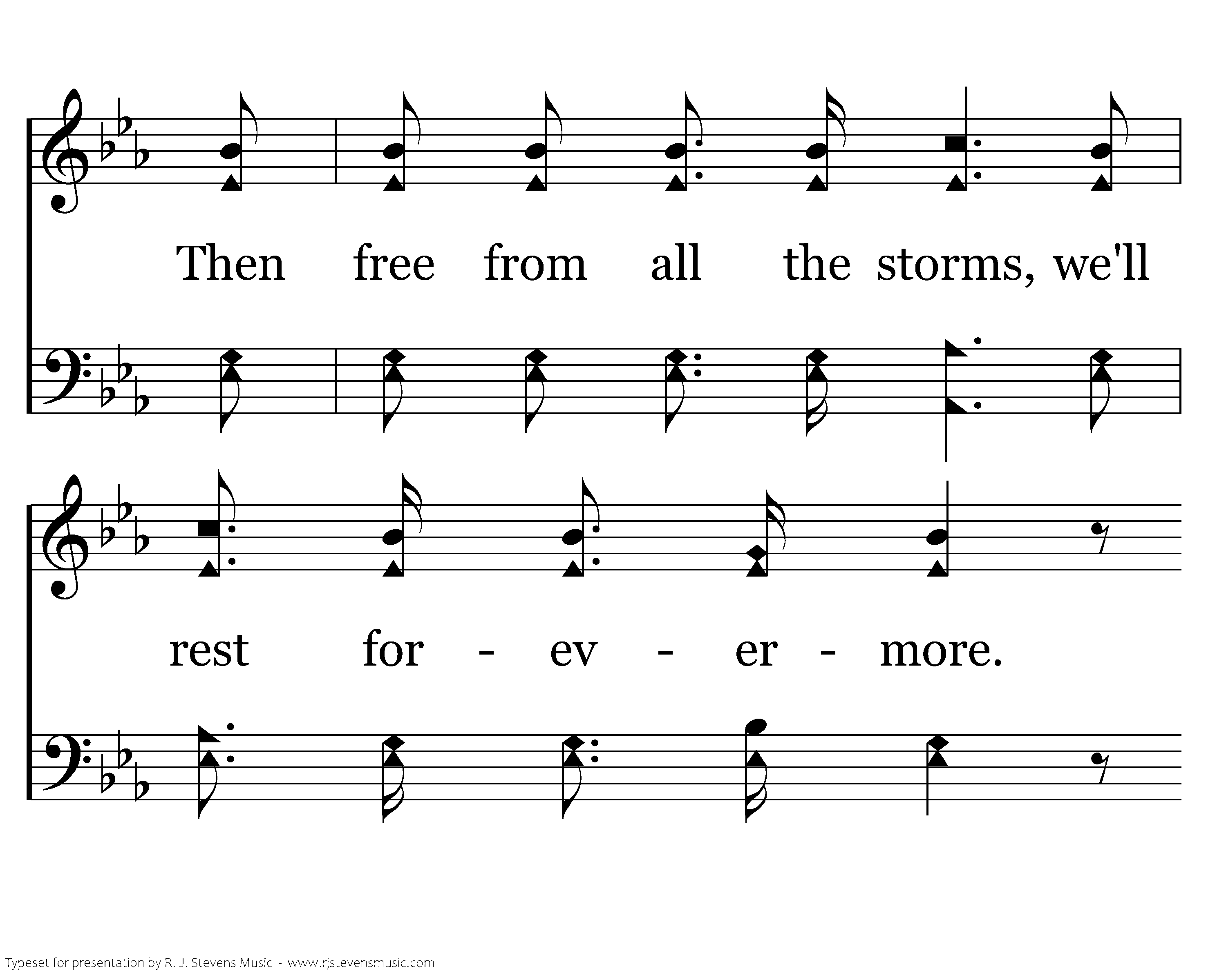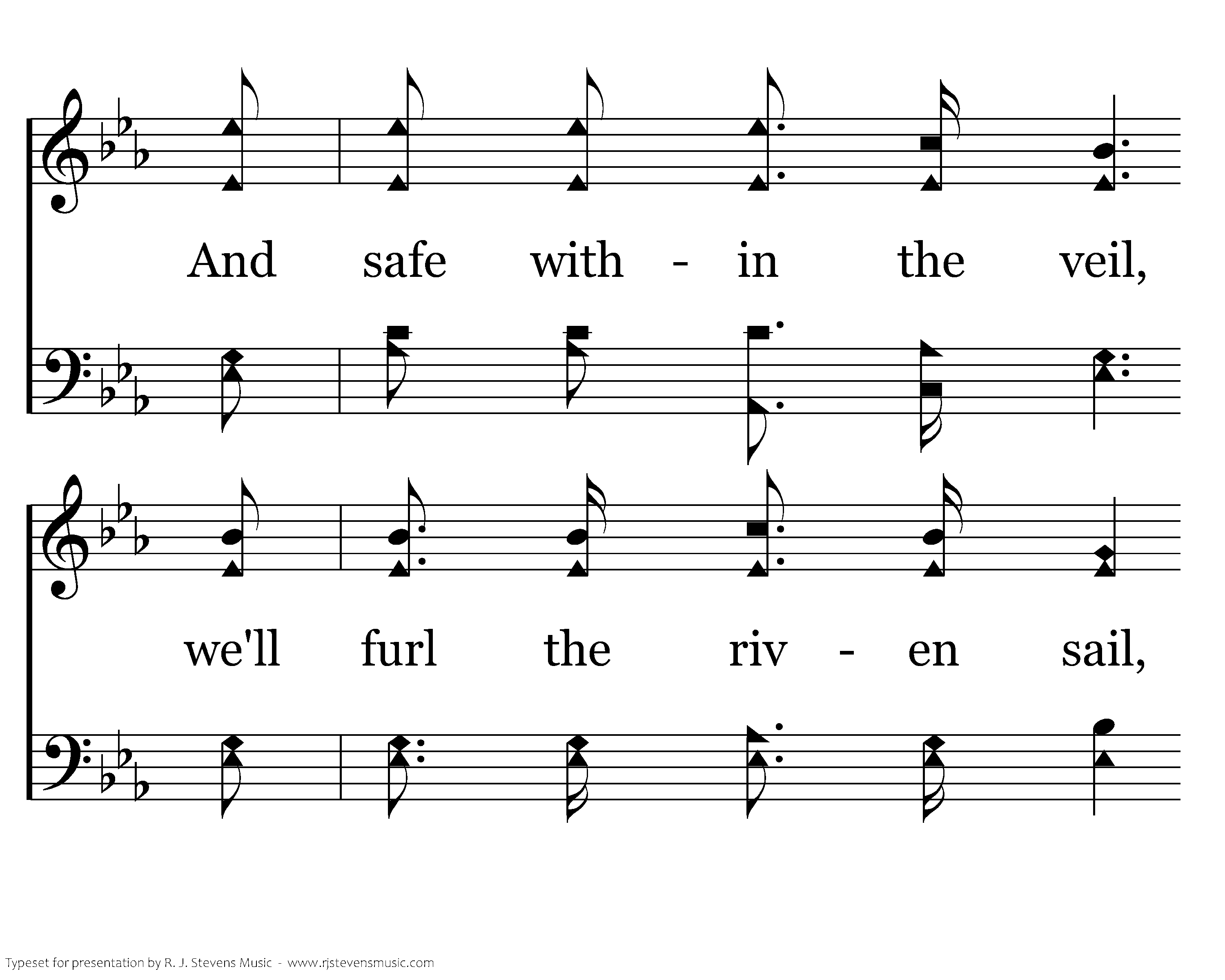Now soon we shall reach the distant shining shore, Then free from all the storms, we'll rest forevermore. And safe within the veil, we'll furl the riven sail, And the storm will all be over, Hallelujah!