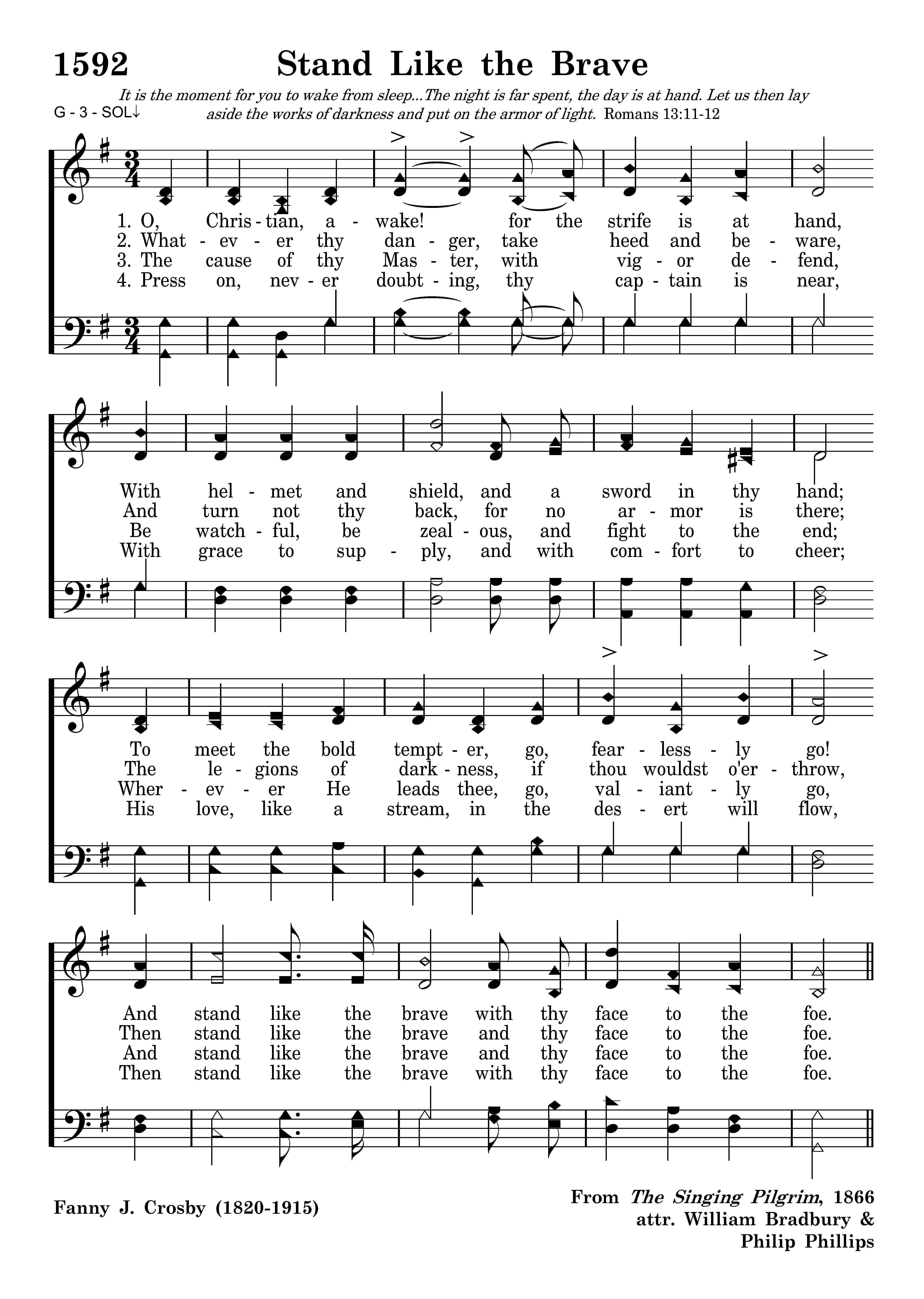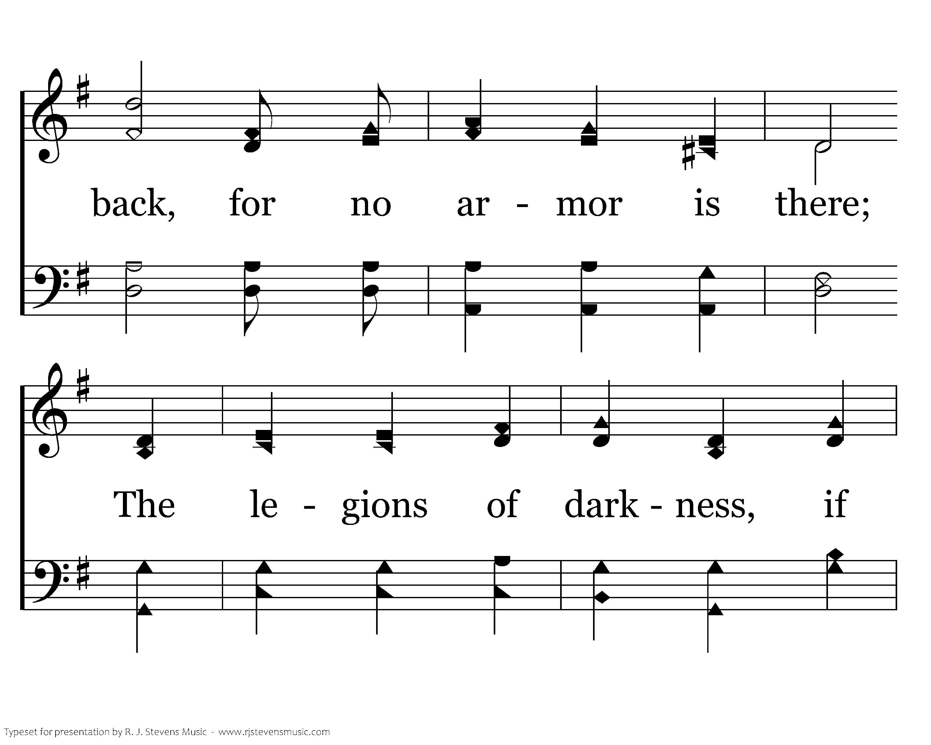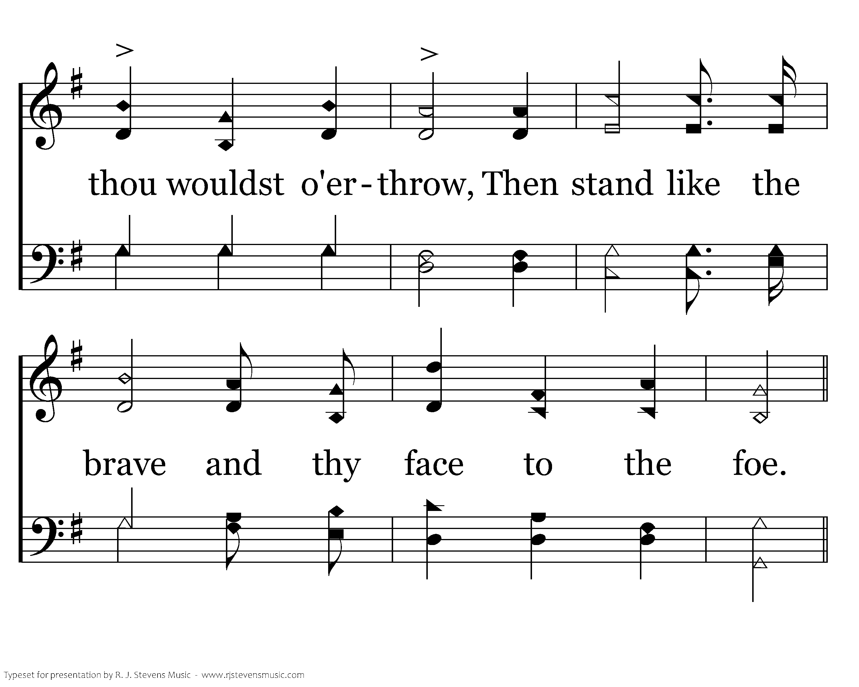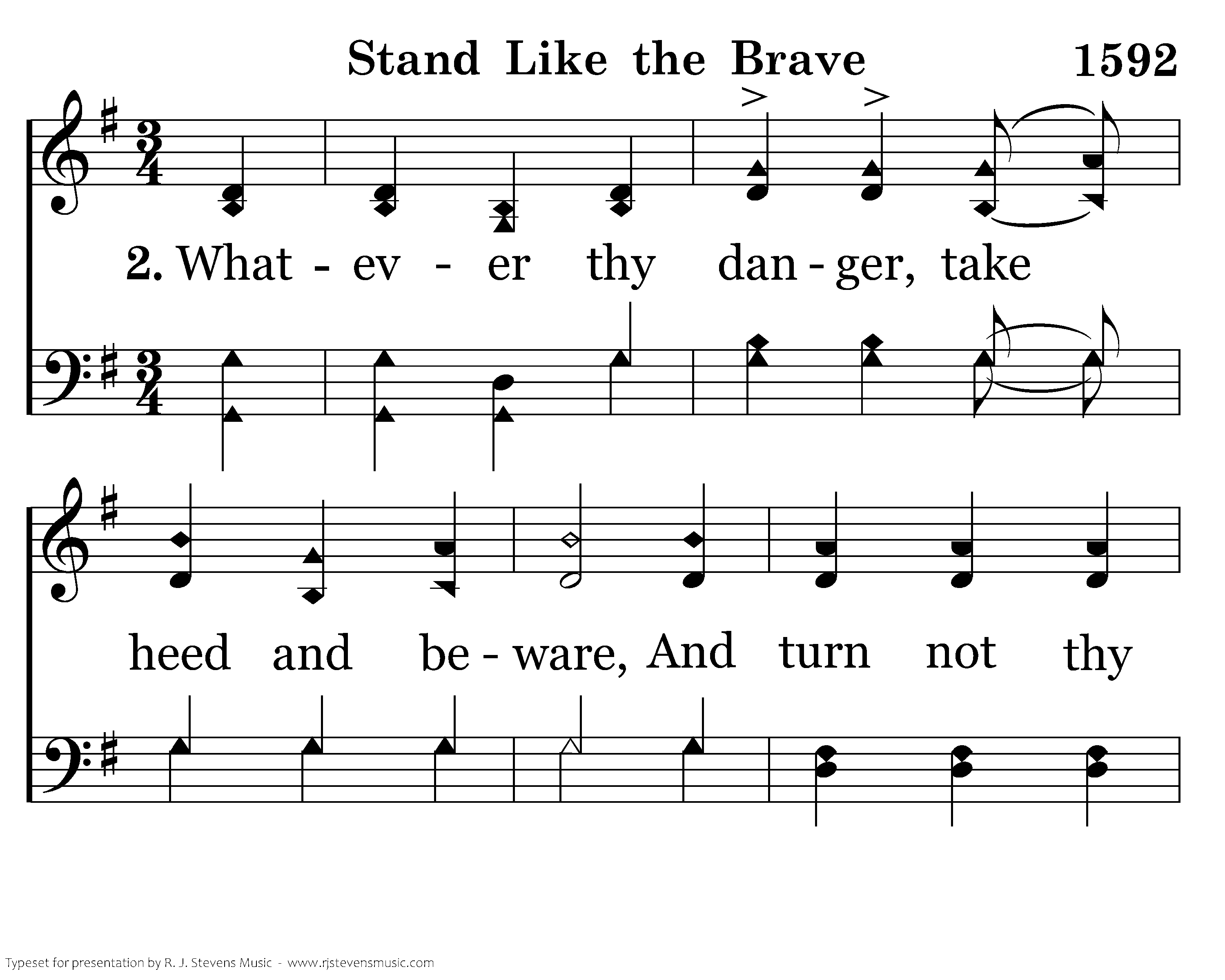 Whatever thy danger, take heed and beware, And turn not thy back, for no armor is there; The legions of darkness, if thou wouldst o'erthrow, Then stand like the brave and thy face to the foe.