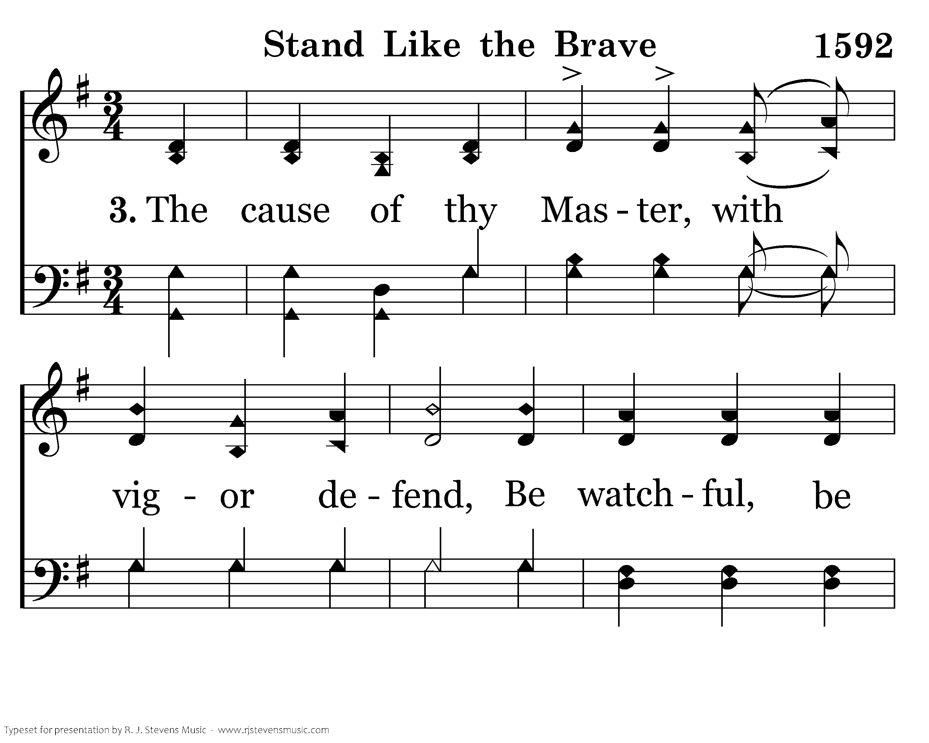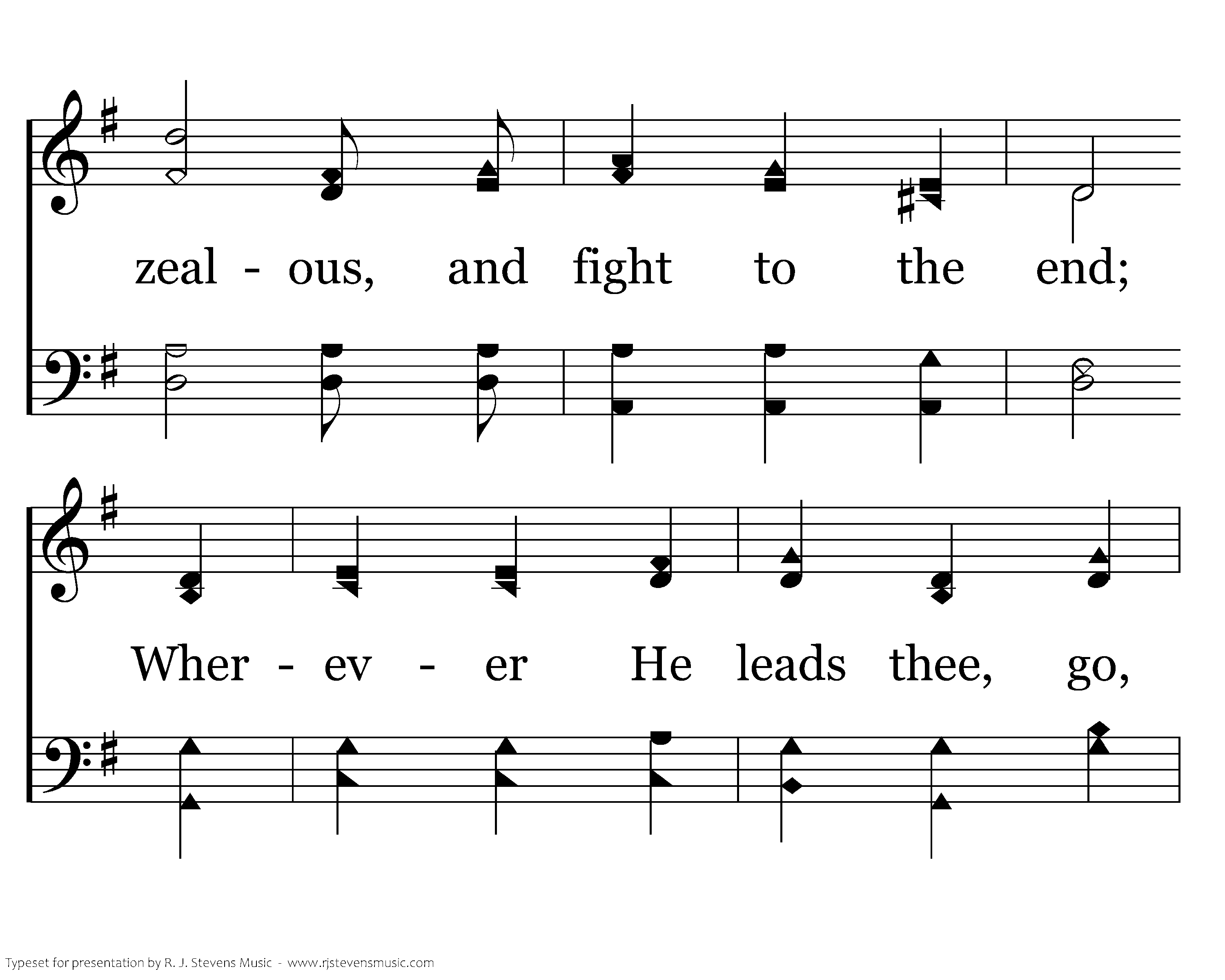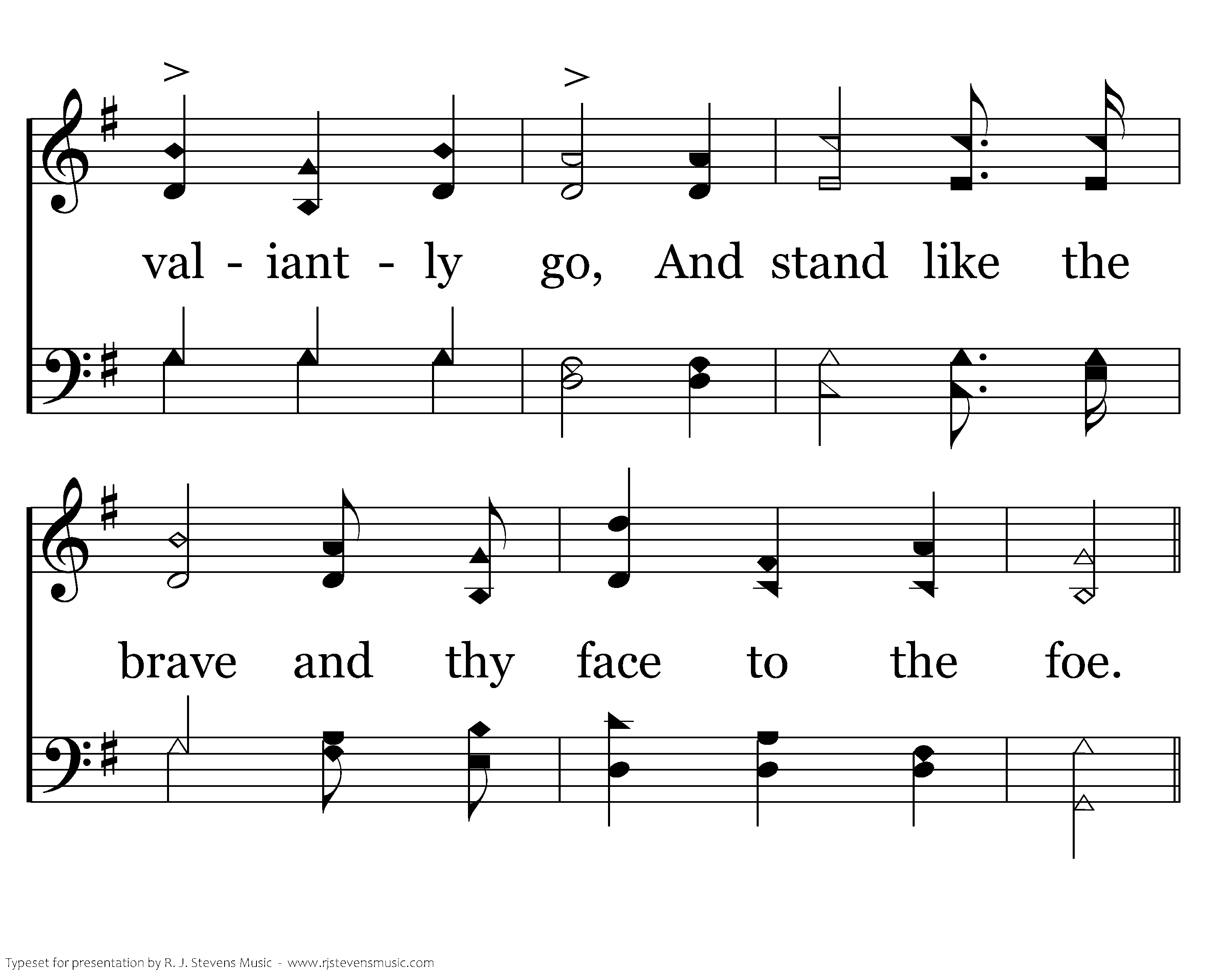The cause of thy Master, with vigor defend, Be watchful, be zealous, and fight to the end; Wherever He leads thee, go, valiantly go, And stand like the brave and thy face to the foe.