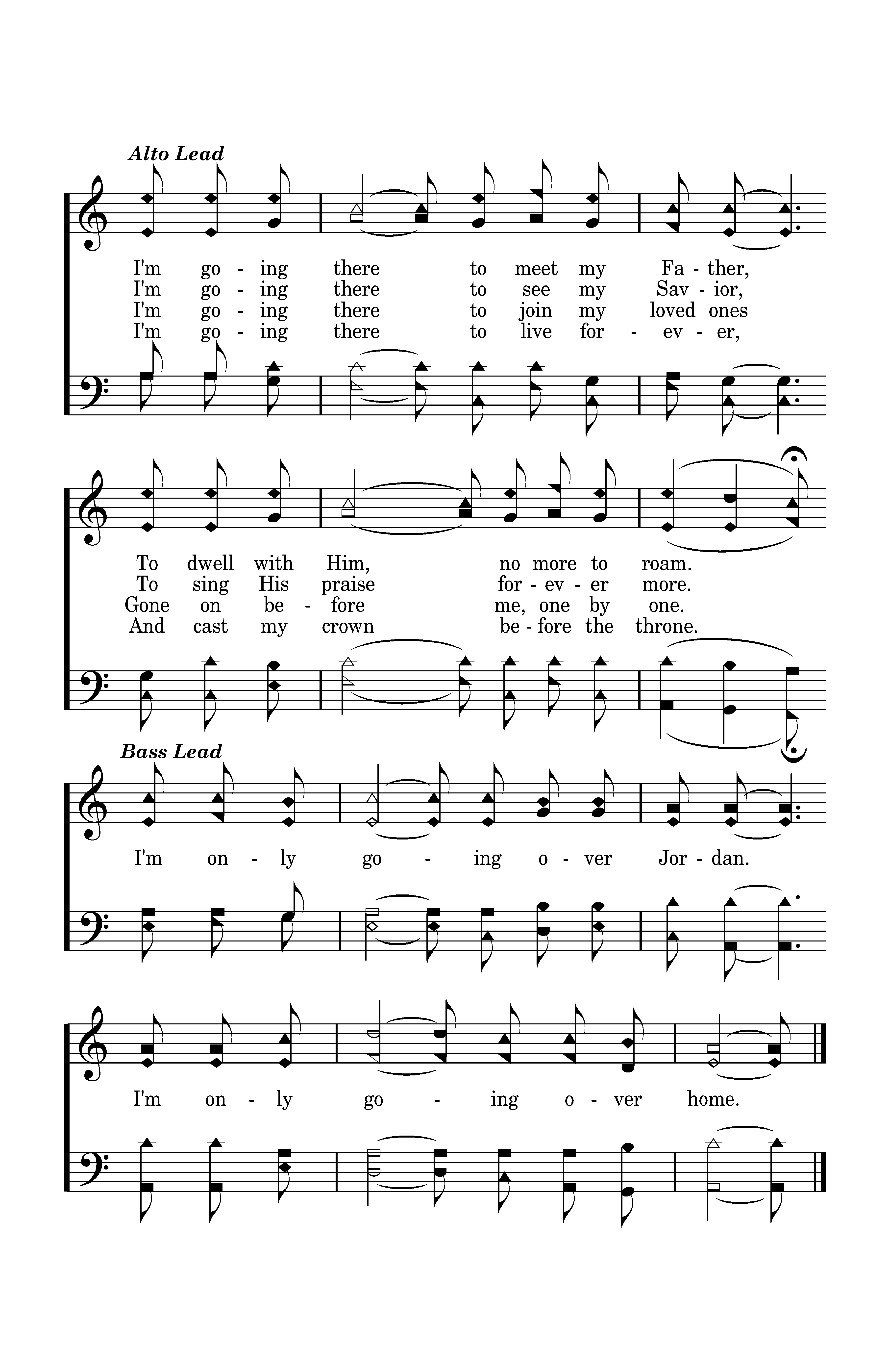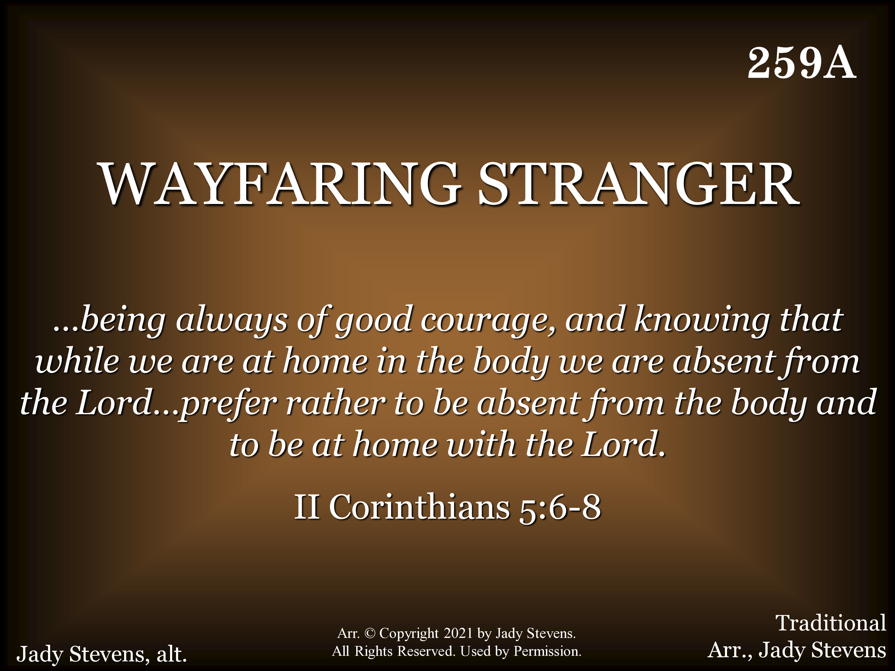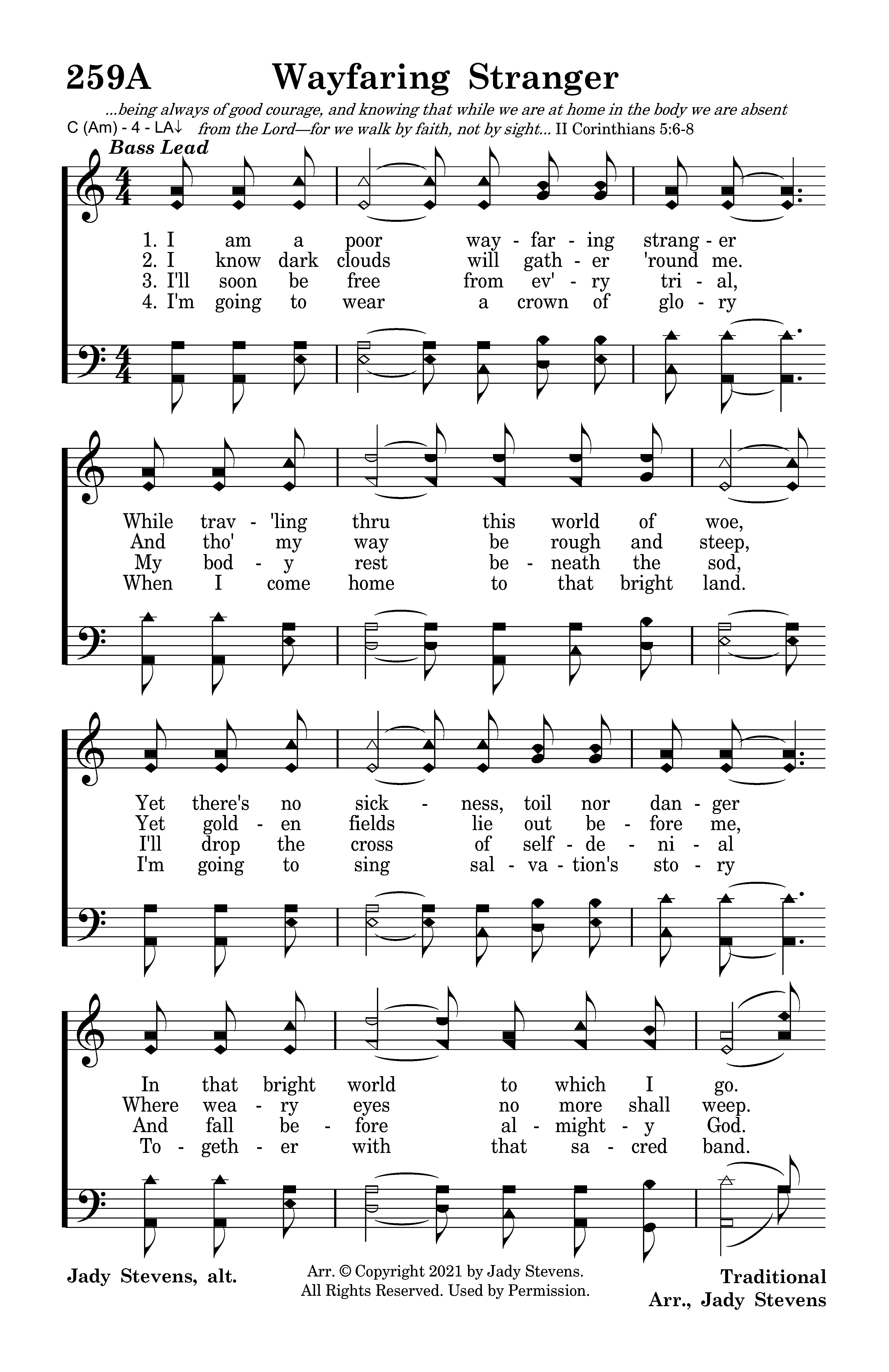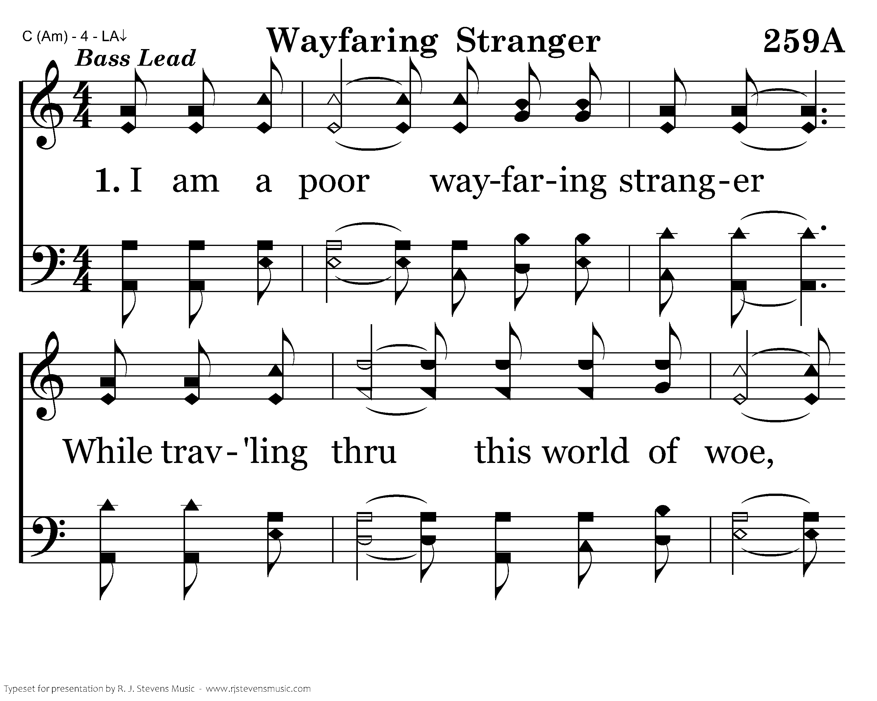 I am a poor wayfaring stranger While trav'ling thru this world of woe, Yet there's no sickness, toil nor danger In that bright world to which I go. I'm going there to meet my Father, To dwell with Him, no more to roam. I'm only going over Jordan. I'm only going over home.