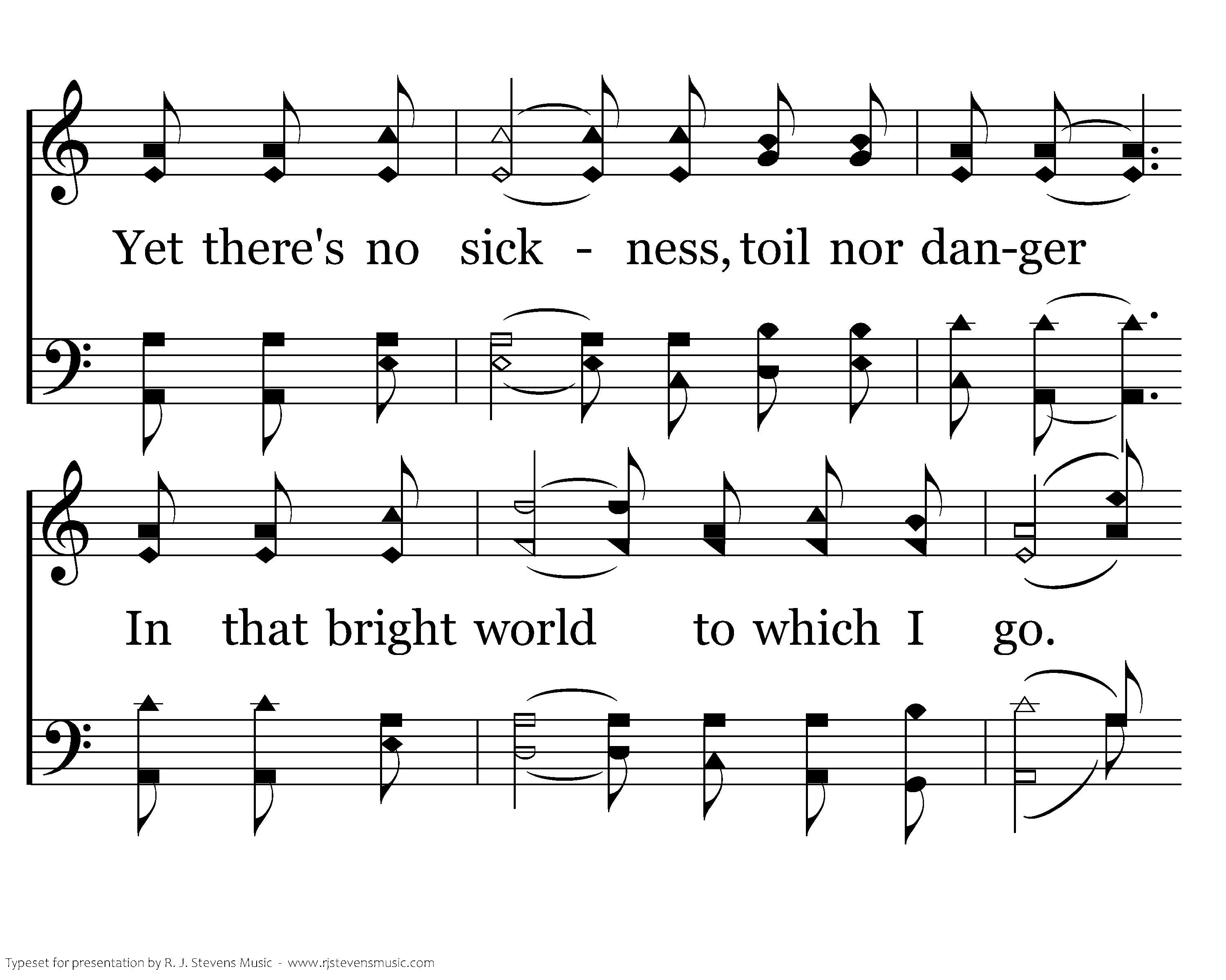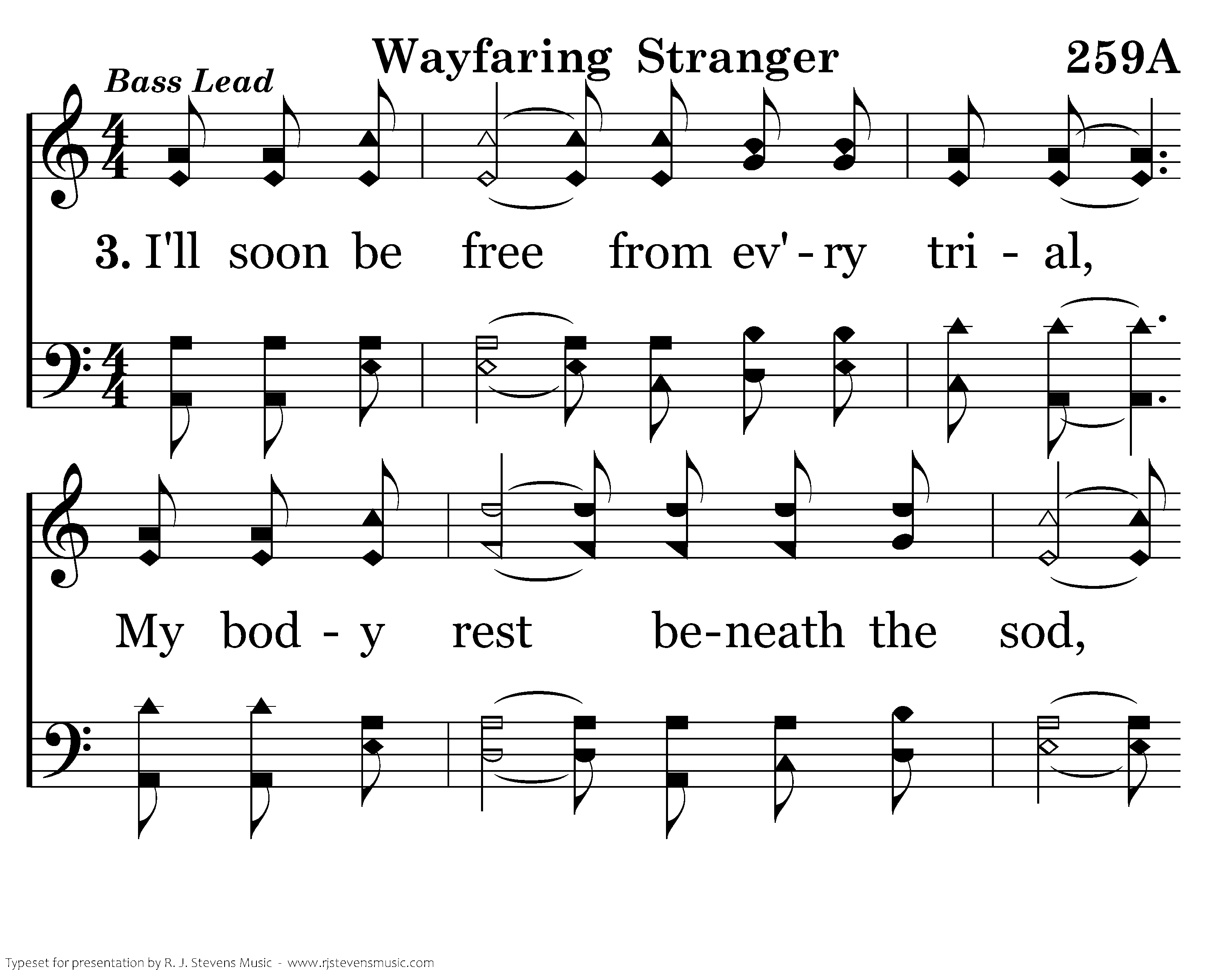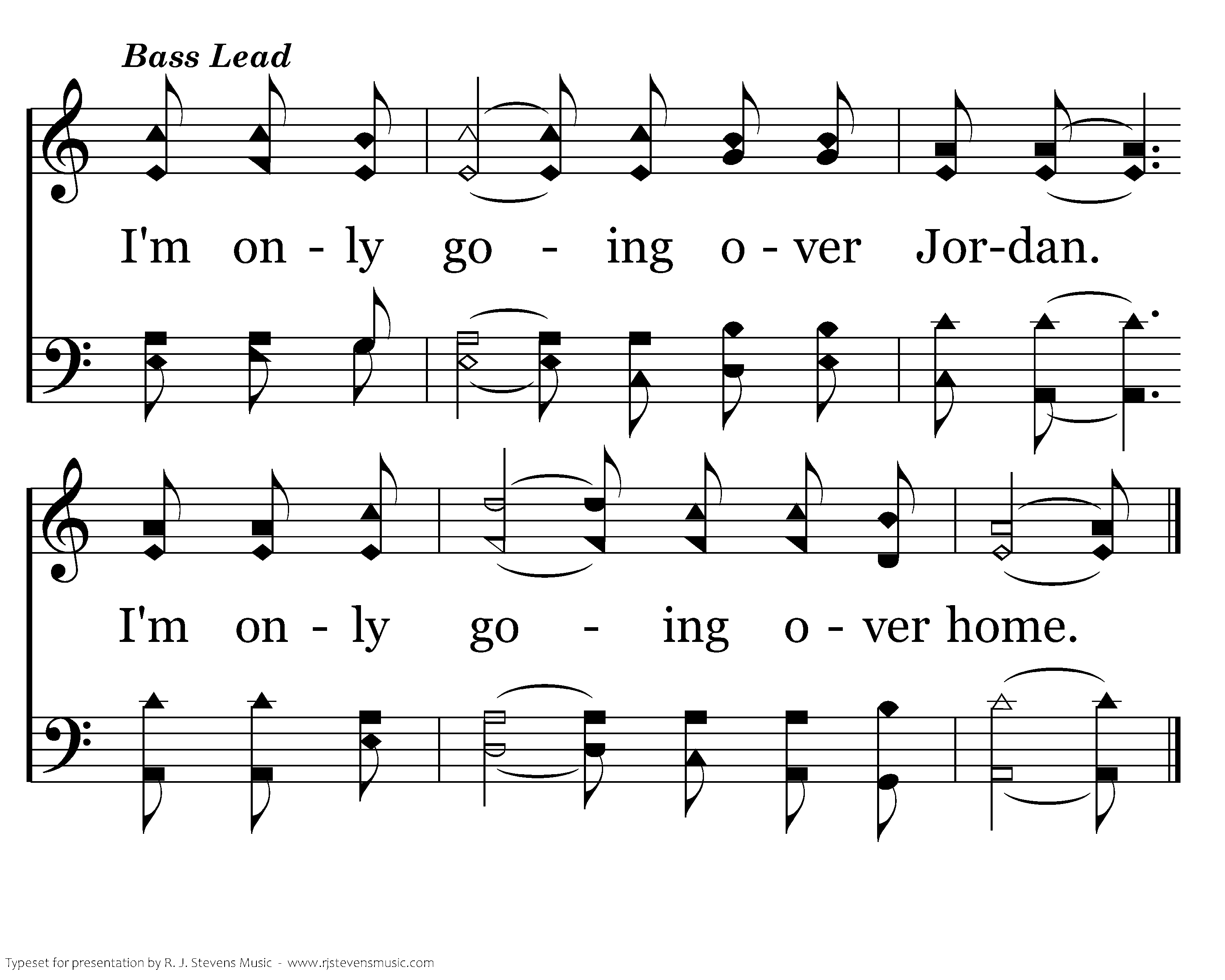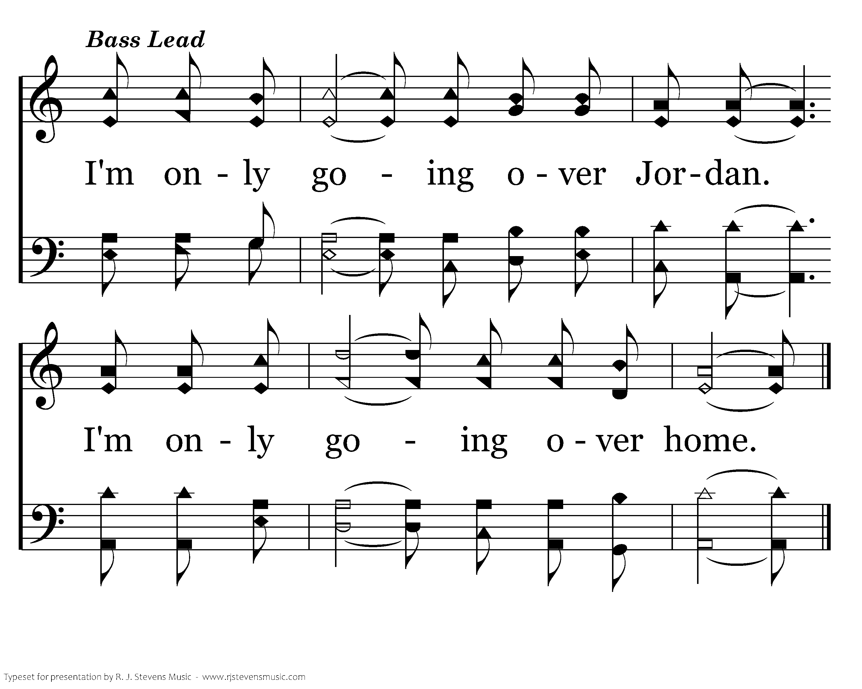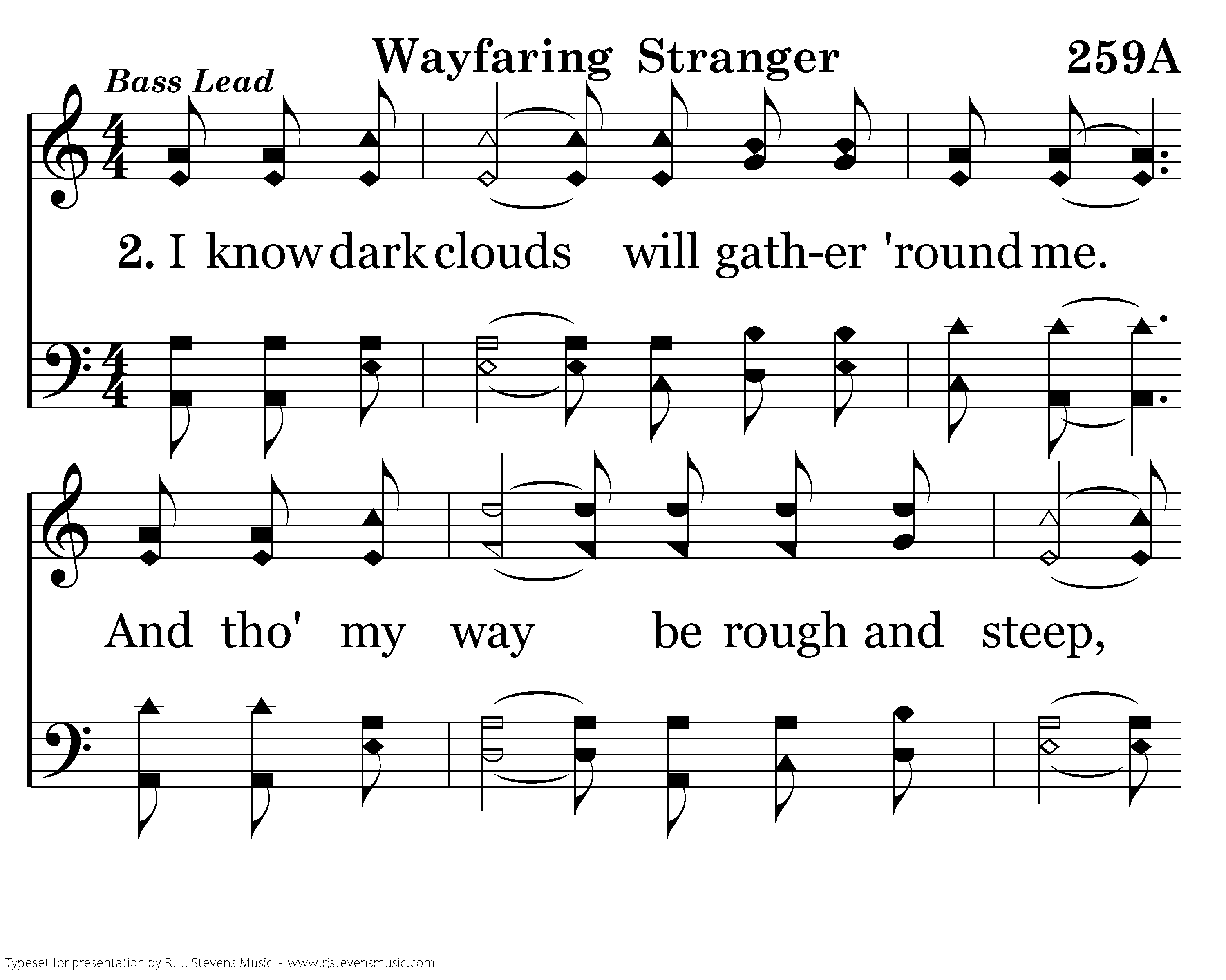 I am a poor wayfaring stranger While trav'ling thru this world of woe, Yet there's no sickness, toil nor danger In that bright world to which I go. I'm going there to meet my Father, To dwell with Him, no more to roam. I'm only going over Jordan. I'm only going over home.