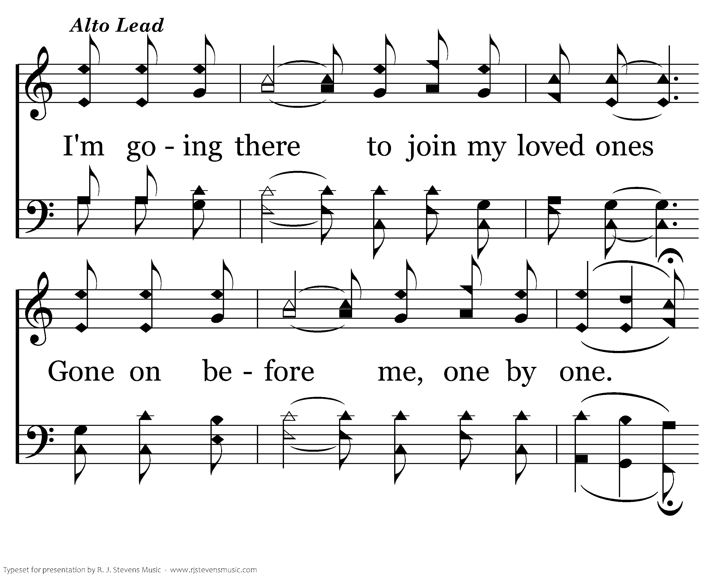 I'll soon be free from ev'ry trial, My body rest beneath the sod, I'll drop the cross of selfdenial And fall before almighty God. I'm going there to join my loved ones Gone on before me, one by one.