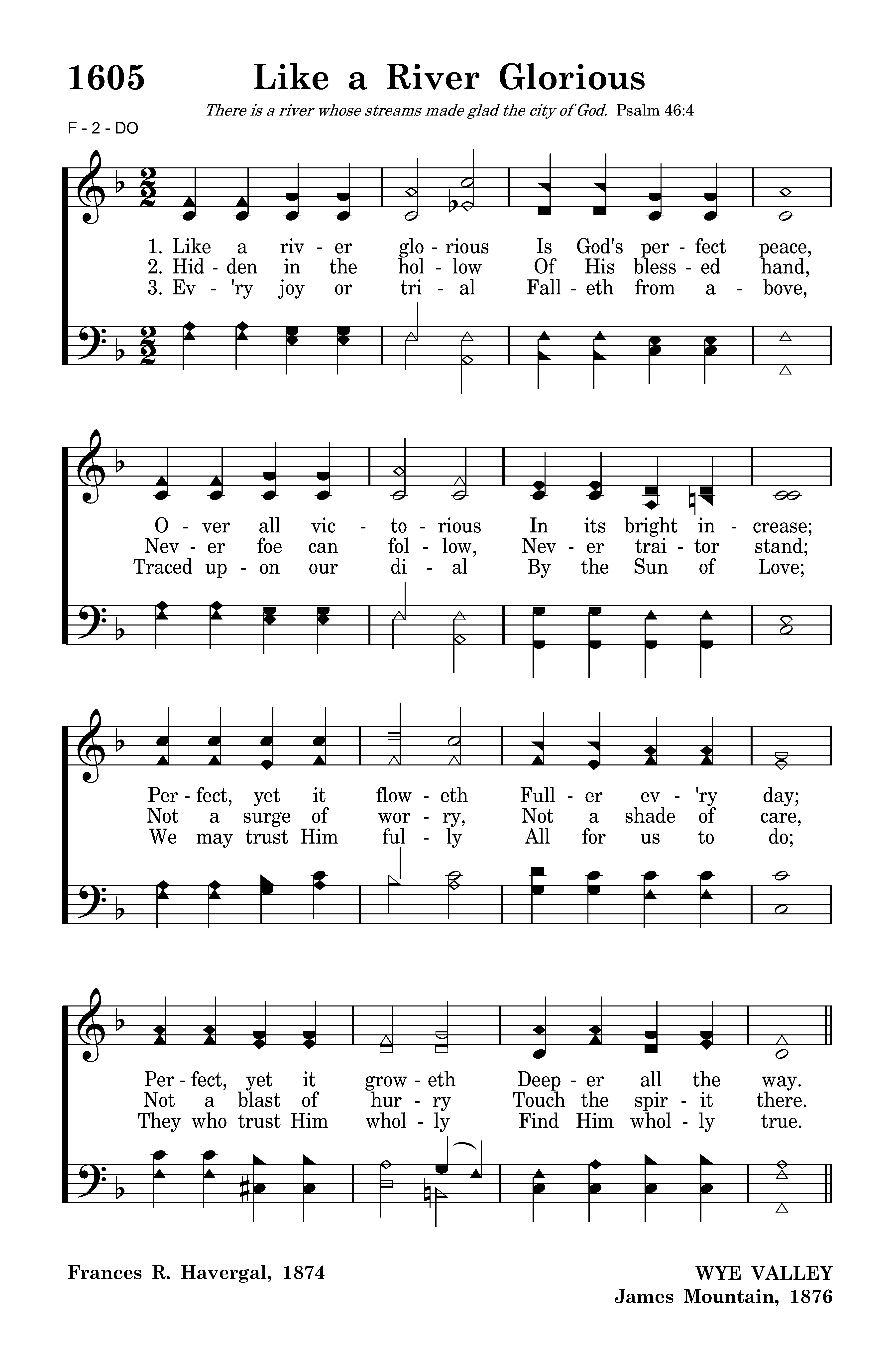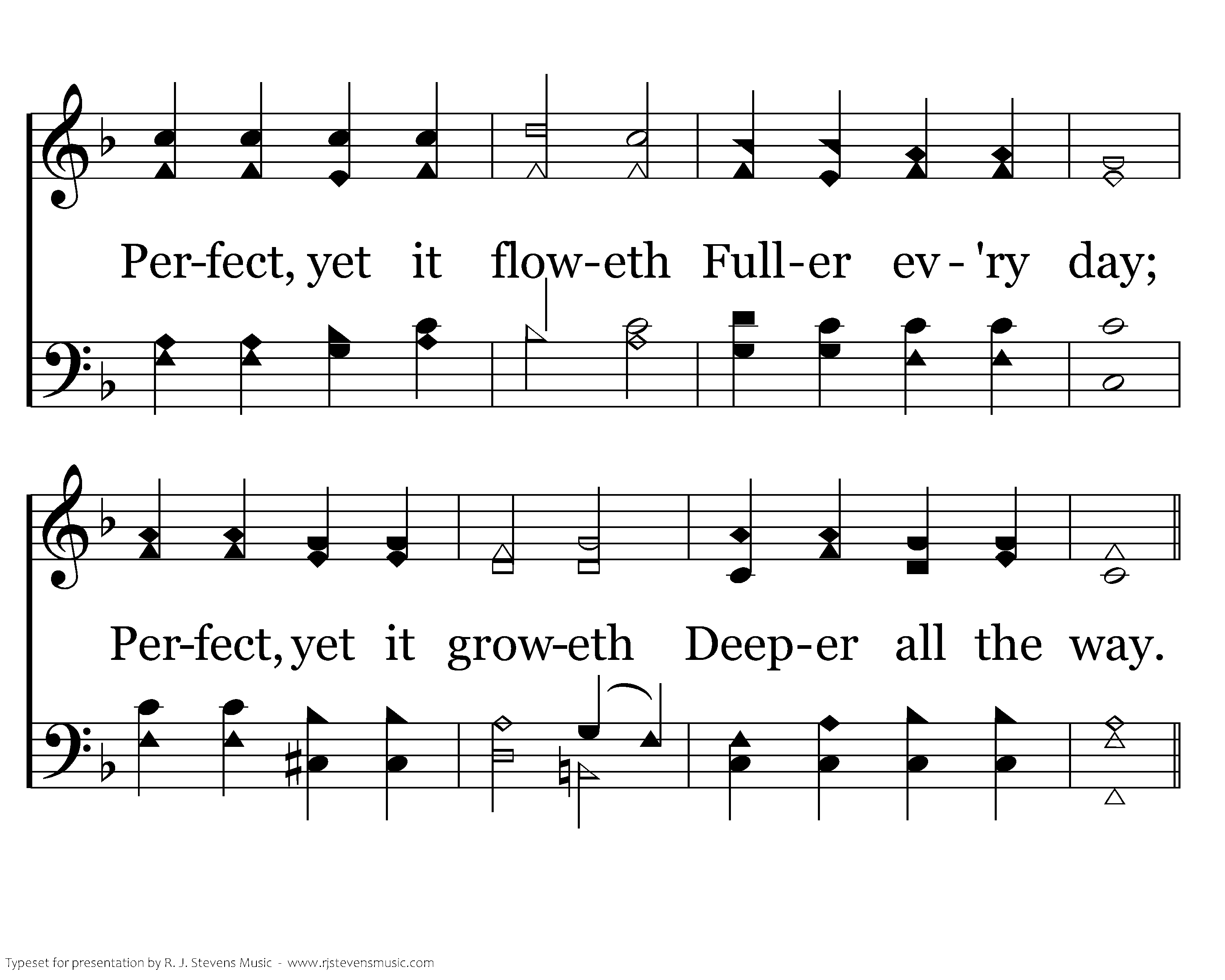 Like a river glorious Is God's perfect peace, Over all victorious In its bright increase; Perfect, yet it floweth Fuller ev'ry day; Perfect, yet it groweth Deeper all the way.