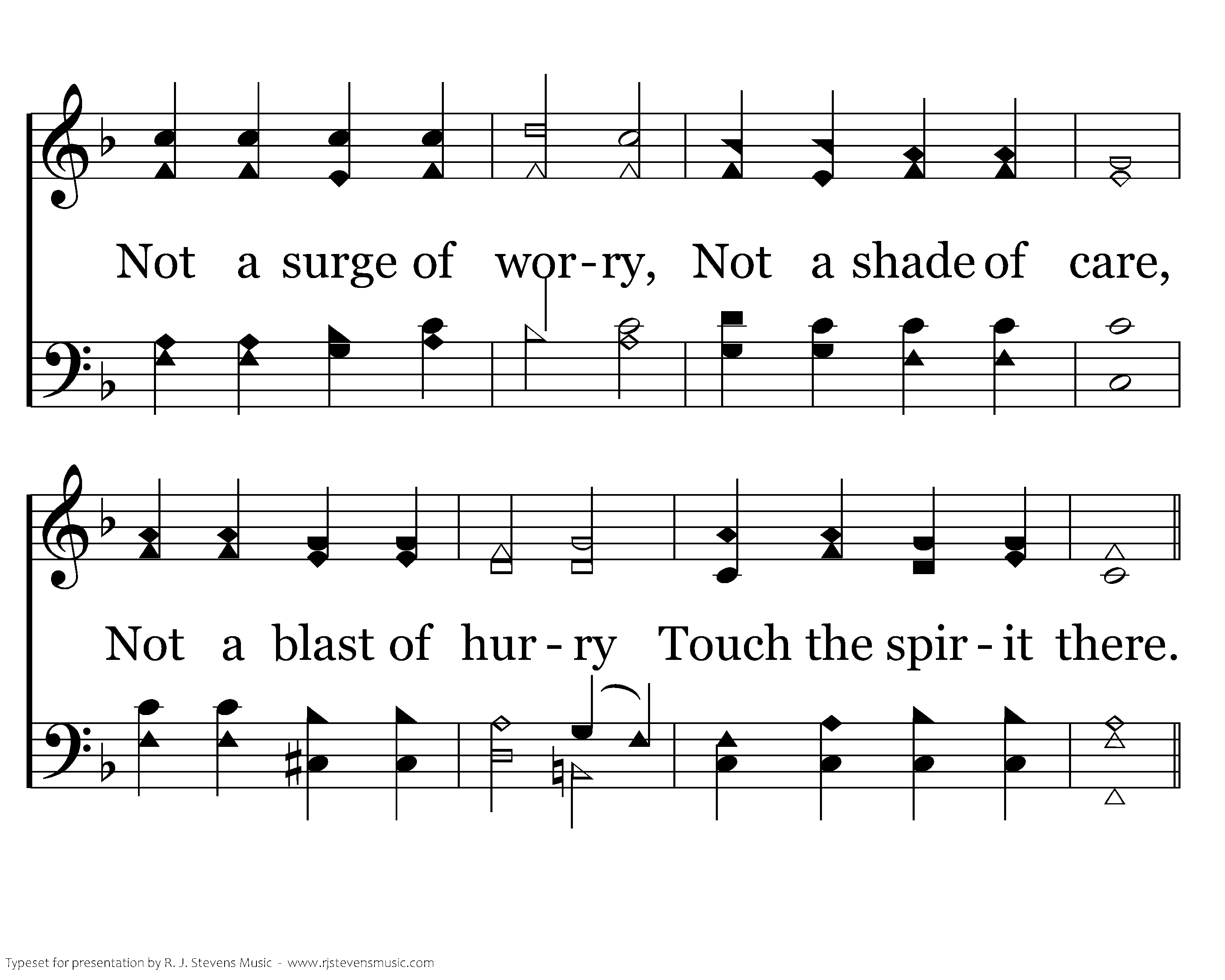 Hidden in the hollow Of His blessed hand, Never foe can follow, Never traitor stand; Not a surge of worry, Not a shade of care, Not a blast of hurry Touch the spirit there.