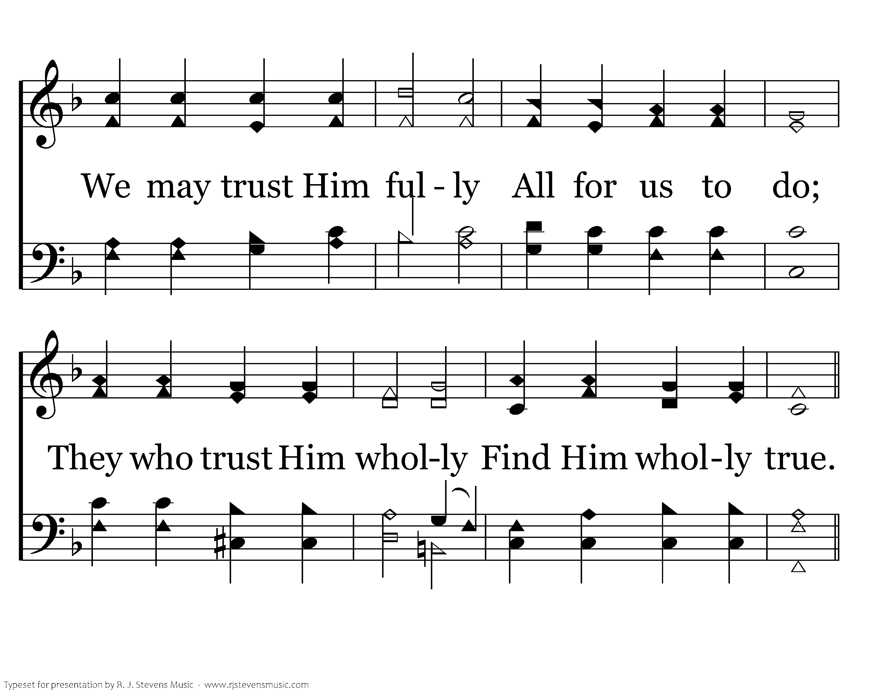Ev'ry joy or trial Falleth from above, Traced upon our dial By the Sun of Love; We may trust Him fully All for us to do; They who trust Him wholly Find Him wholly true.