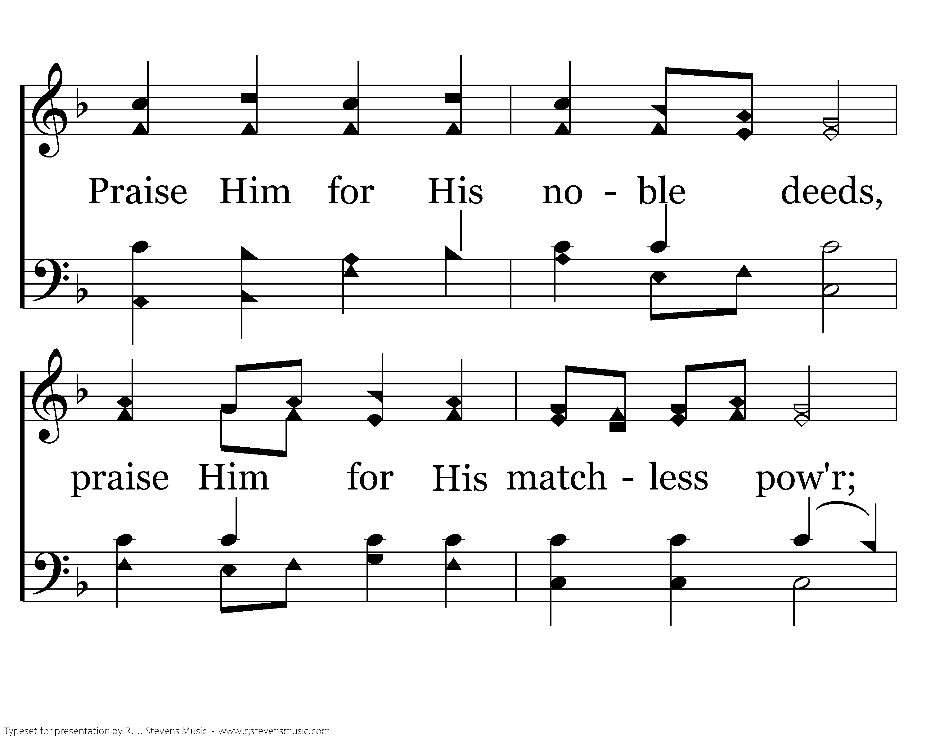 Praise the Lord who reigns above and keeps His court below; Praise the holy God of love, and all His greatness show; Praise Him for His noble deeds, praise Him for His matchless pow'r; Him from whom all good proceeds let earth and heav'n adore.