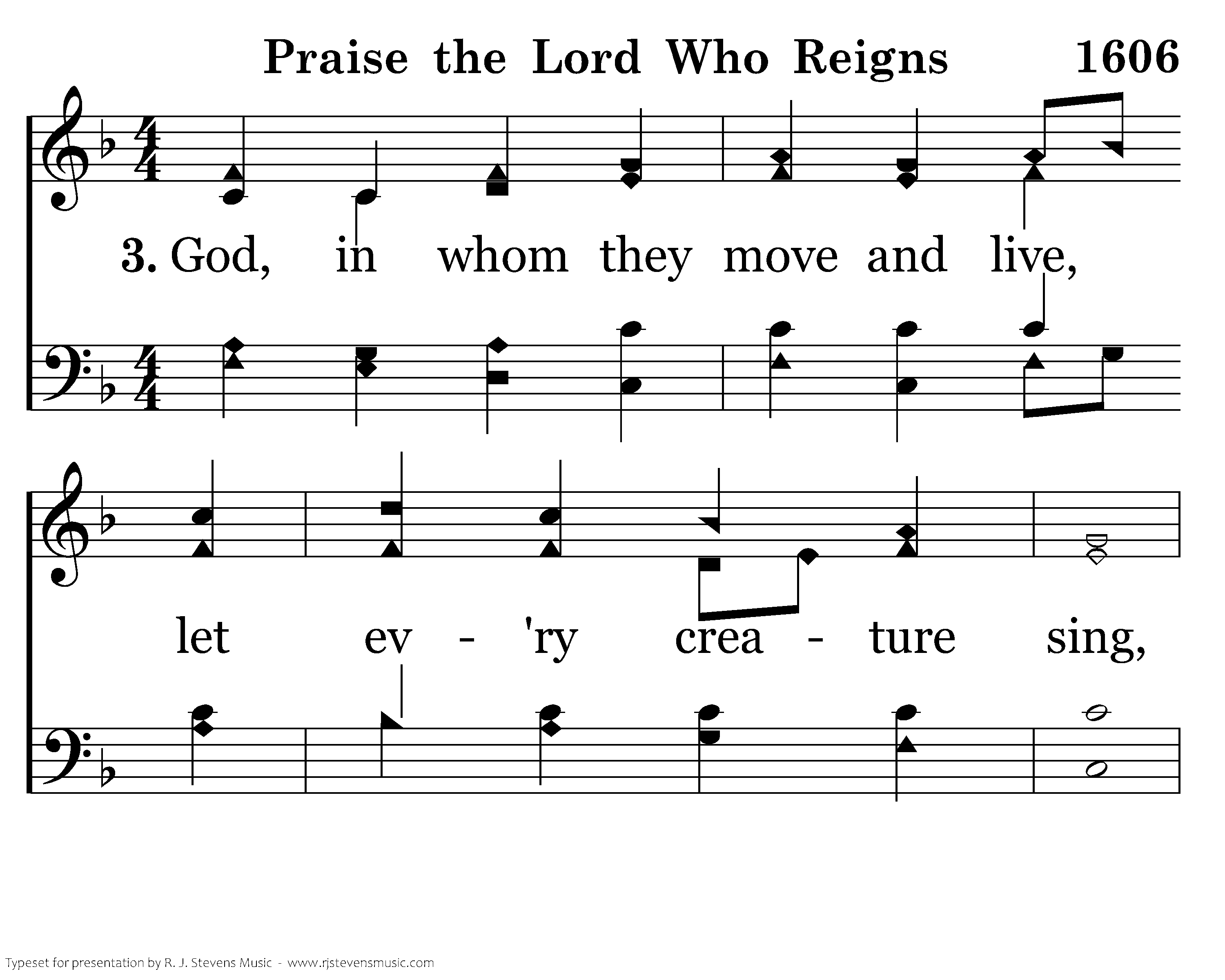 God, in whom they move and live, let ev'ry creature sing, Glory to their Maker give, and homage to their King. Hallowed be His name beneath, as in heav'n on earth adored; Praise the Lord in ev'ry breath, let all things praise the Lord.