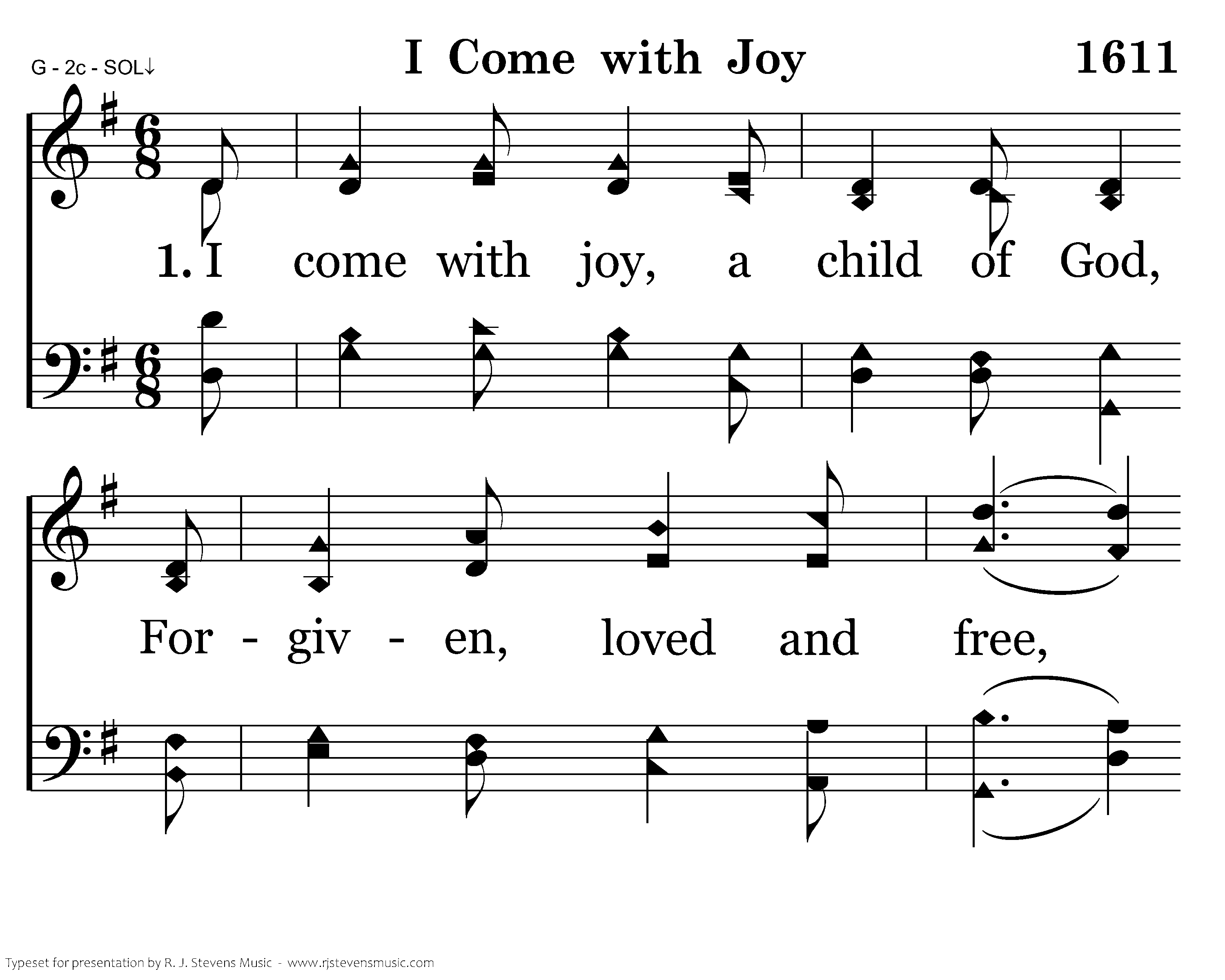 I come with joy, a child of God, Forgiven, loved and free, The life of Jesus to recall In love laid down for me, In love laid down for me.