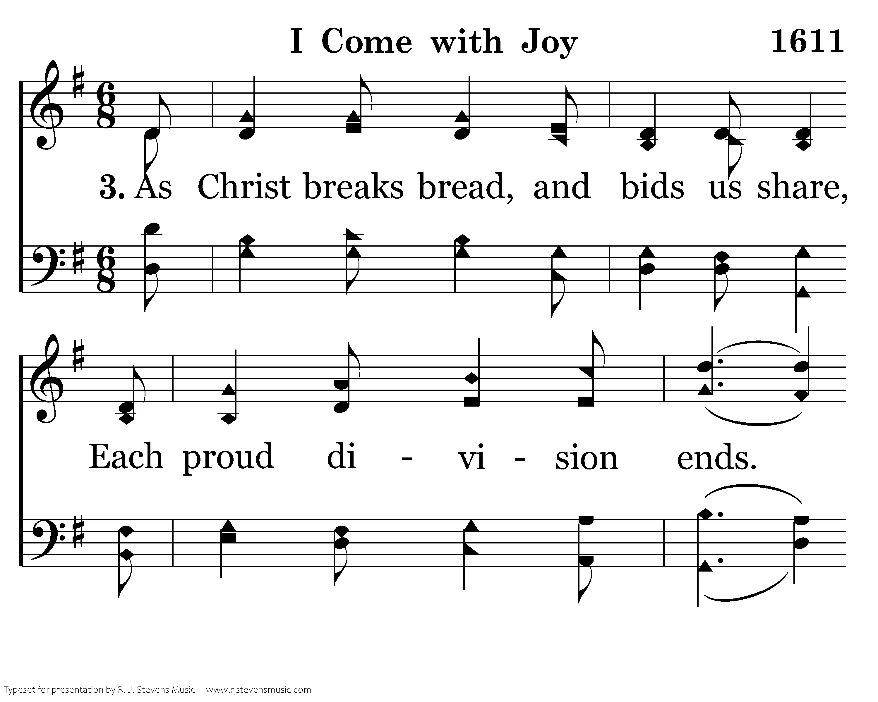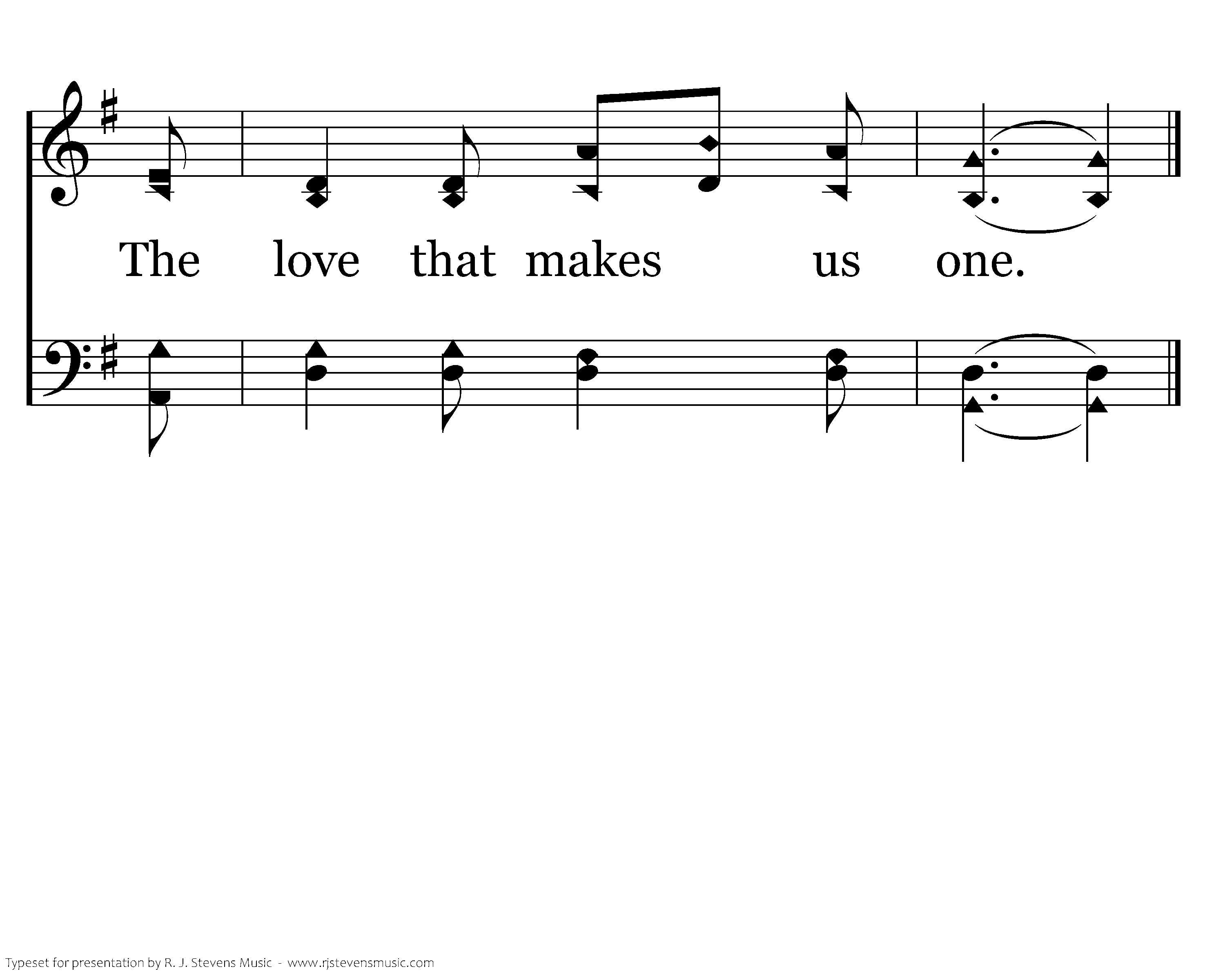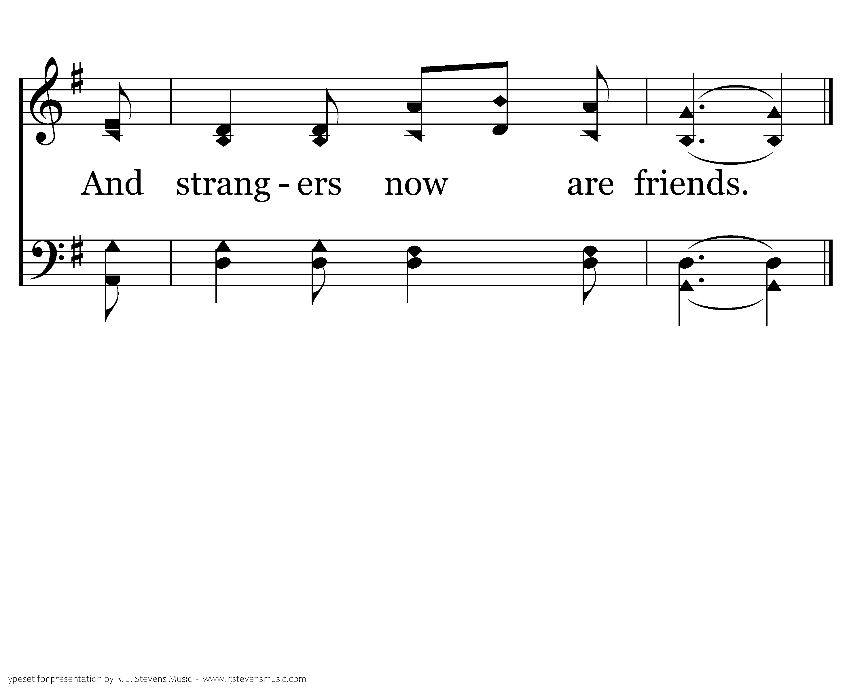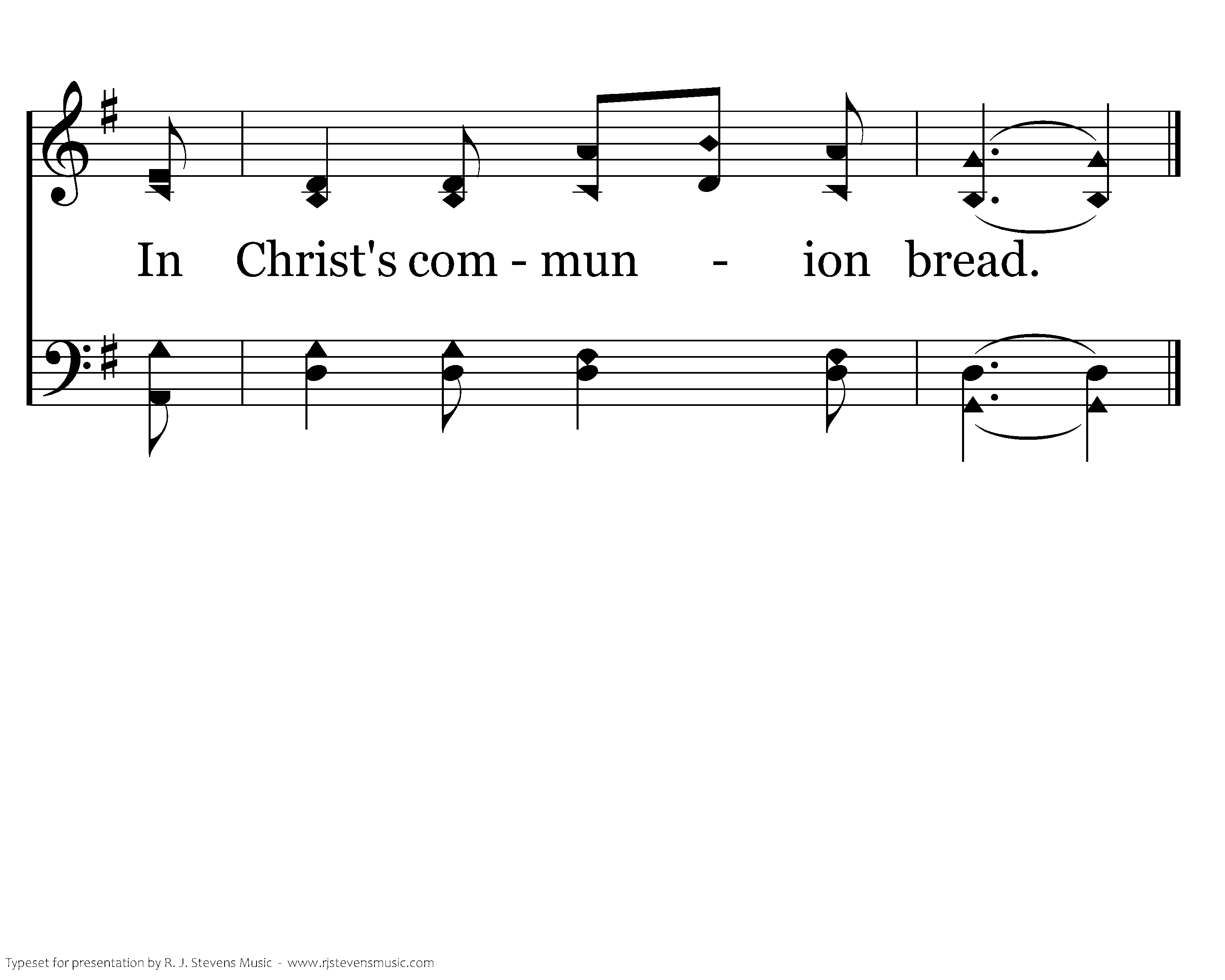 As Christ breaks bread, and bids us share, Each proud division ends. The love that made us, makes us one, And strangers now are friends, And strangers now are friends.