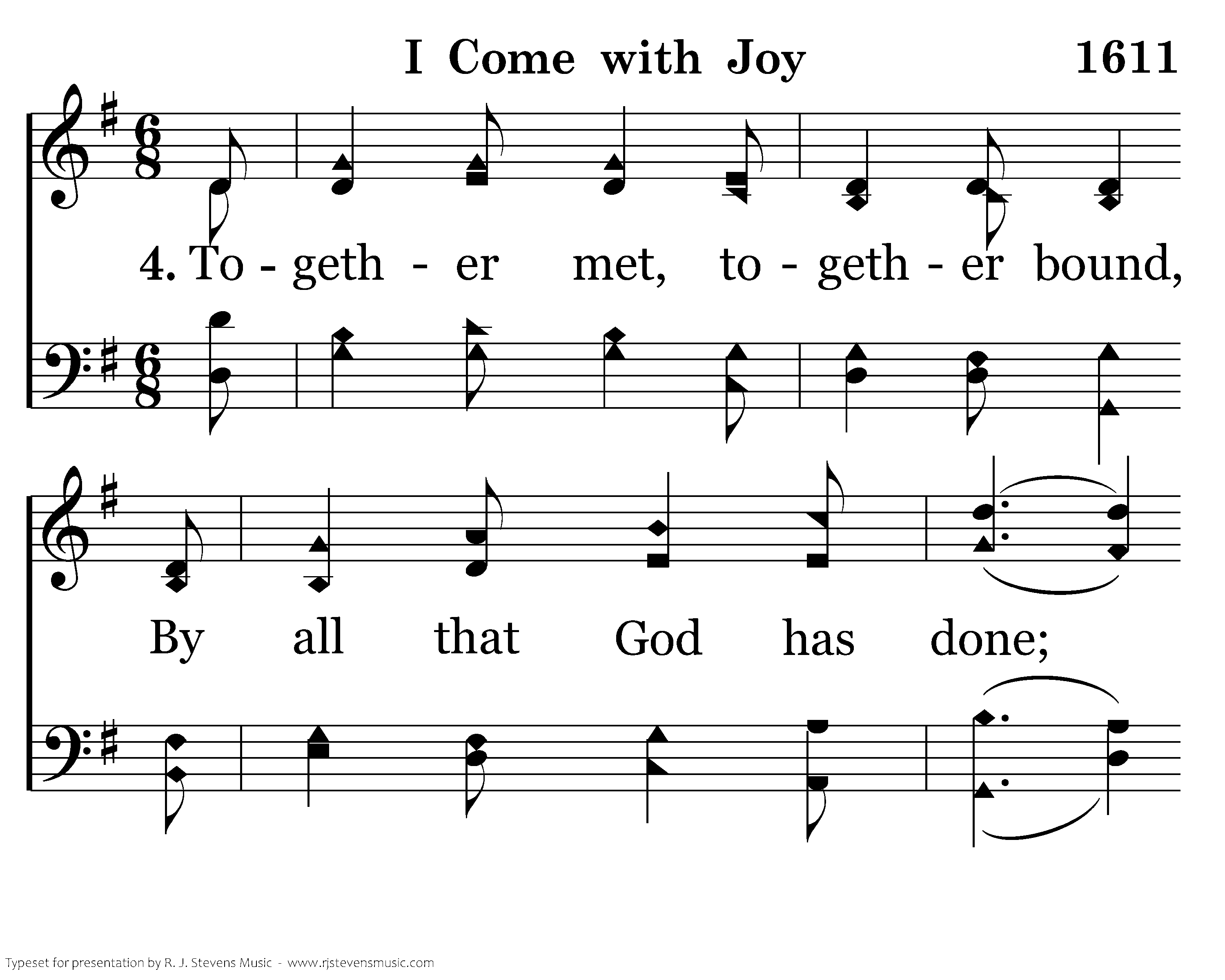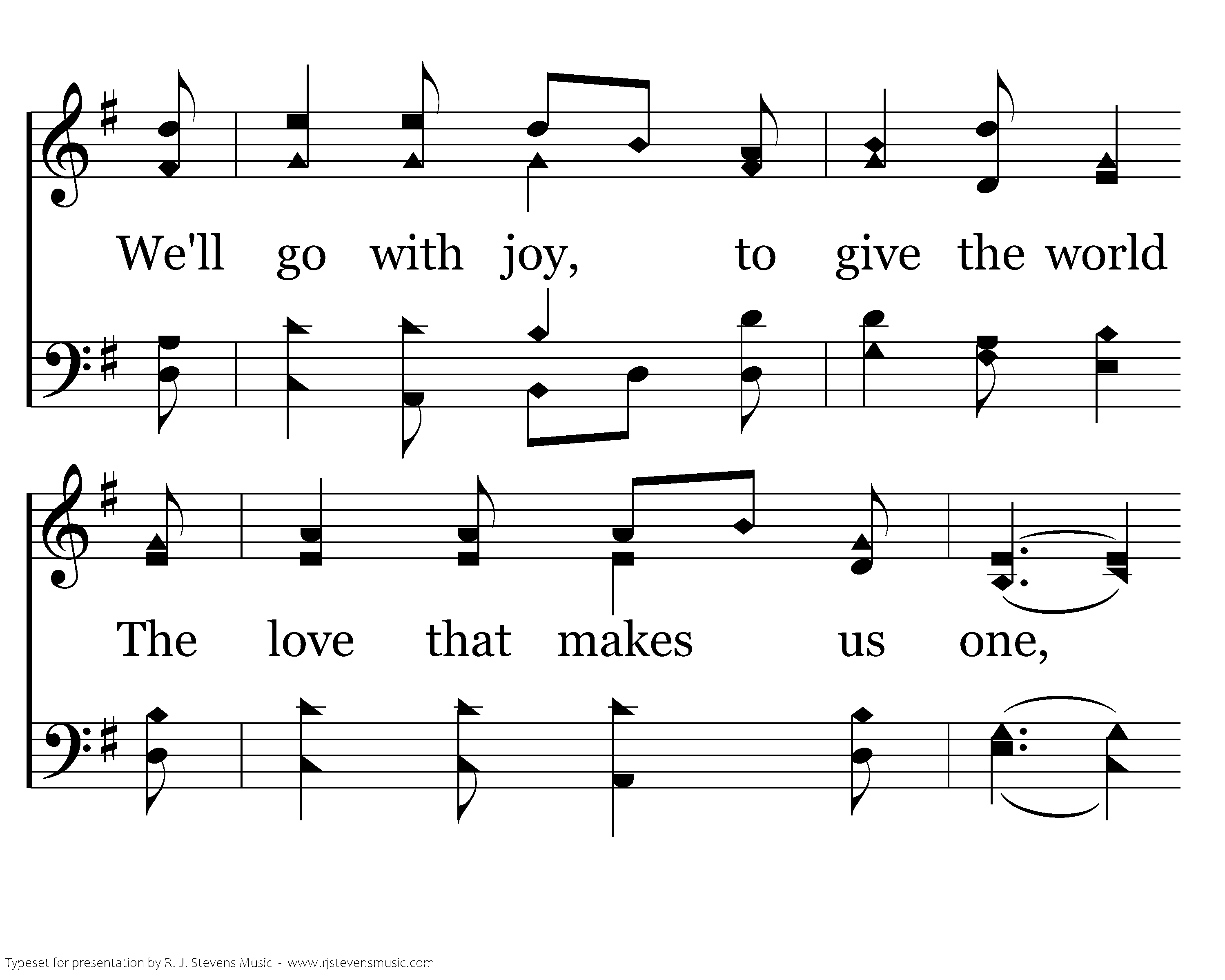 Together met, together bound, By all that God has done; We'll go with joy, to give the world The love that makes us one, The love that makes us one.