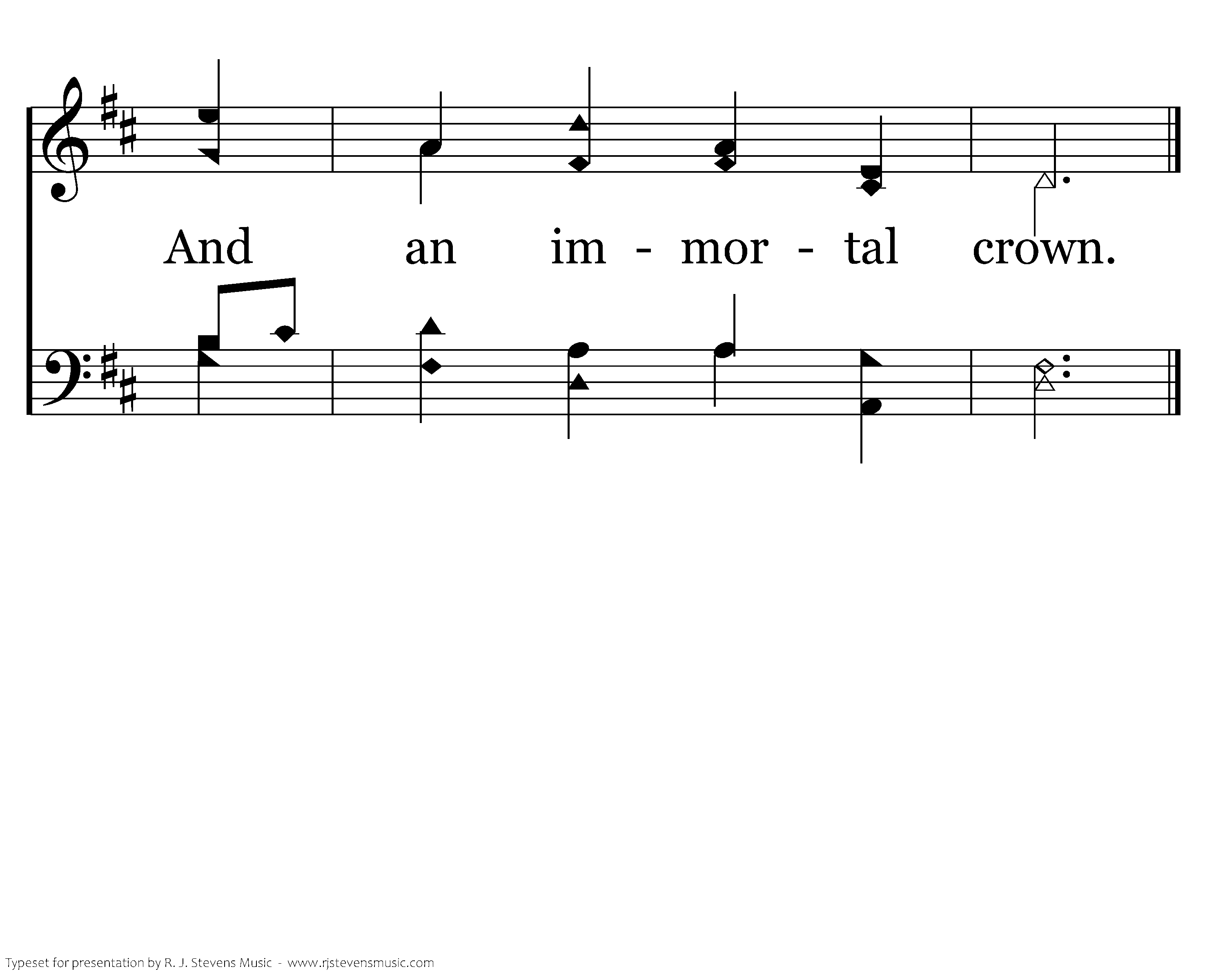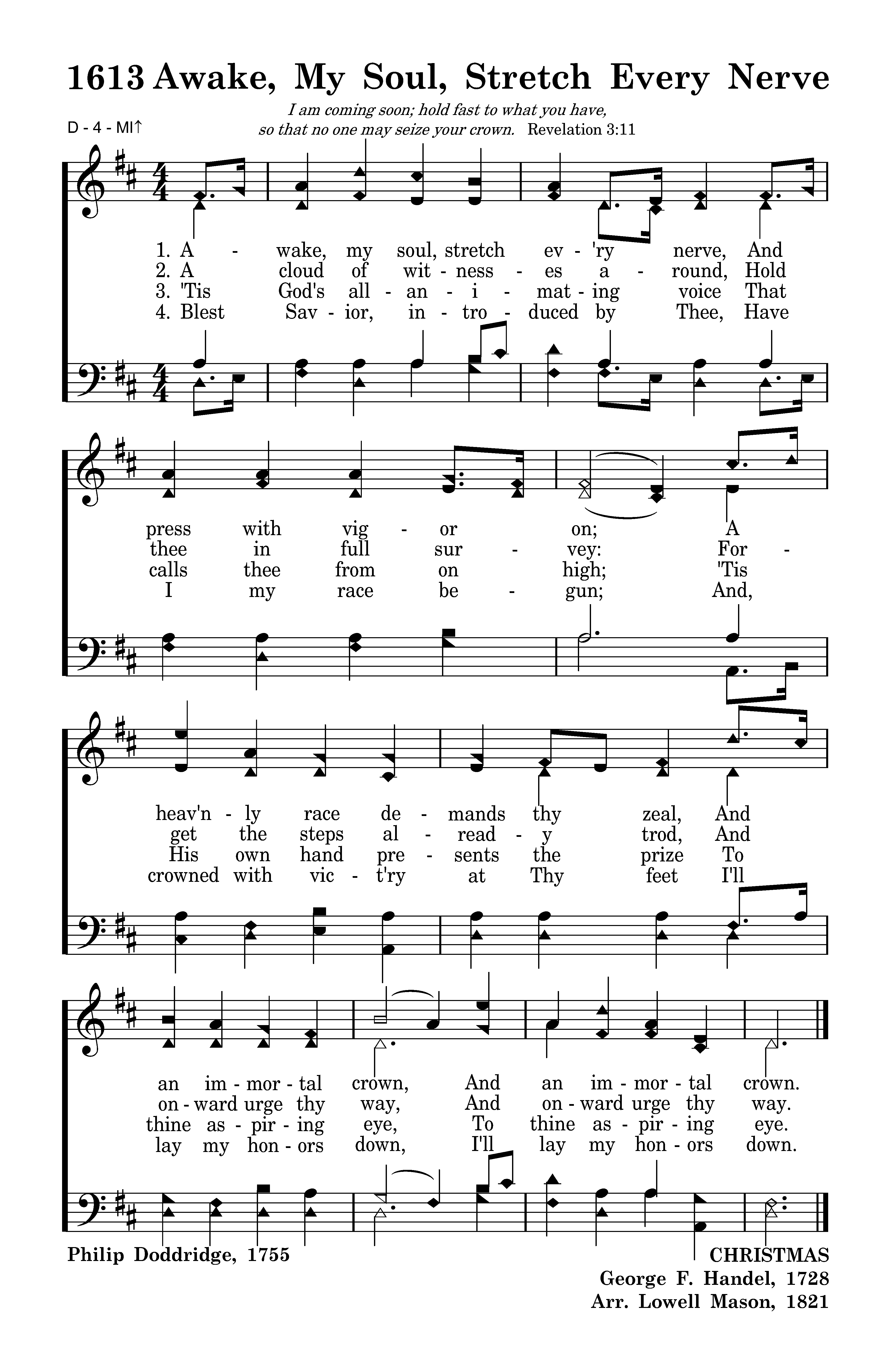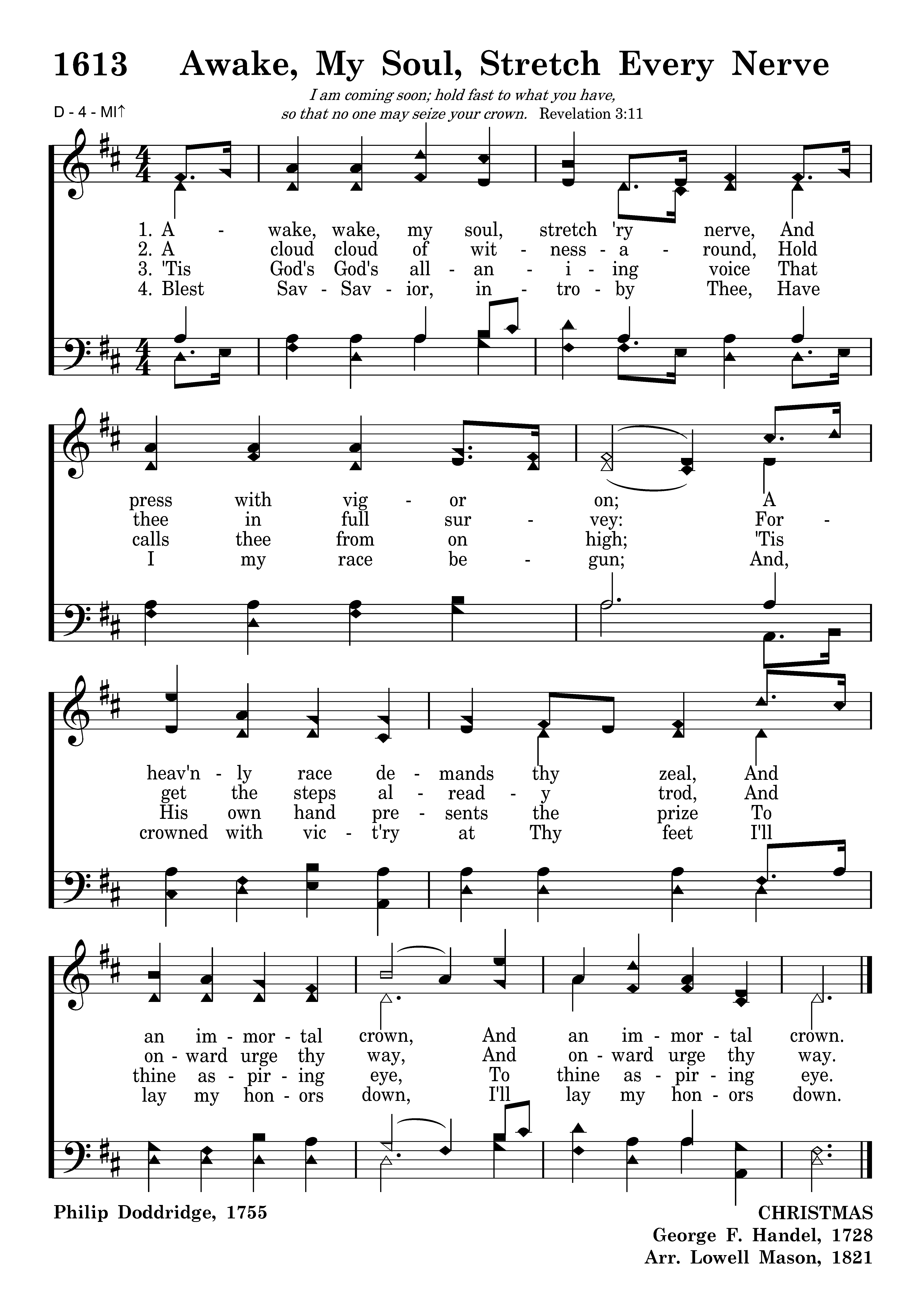 Awake, my soul, stretch ev'ry nerve, And press with vigor on; A heav'nly race demands thy zeal, And an immortal crown, And an immortal crown.