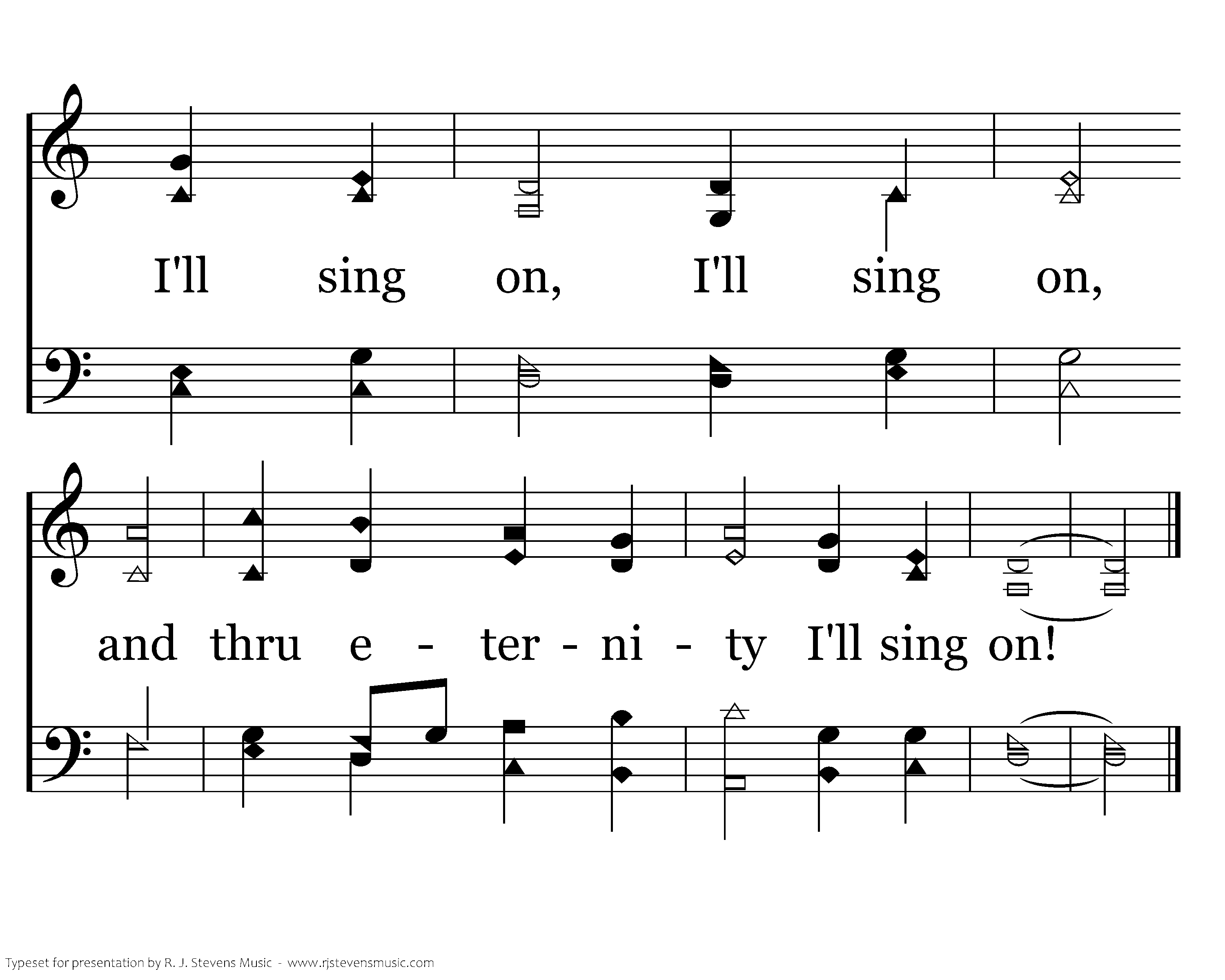 And when from death I'm free, I'll sing on, I'll sing on, And when from death I'm free, I'll sing on; And when from death I'm free, I'll sing and joyful be, And through eternity I'll sing on, I'll sing on, and through eternity I'll sing on!