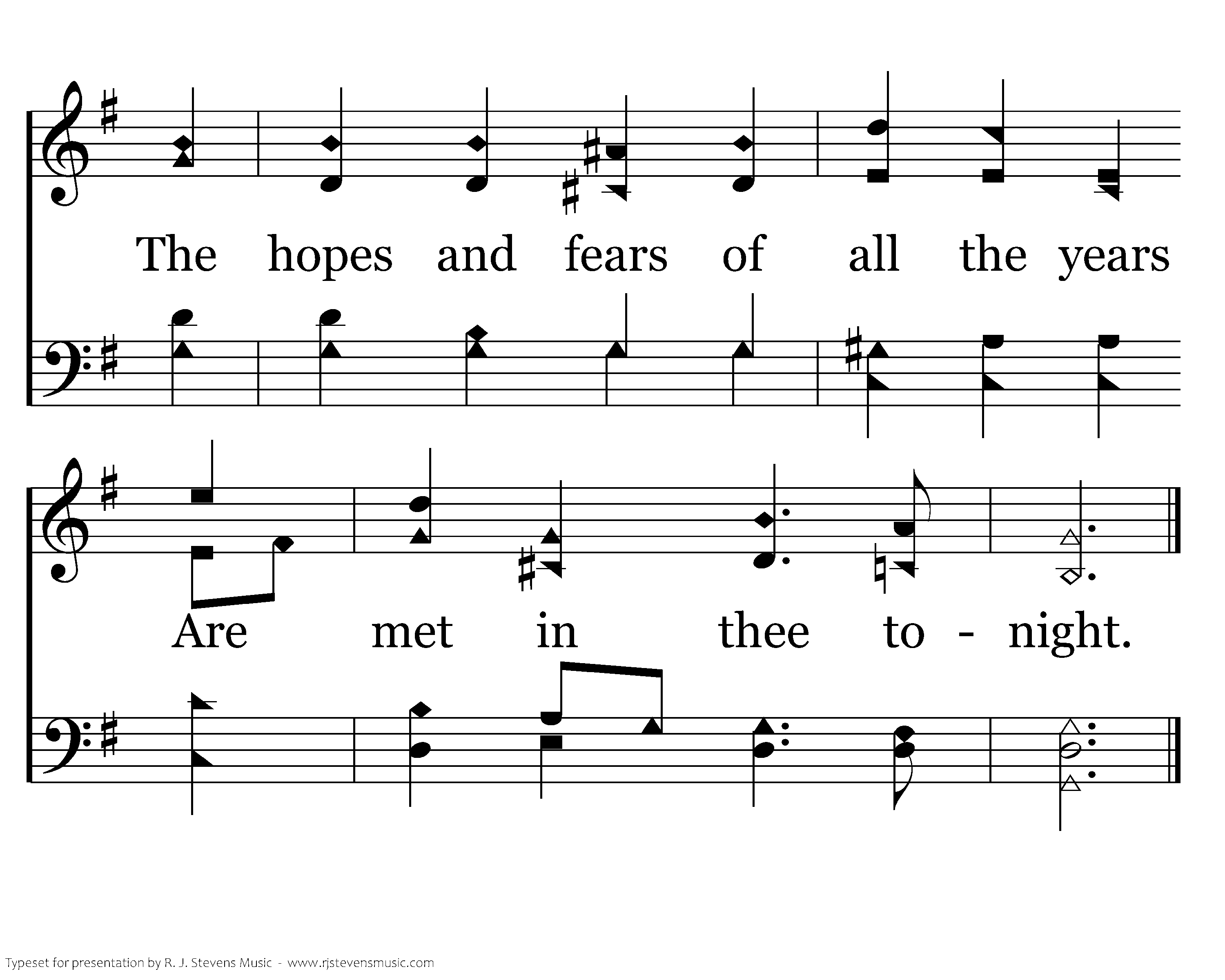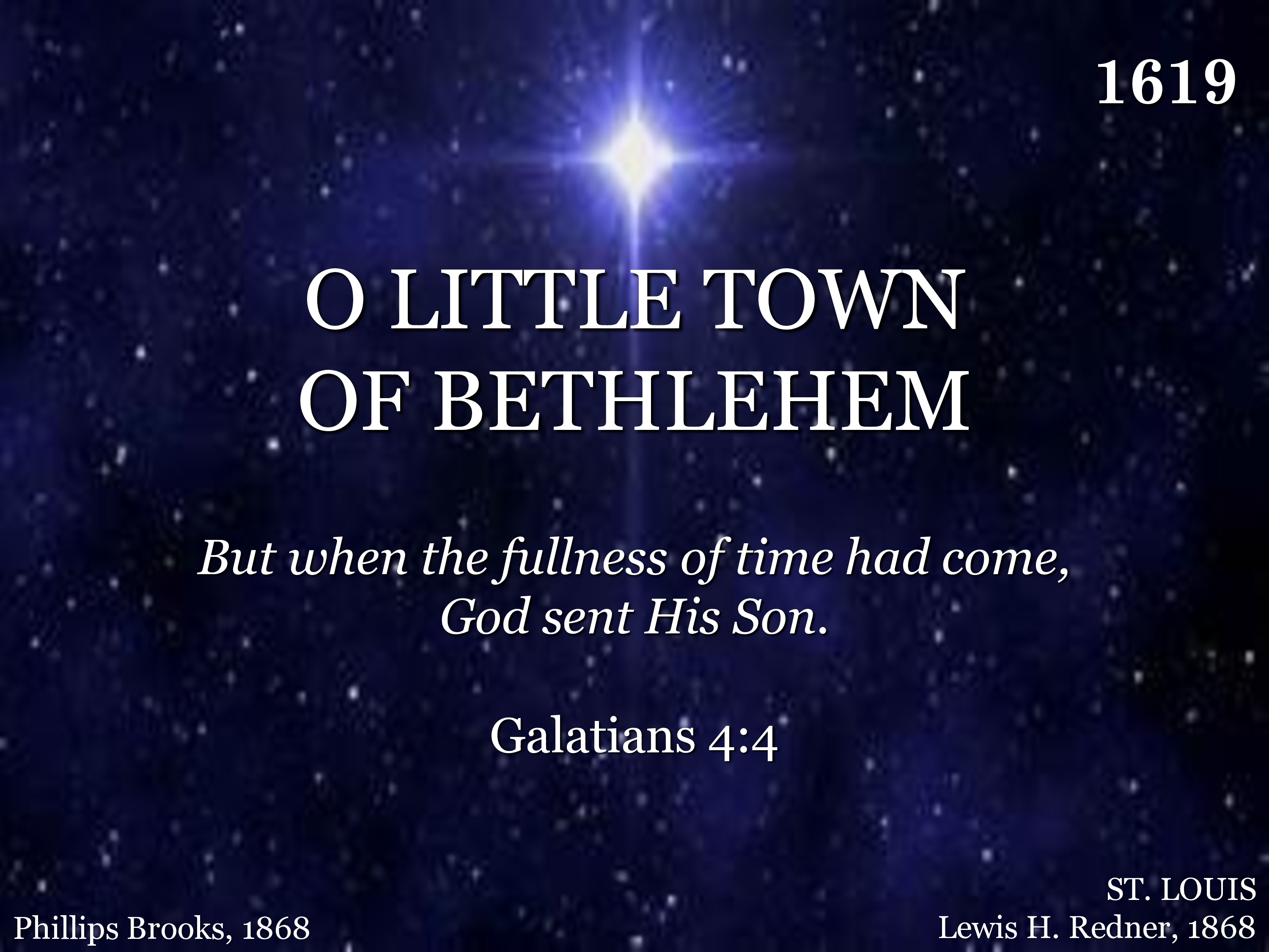 O little town of Bethlehem, How still we see thee lie! Above thy deep and dreamless sleep The silent stars go by; Yet in thy dark streets shineth The everlasting Light; The hopes and fears of all the years Are met in thee tonight.