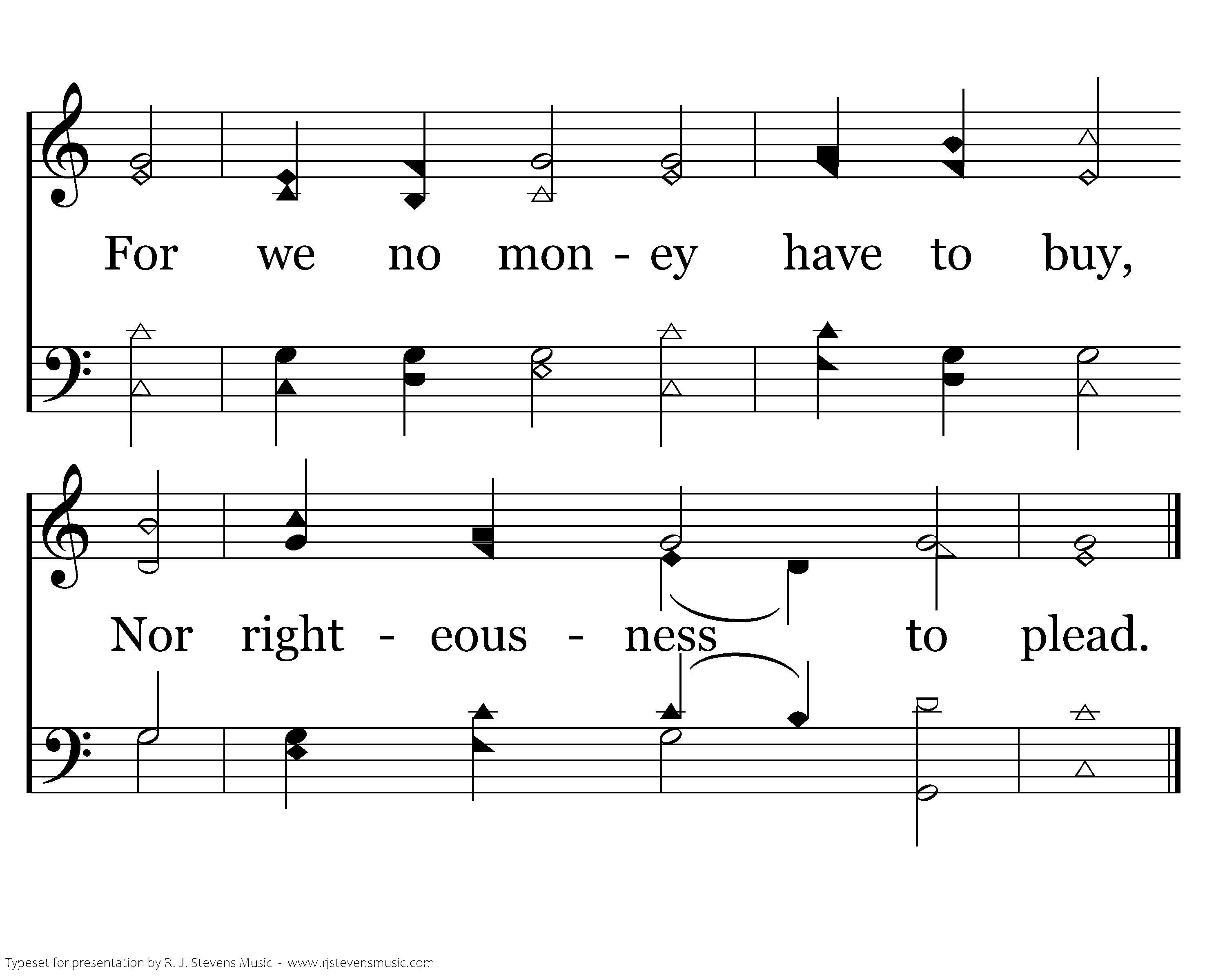 Thy word invites us nigh, Or we would starve indeed; For we no money have to buy, Nor righteousness to plead.