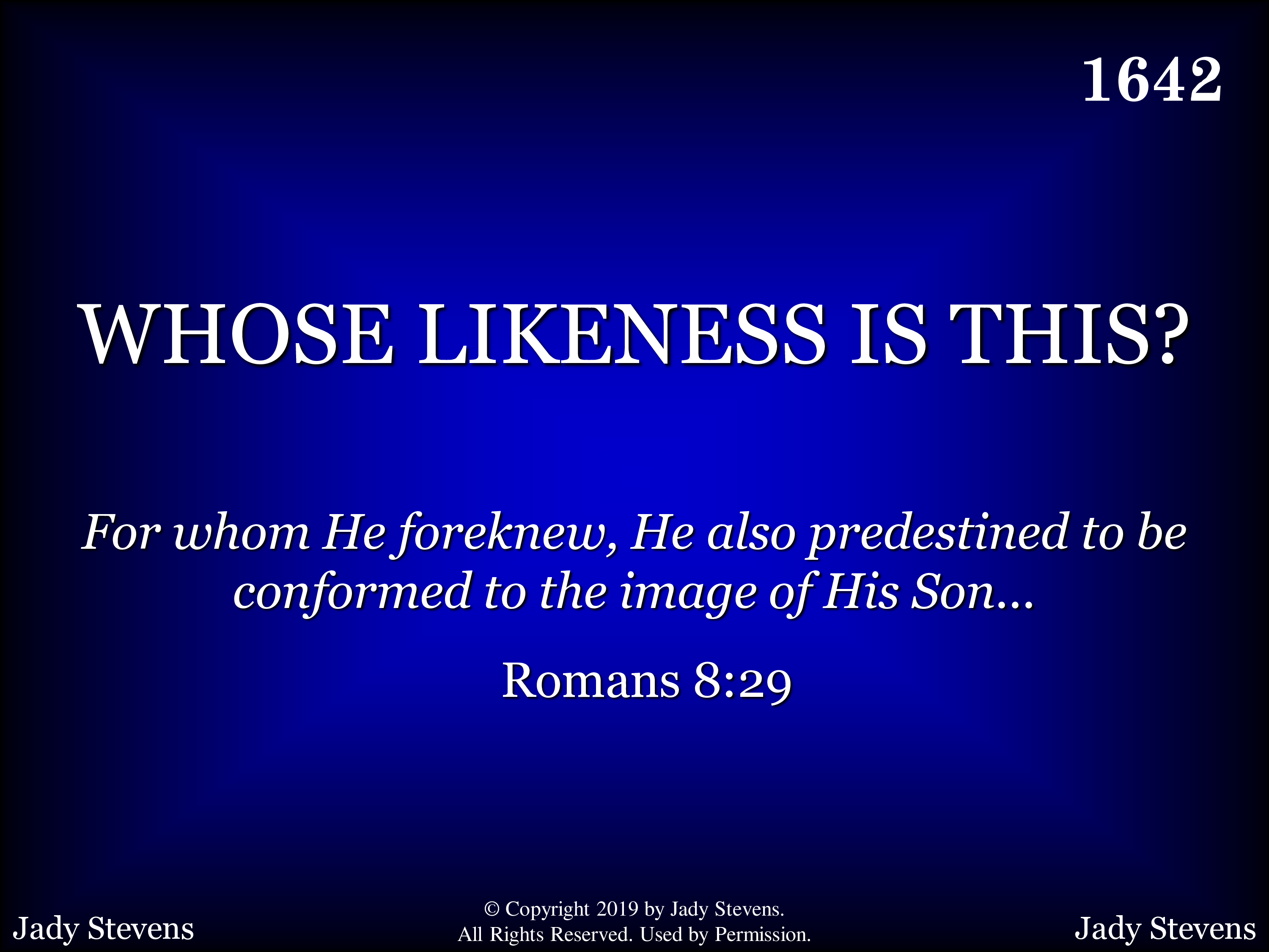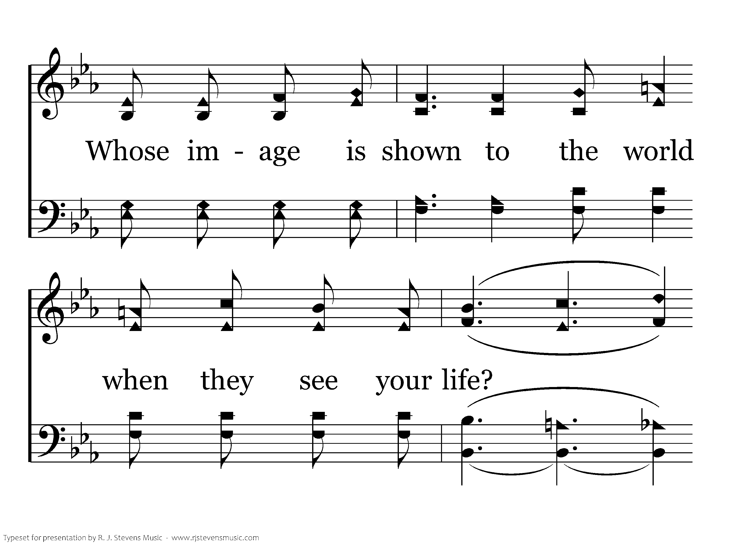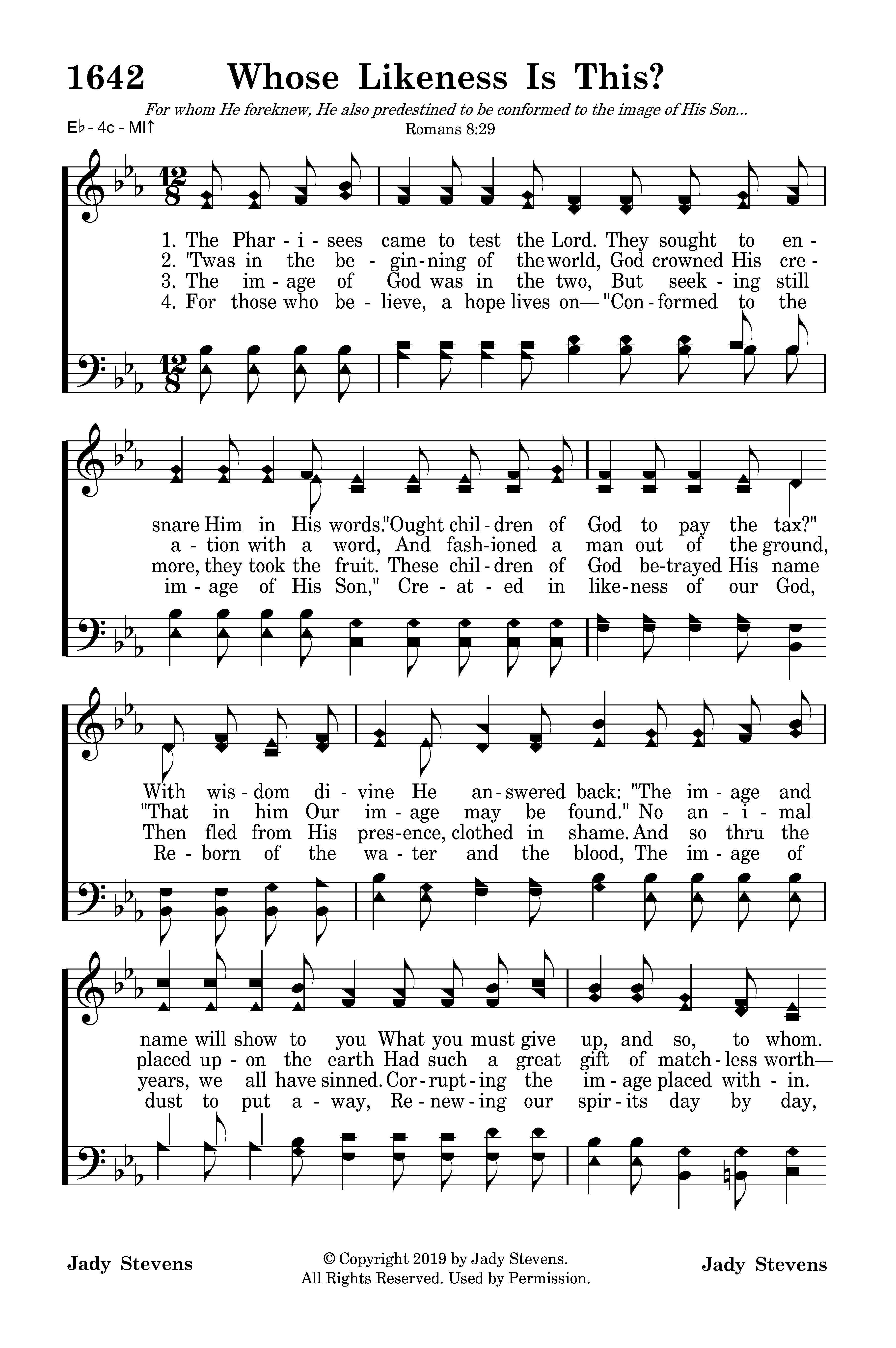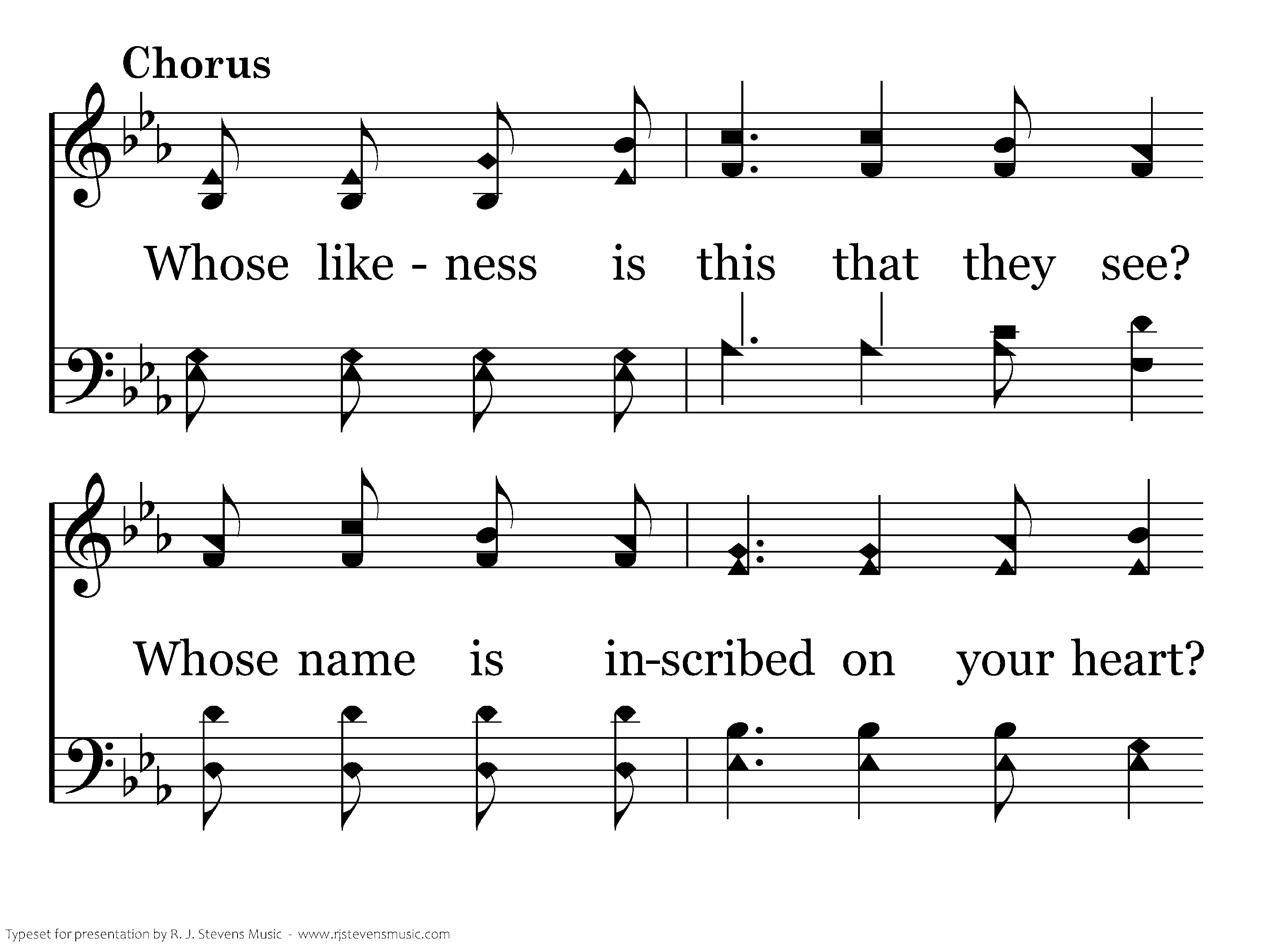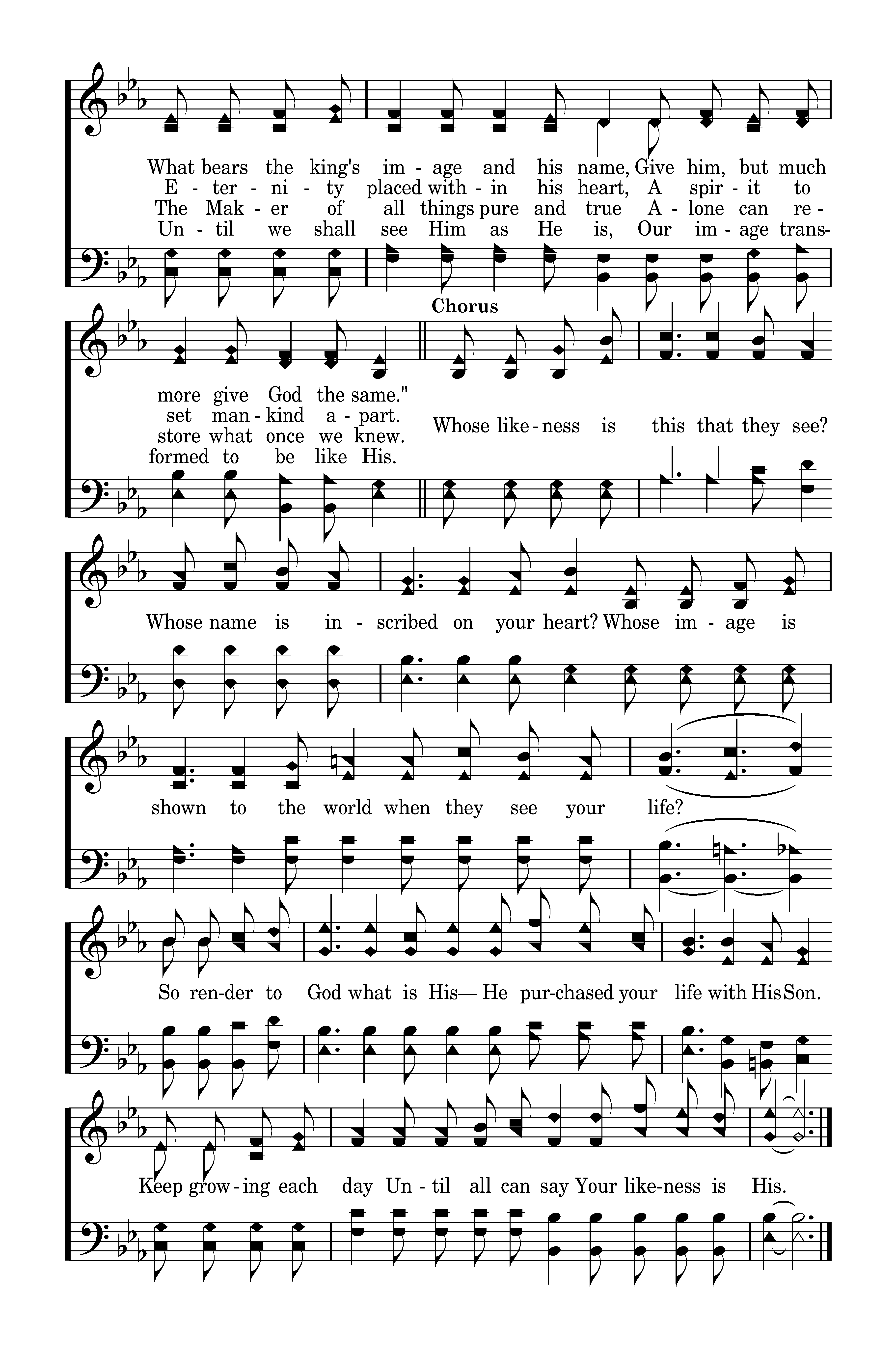 Whose likeness is this that they see? Whose name is inscribed on your heart? Whose image is shown to the world when they see your life? So render to God what is His— He purchased your life with His Son. Keep growing each day Until all can say Your likeness is His.