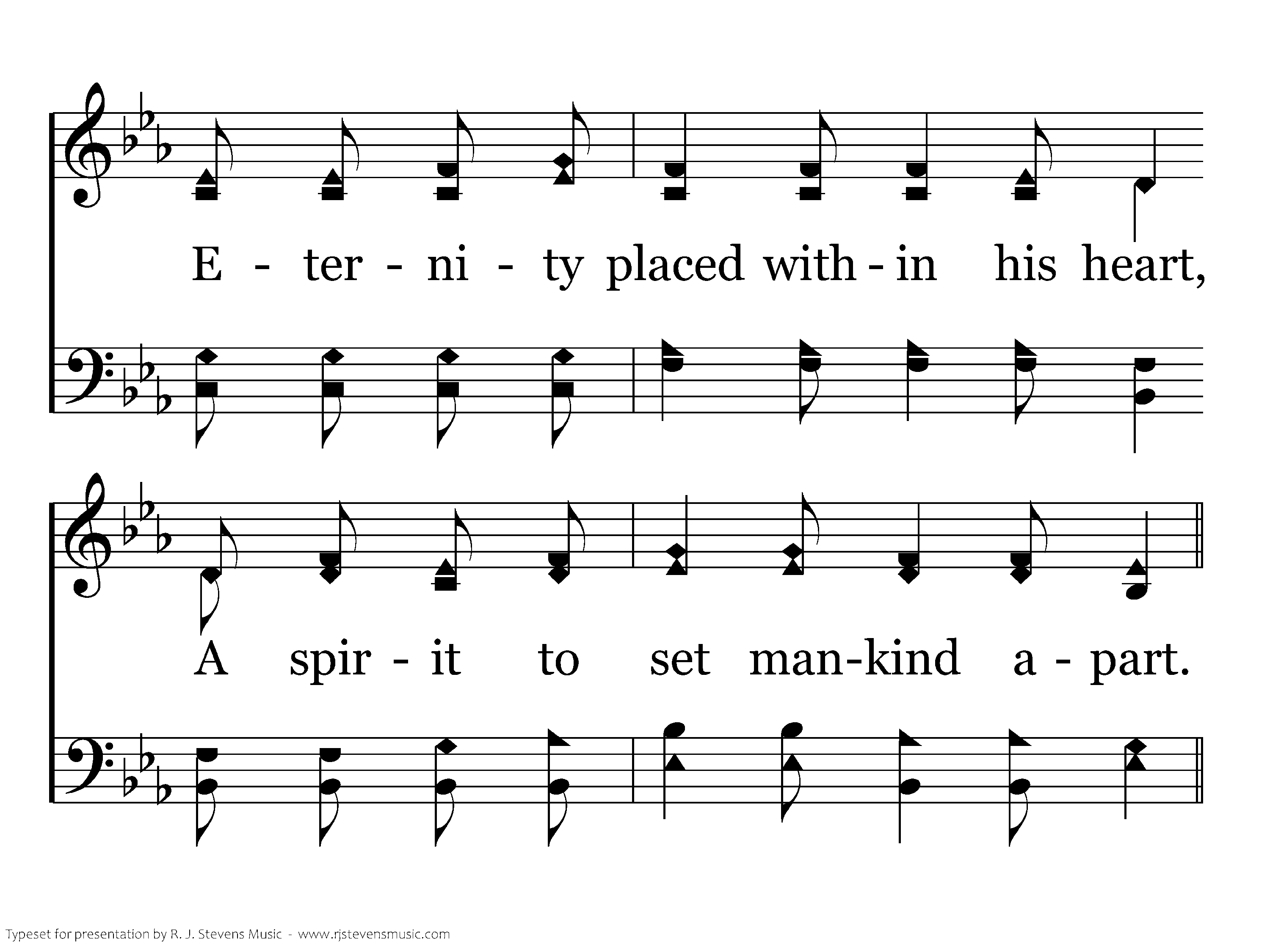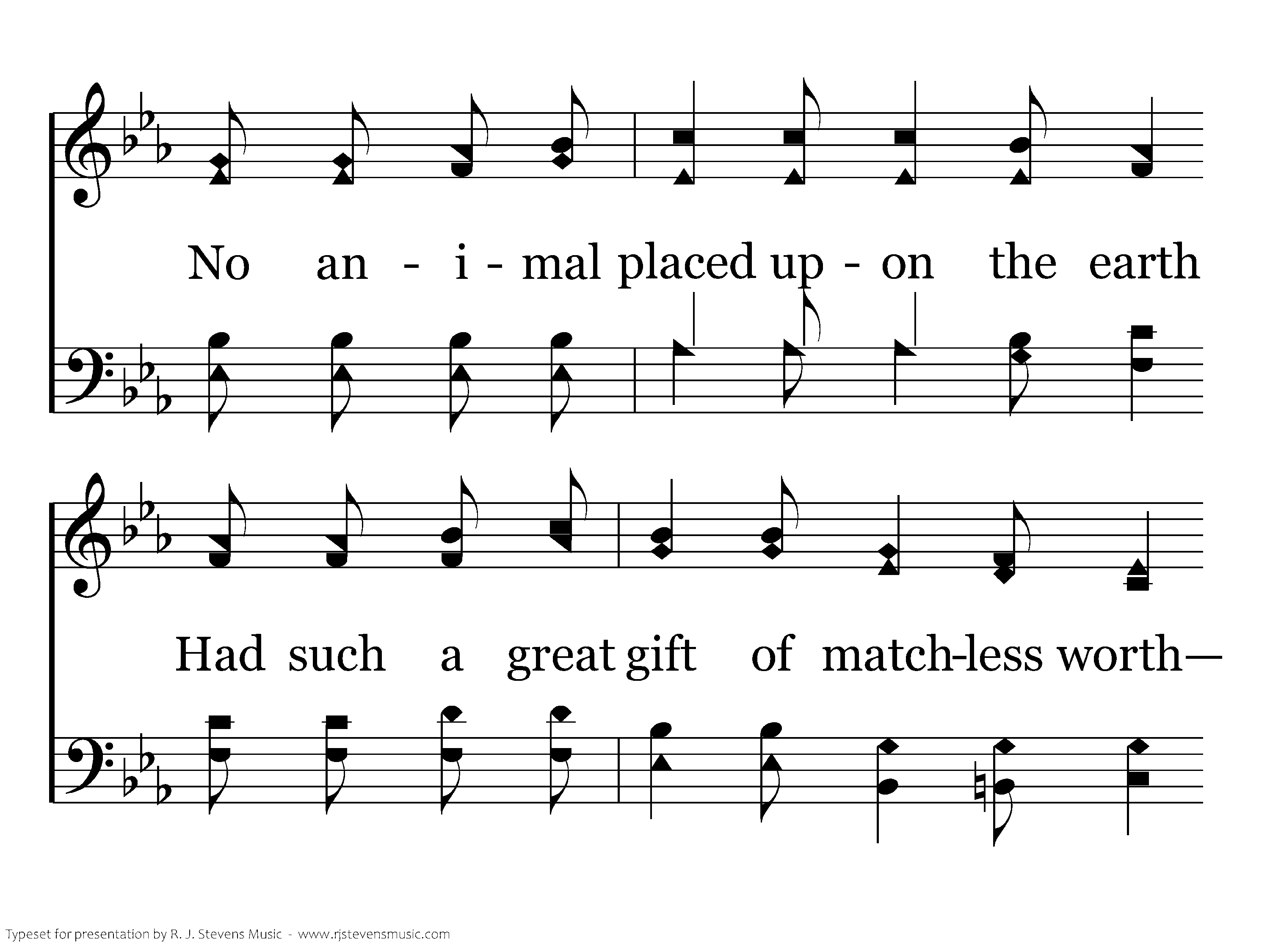 'Twas in the beginning of the world, God crowned His creation with a word, And fashioned a man out of the ground, "That in him Our image may be found." No animal placed upon the earth Had such a great gift of matchless worth— Eternity placed within his heart, A spirit to set mankind apart.