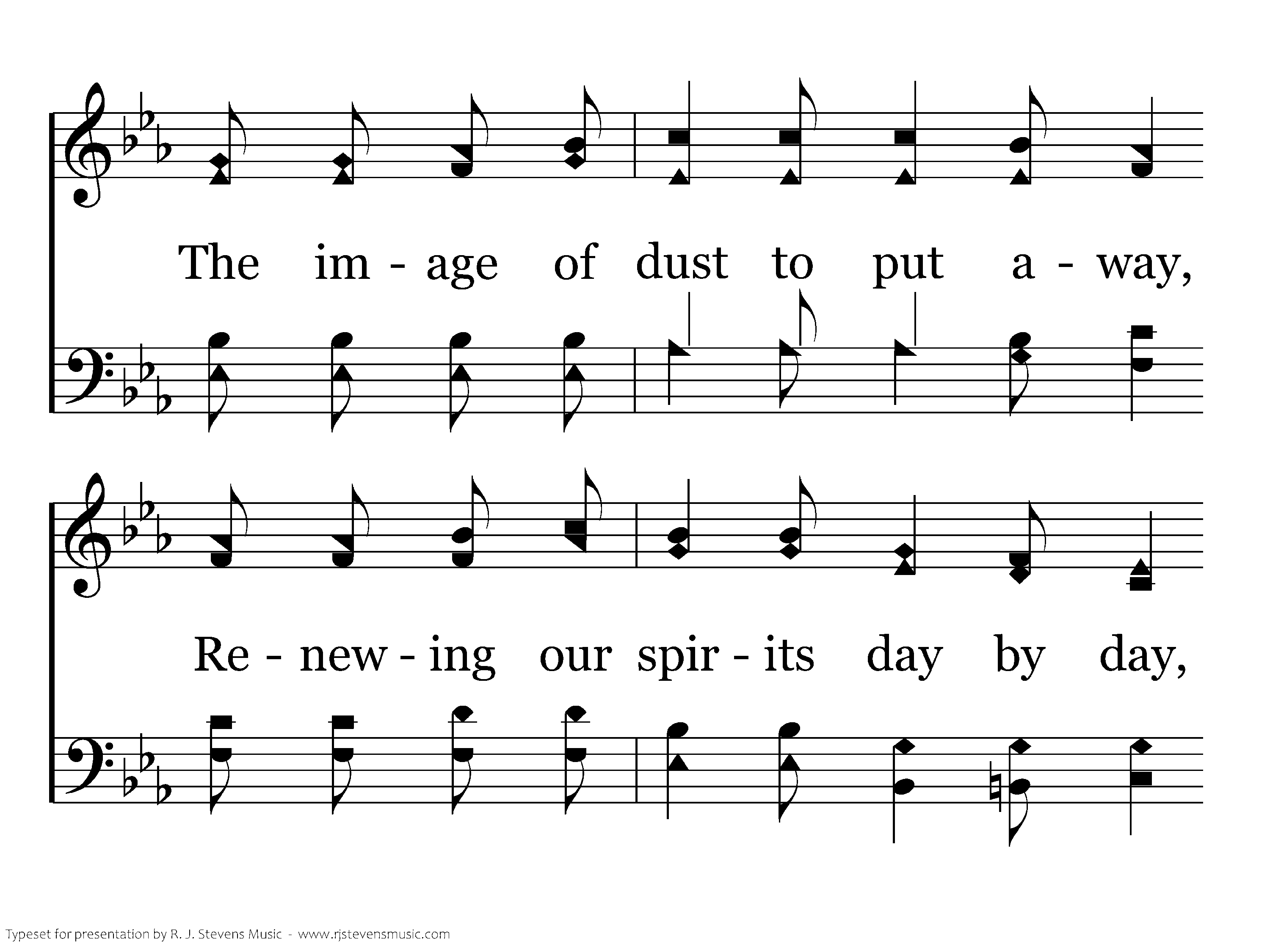 For those who believe, a hope lives on— "Conformed to the image of His Son," Created in likeness of our God, Reborn of the water and the blood, The image of dust to put away, Renewing our spirits day by day, Until we shall see Him as He is, Our image transformed to be like His.