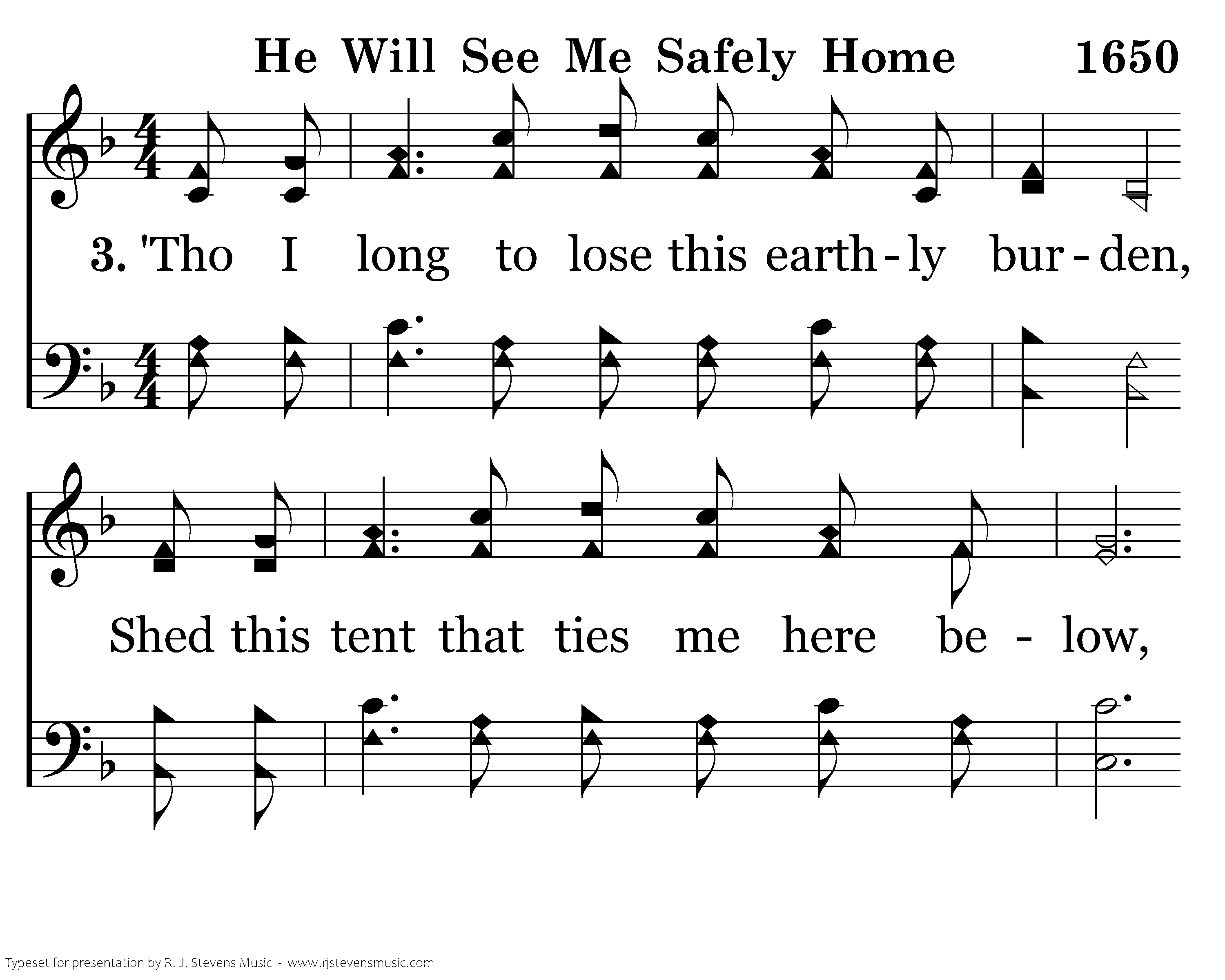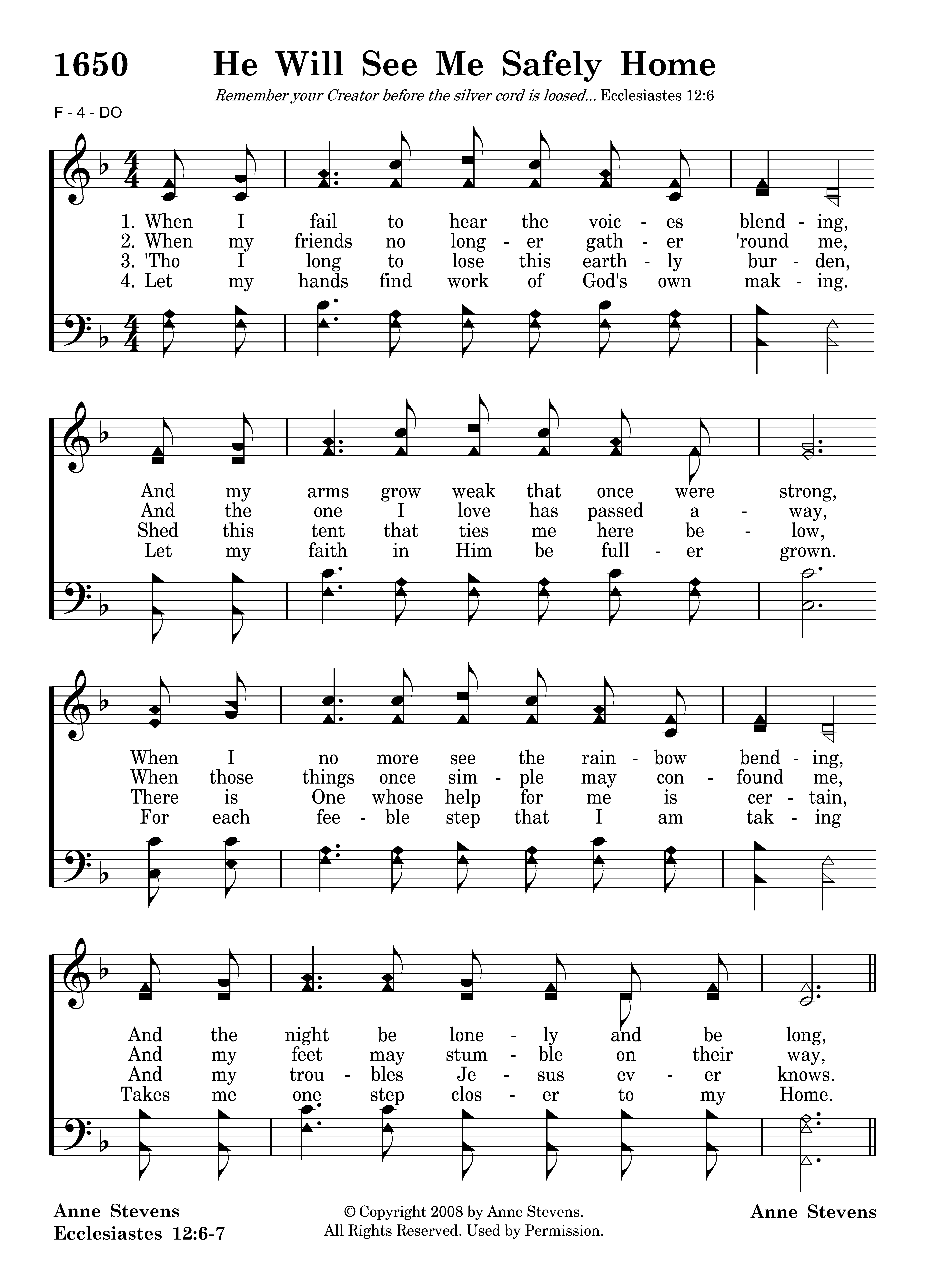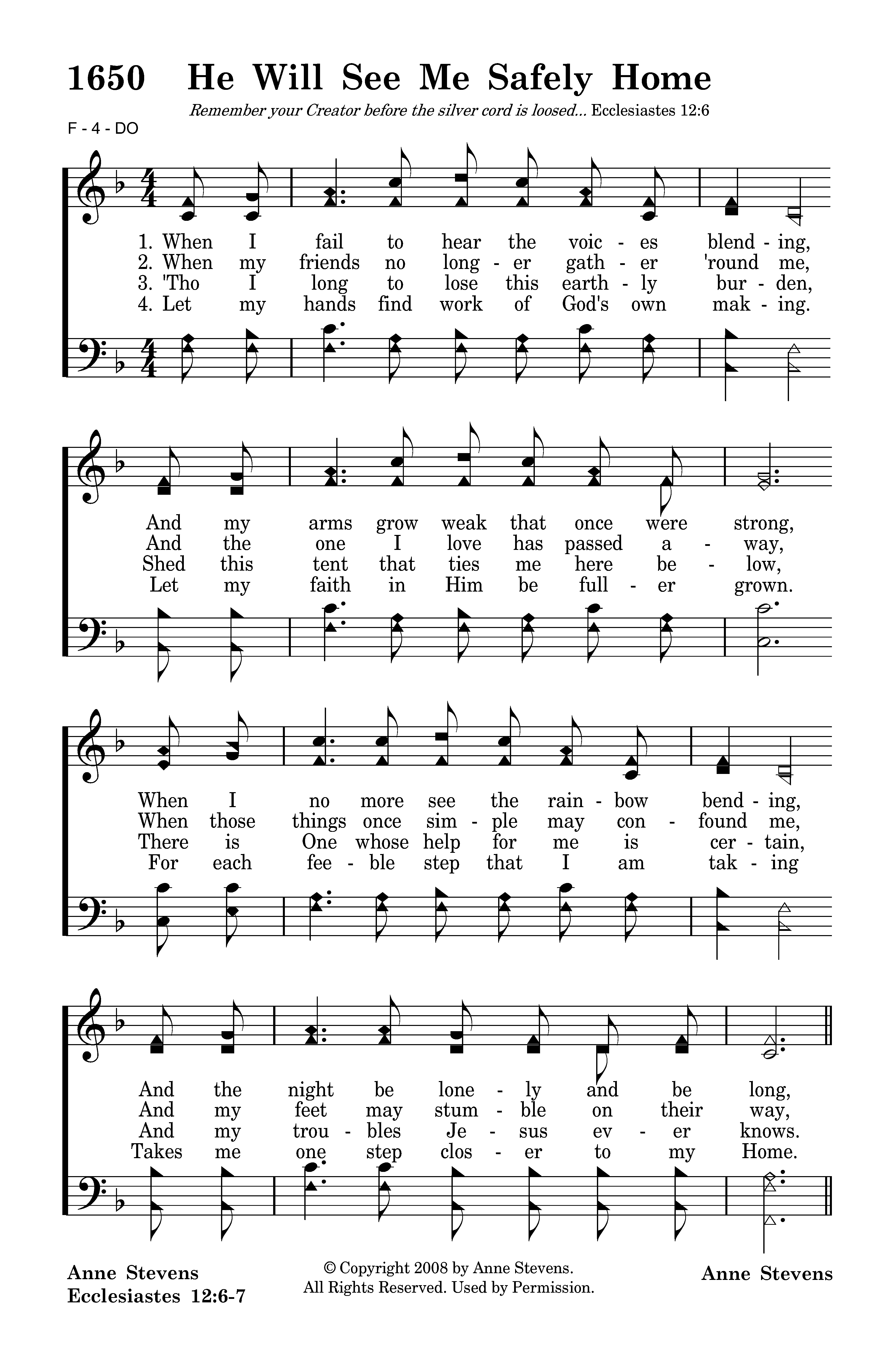 Let me not begrudge my fading vision, Let me not my youth now gone bemoan, For the Savior knows the path before me. Sure and He will see me safely home.