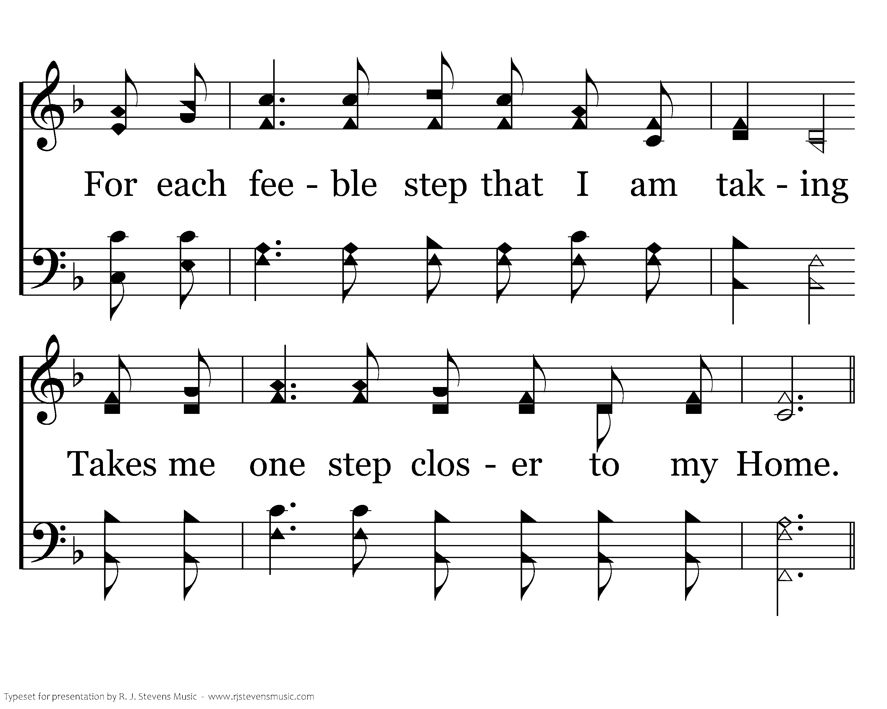 Let my hands find work of God's own making. Let my faith in Him be fuller grown. For each feeble step that I am taking Takes me one step closer to my Home.