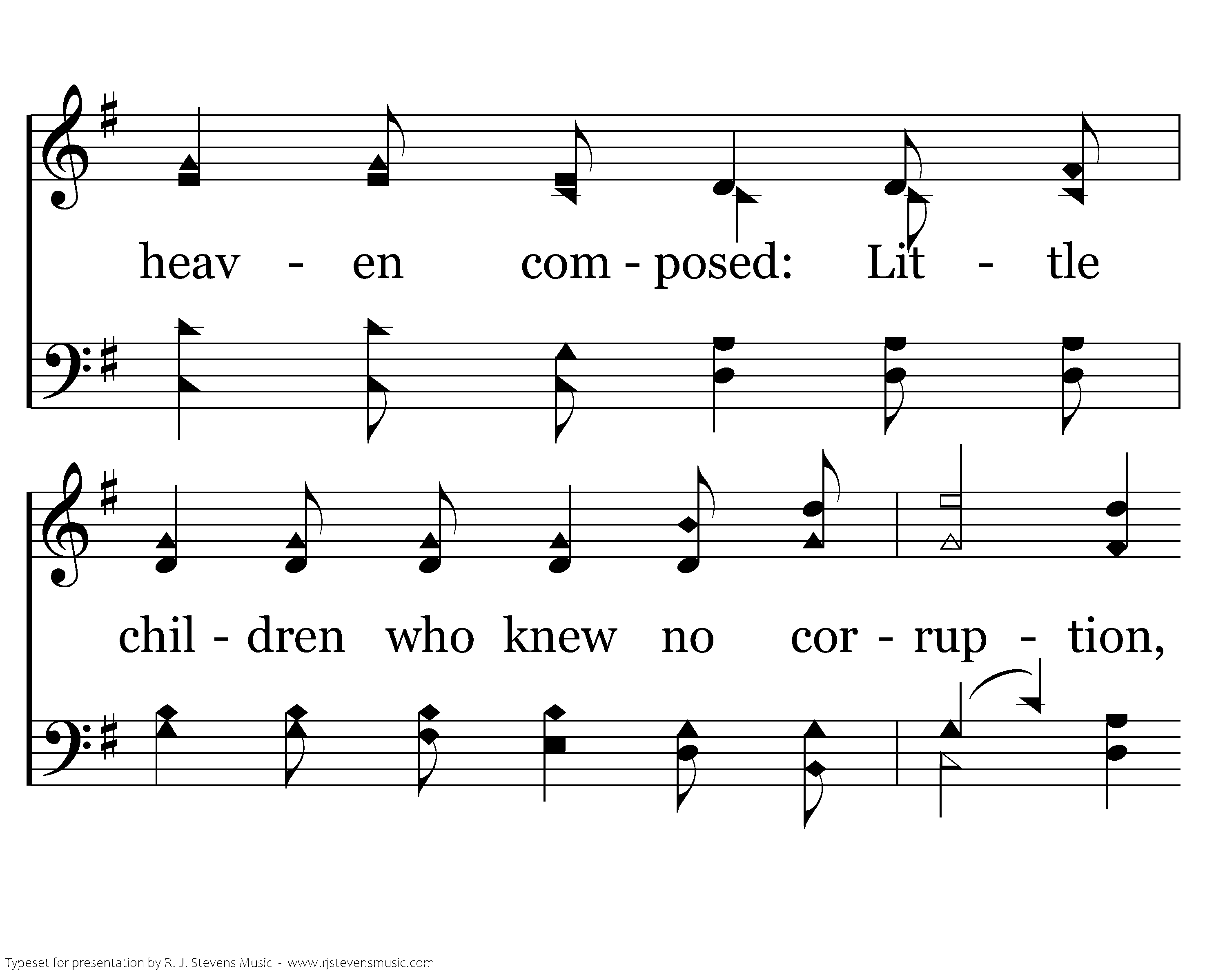When the day ends too soon for a life in its dawn And the night settles dark on the mourning, Yet our hope lights the path leading t'ward them who are gone, Where they shine like the dew in the morning. Of such is the kingdom of heaven composed: Little children who knew no corruption, Little children who never beheld the light of day, Now embraced by the Light of creation.