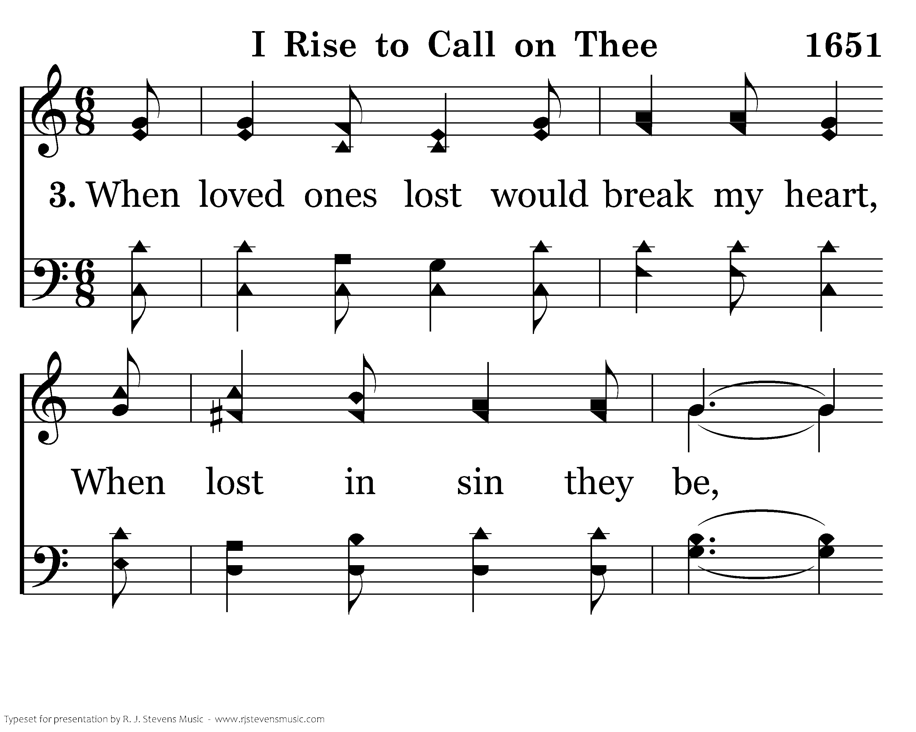 When loved ones lost would break my heart, When lost in sin they be, For wisdom Thine, For help divine, I rise to call on Thee. When night has come but sleep is gone, With hours to pass before the dawn, 'Tho all the world may slumber on, I rise to call on Thee. I call, O Lord, on Thee.
