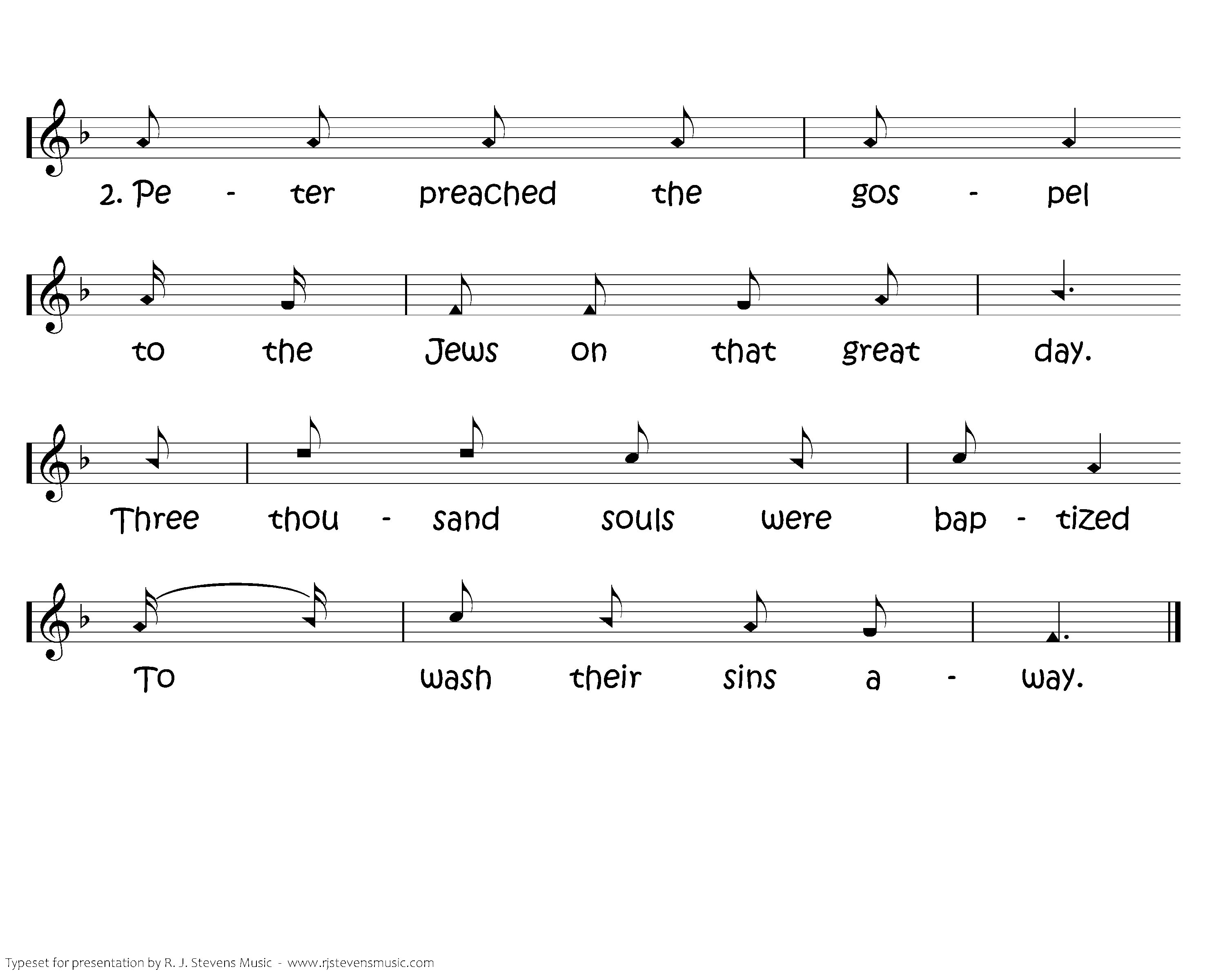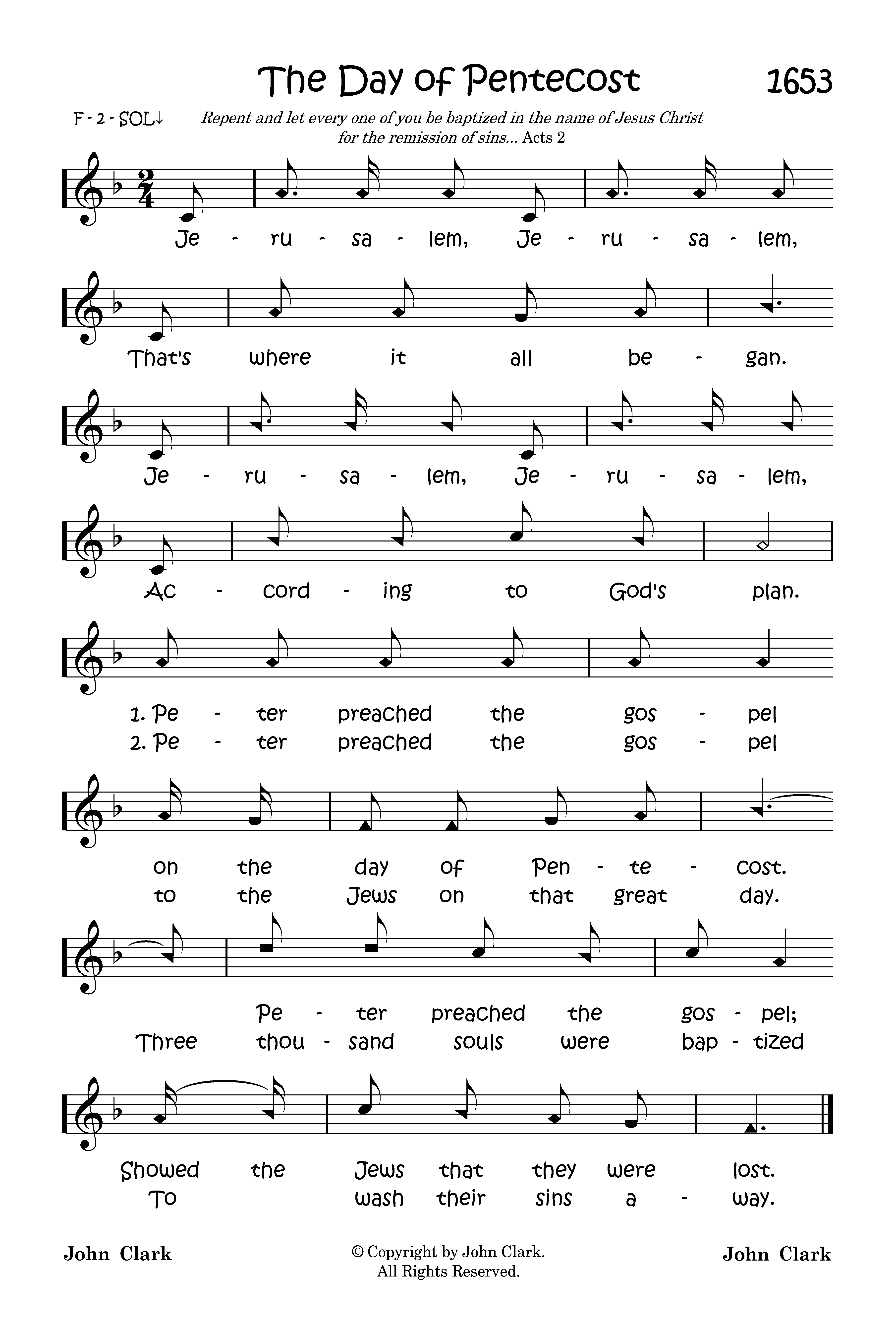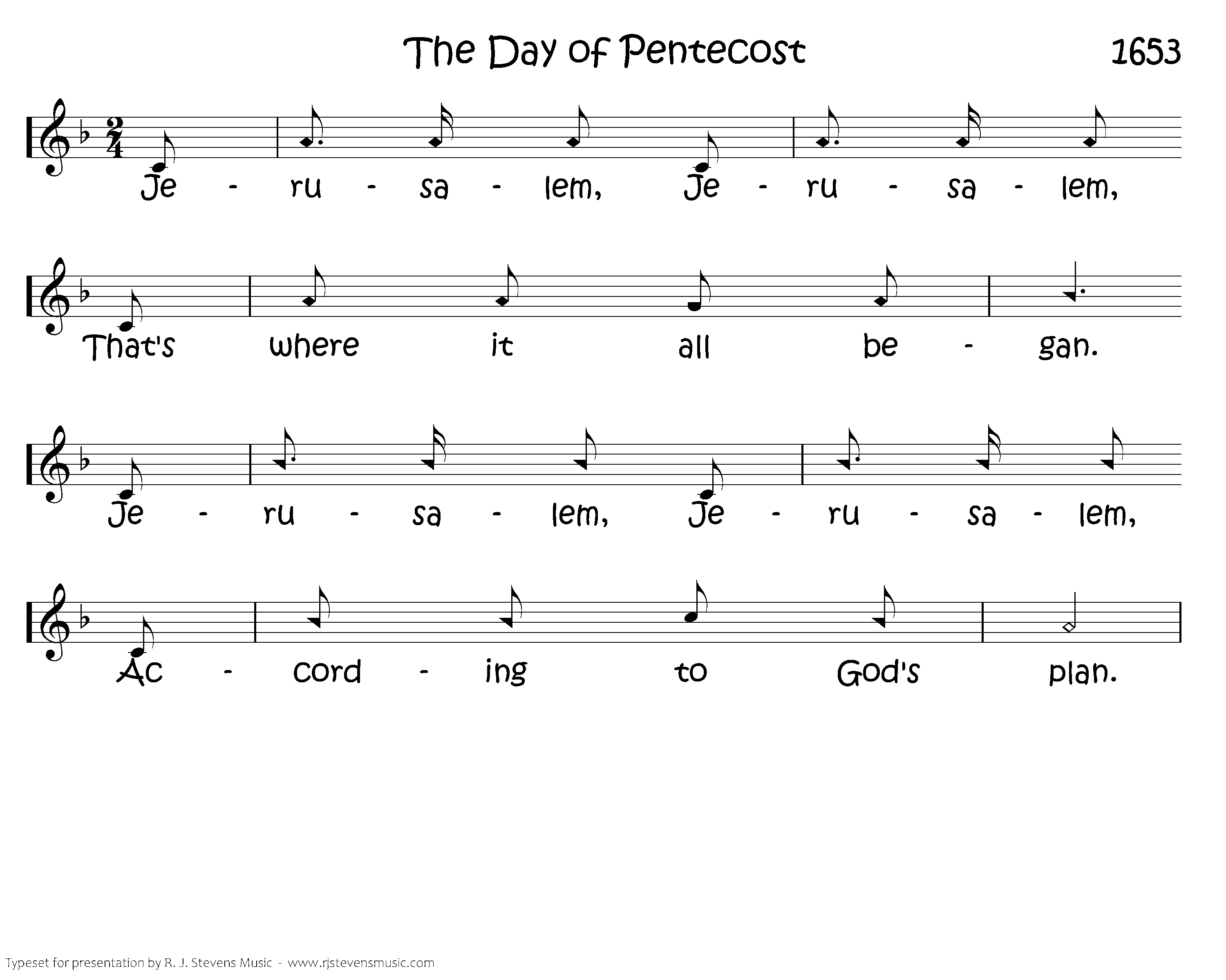 Jerusalem, Jerusalem, That's where it all began. Jerusalem, Jerusalem, According to God's plan. Peter preached the gospel to the Jews on that great day. Three thousand souls were baptized To wash their sins away.