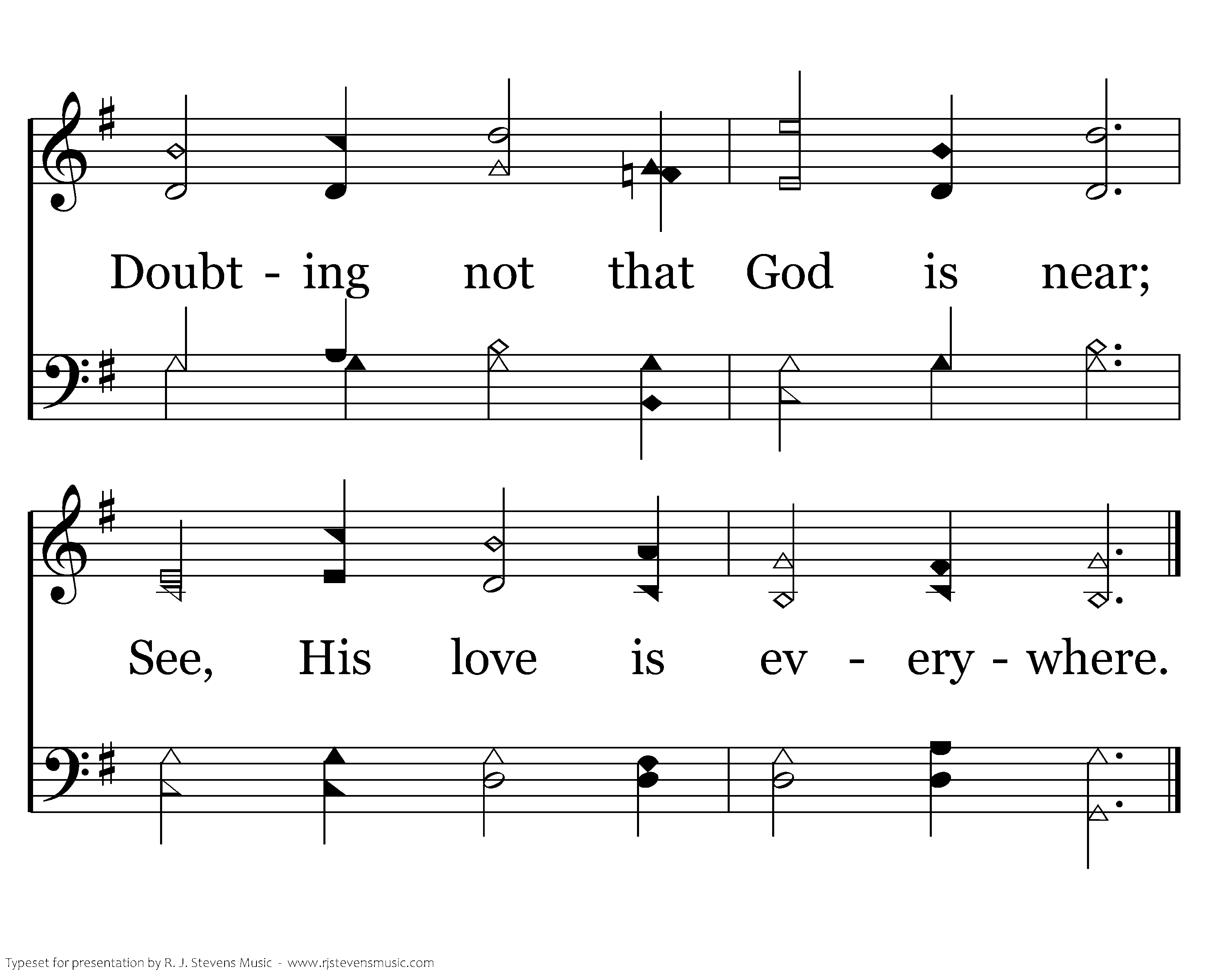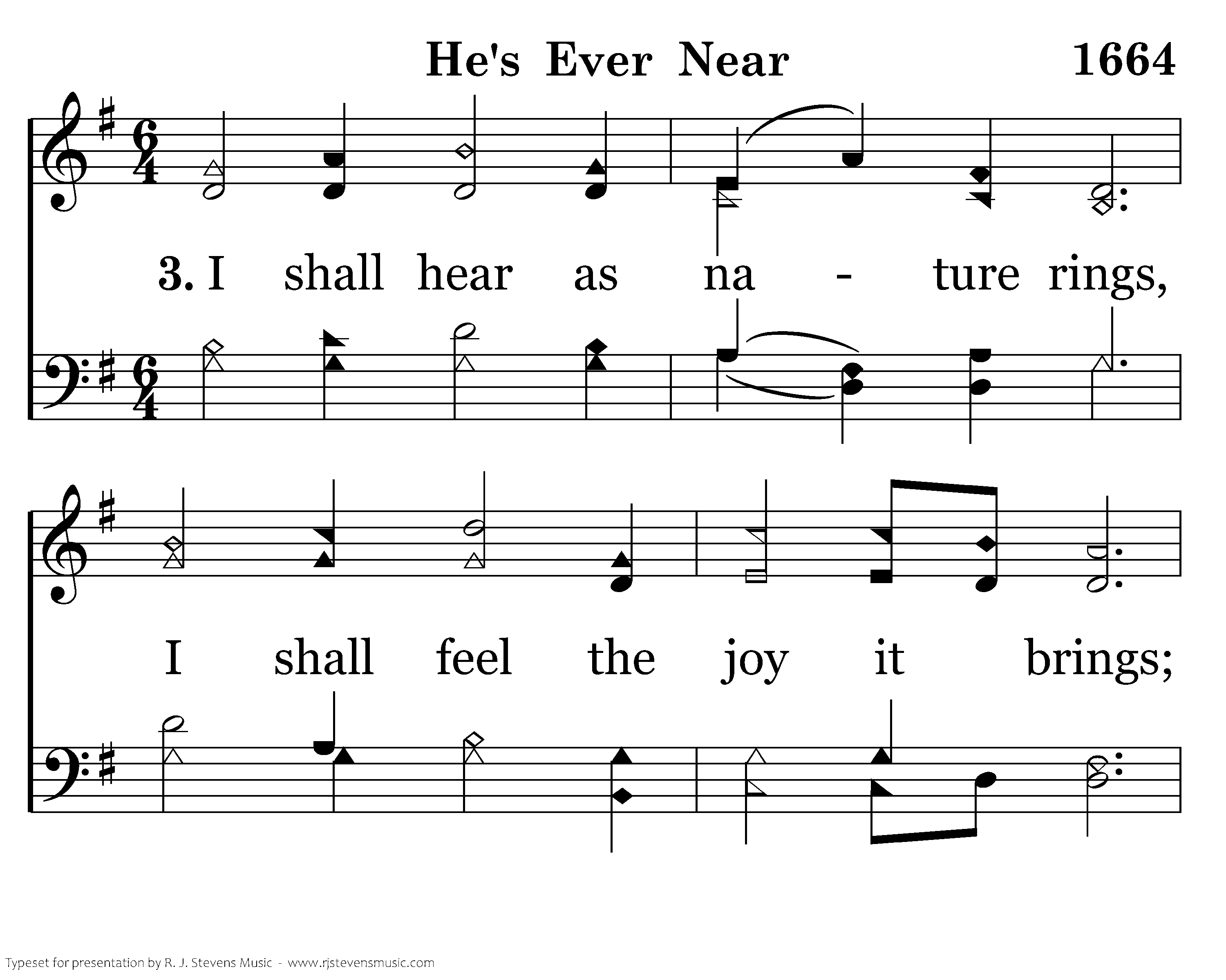 I shall hear as nature rings, I shall feel the joy it brings; Doubting not that God is near; See, His love is everywhere.