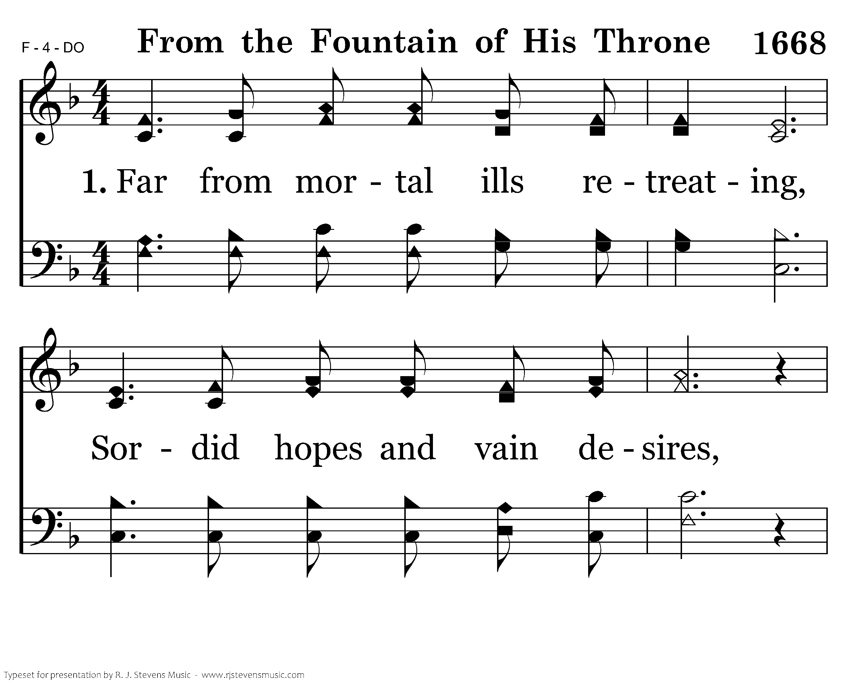 Far from mortal ills retreating, Sordid hopes and vain desires, Here His saints securely meeting, Ev'ry heart to heav'n aspires. From the fount of glory streaming, Life eternal through us rolls; Mercy from His presence beaming Peace and pardon on our souls.