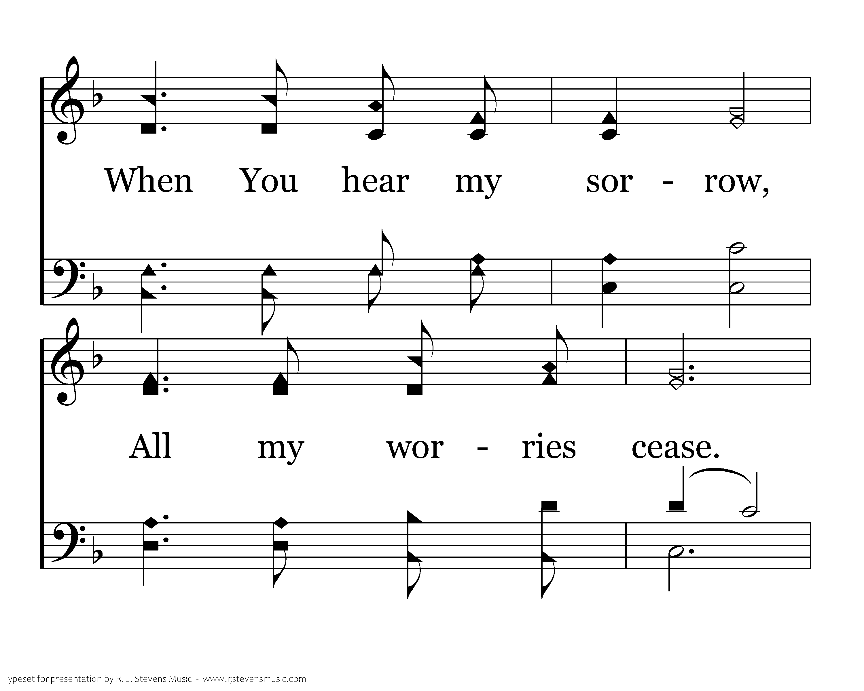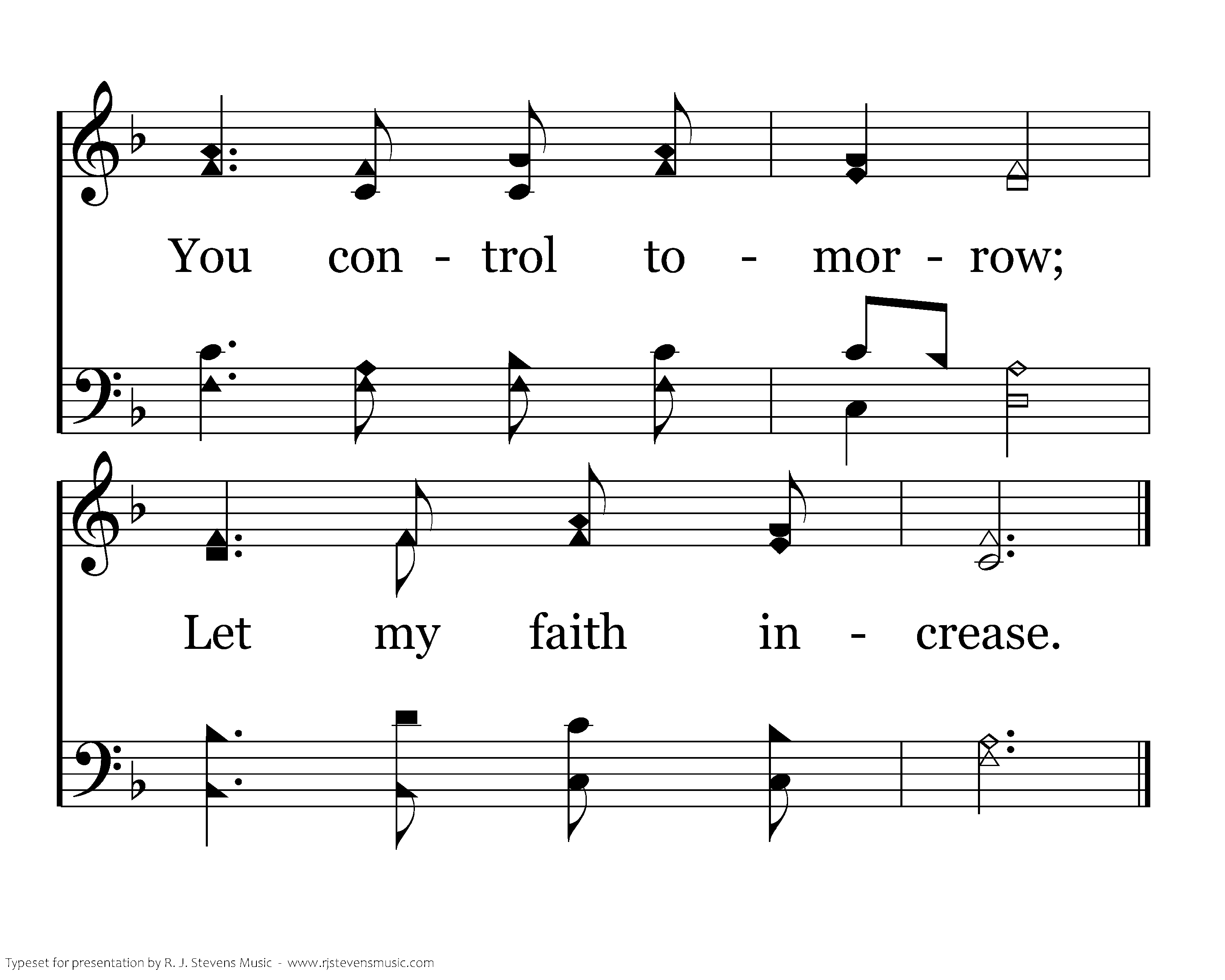 Lord, continue with me In my time of grief; Tho' affliction find me, You will give relief. When you hear my sorrow, All my worries cease. You control tomorrow; Let my faith increase.