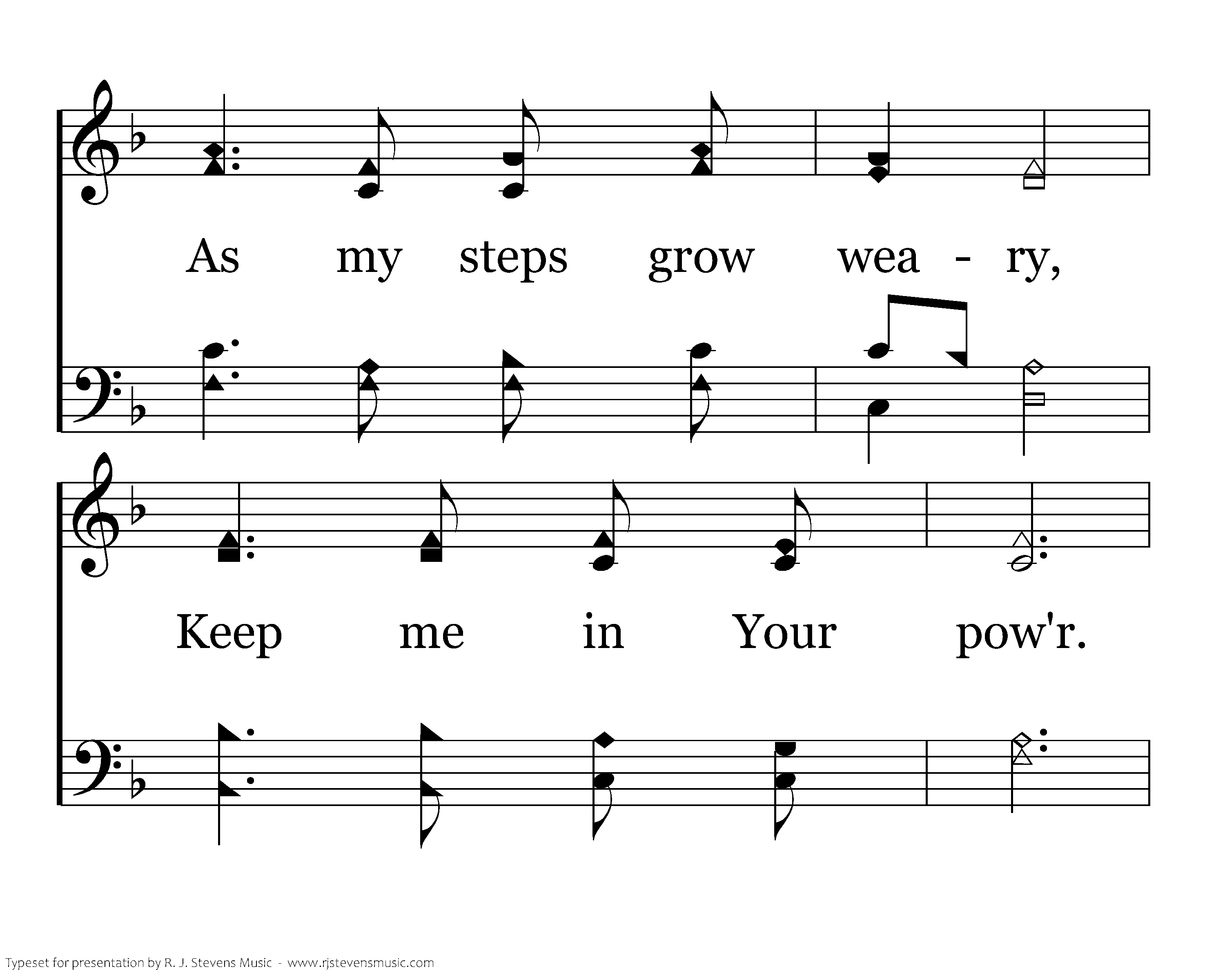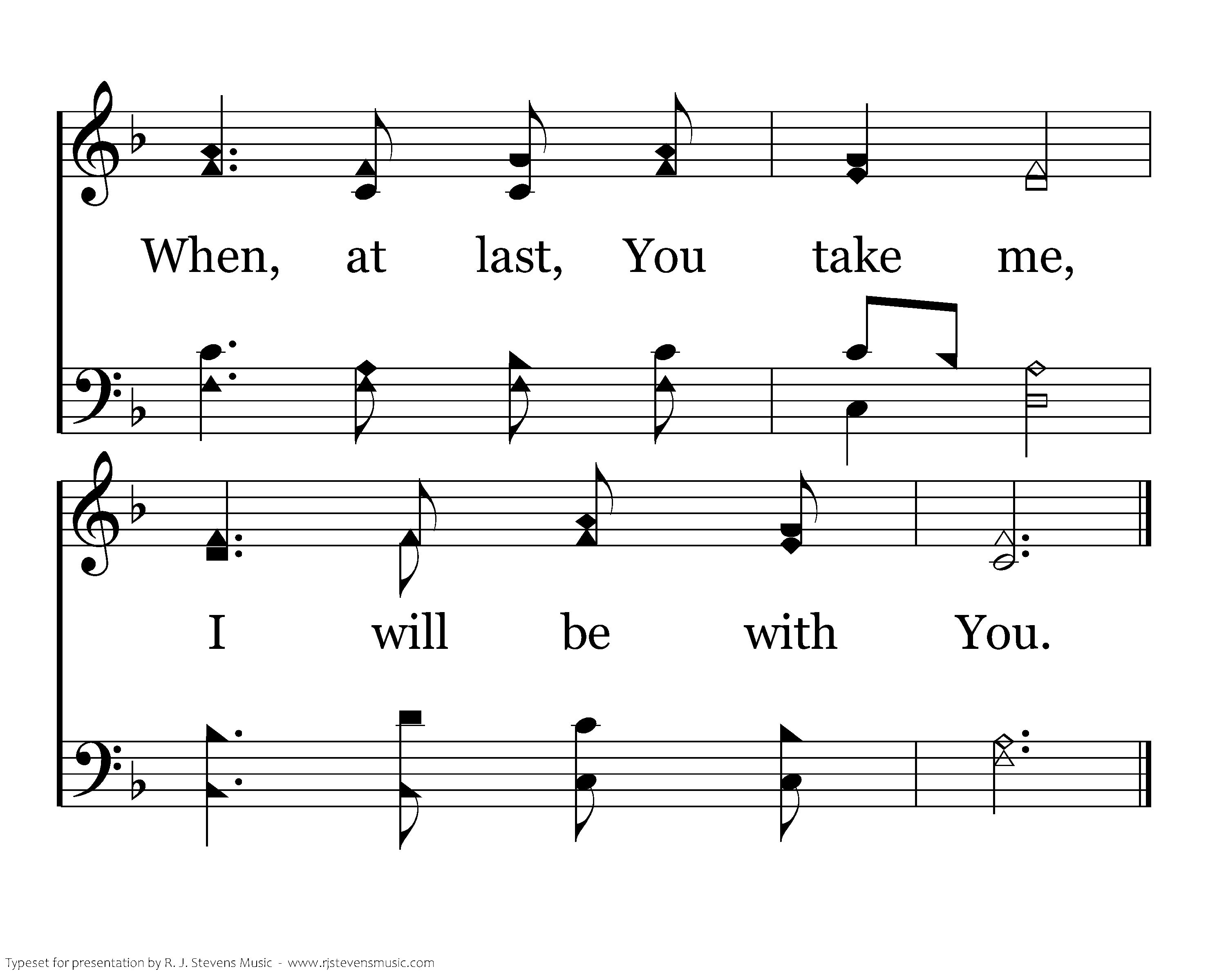 Lord, continue with me Till my final hour; As my steps grow weary, Keep me in your pow’r. You will not forsake me, For your word is true; When, at last, you take me, I will be with you.