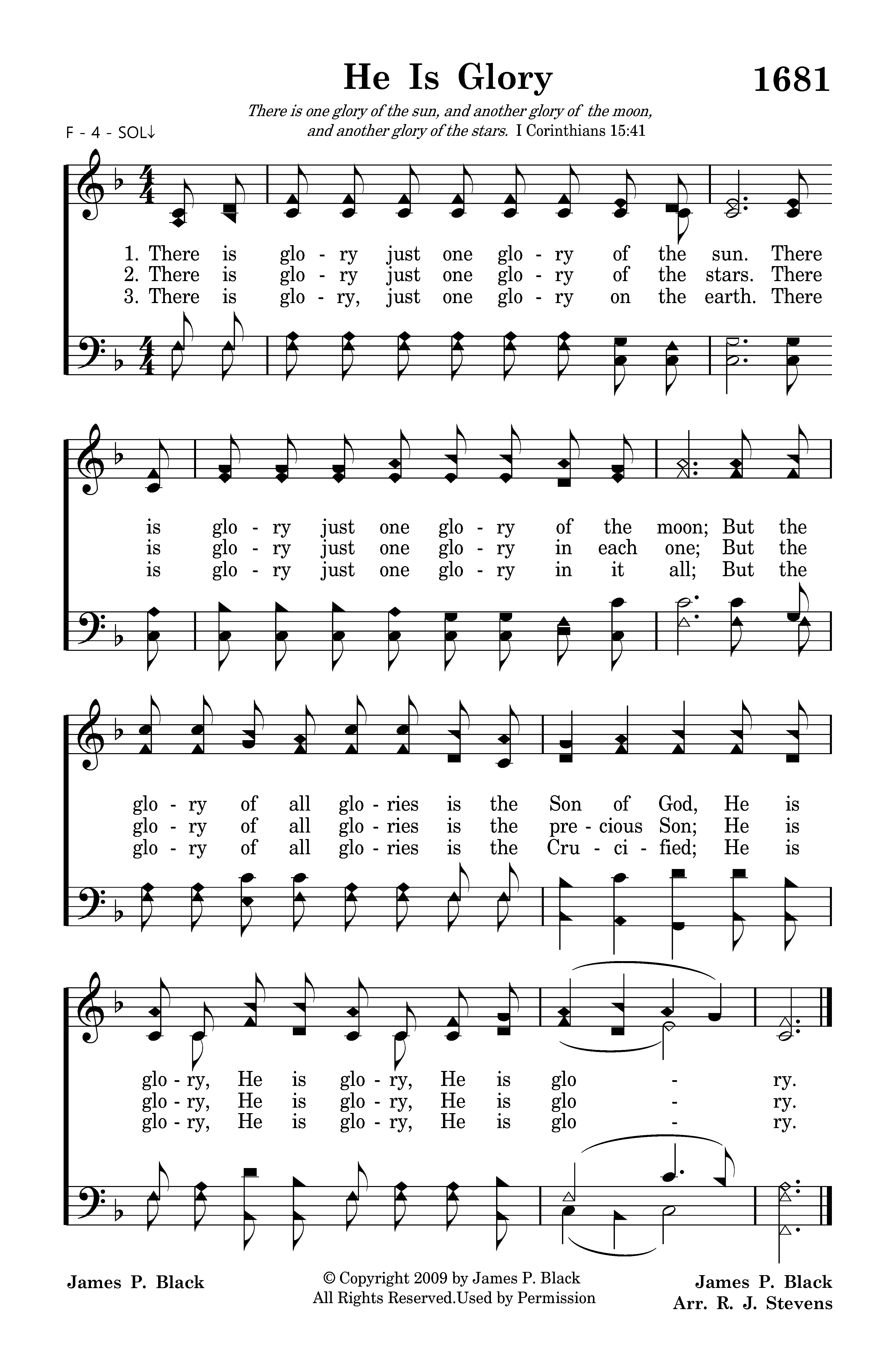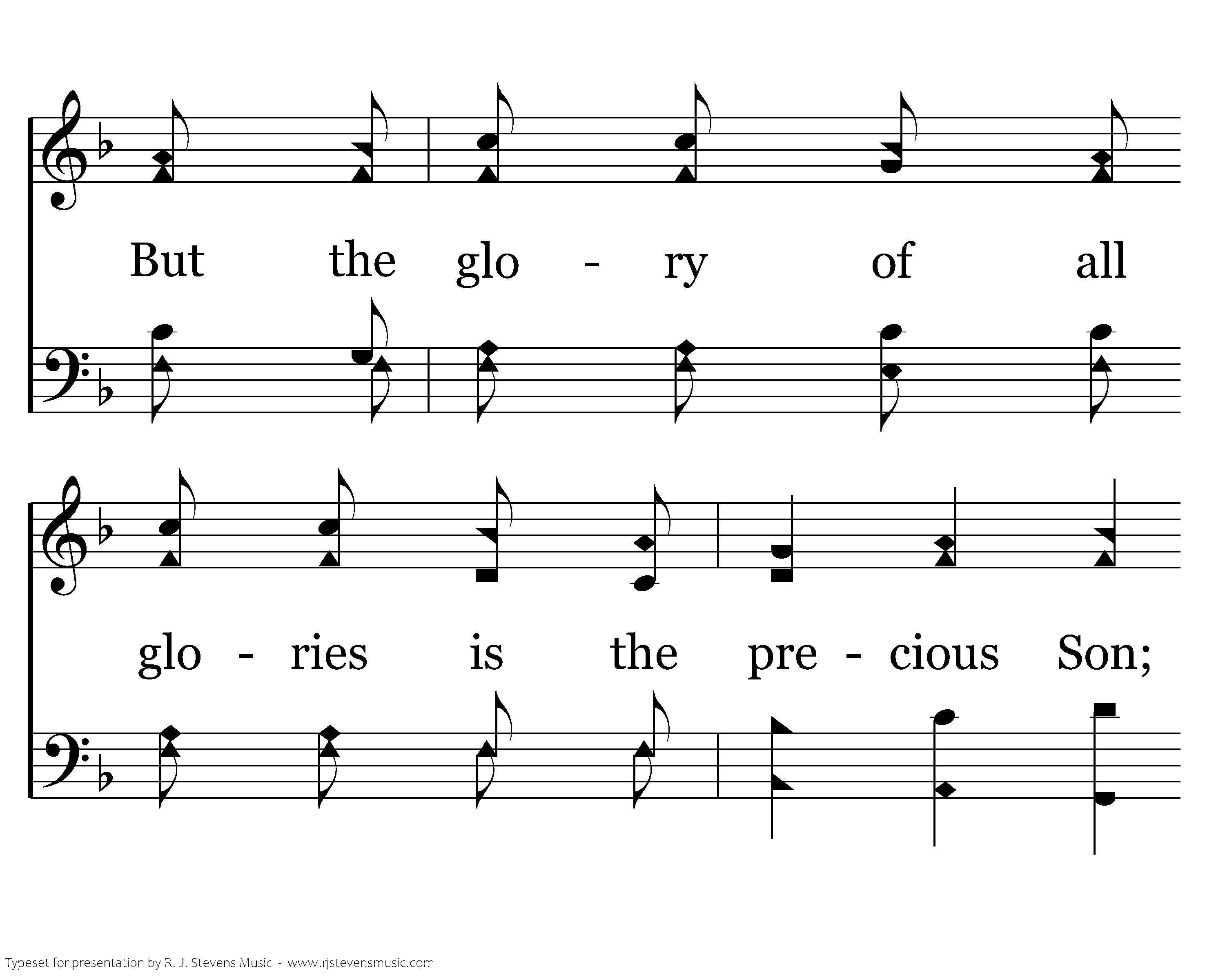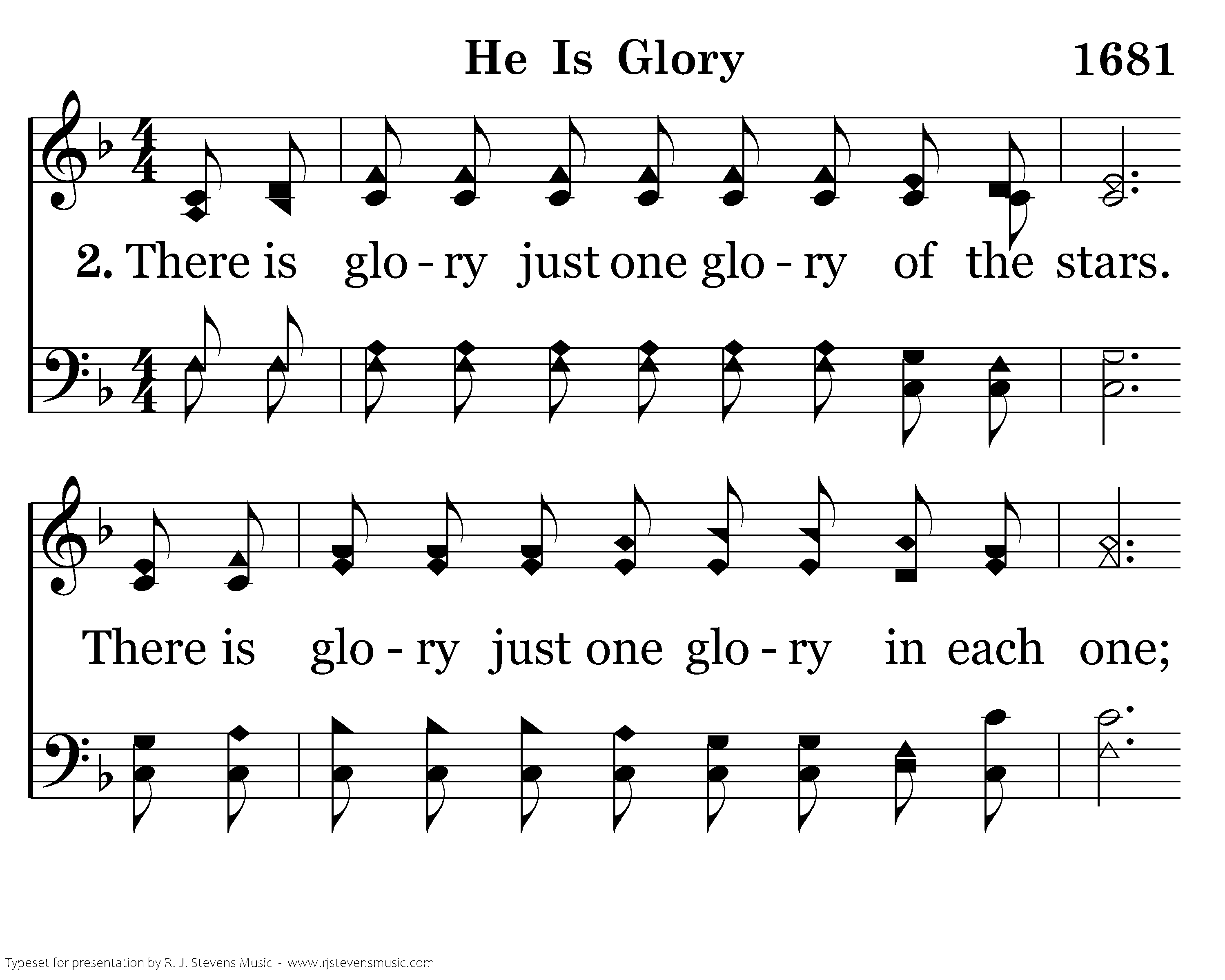 There is glory just one glory of the stars. There is glory just one glory in each one; But the glory of all glories is the precious Son; He is glory, He is glory, He is glory.