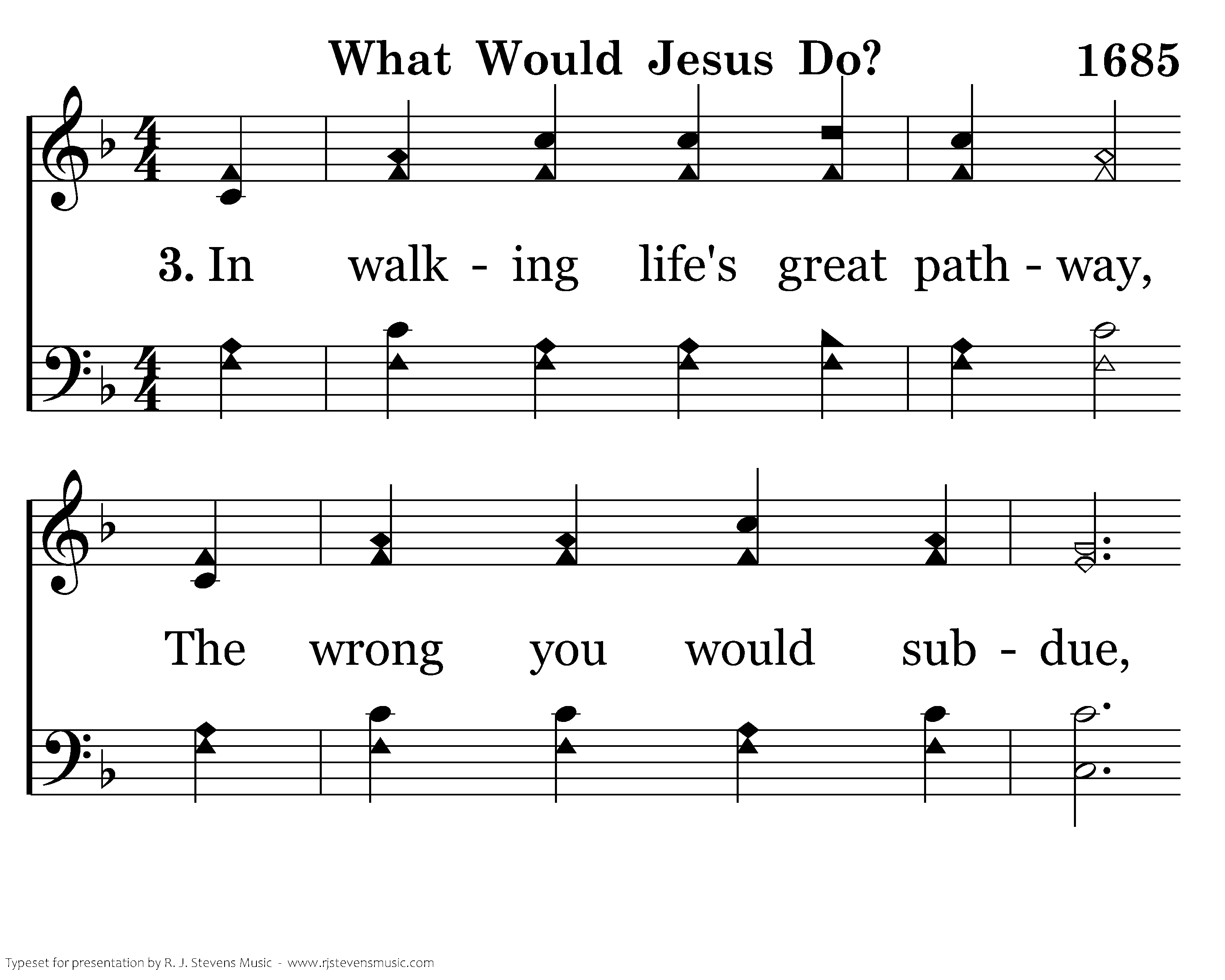 In walking life's great pathway, The wrong you would subdue, Be sure to ask the question great, O "What would Jesus do?"