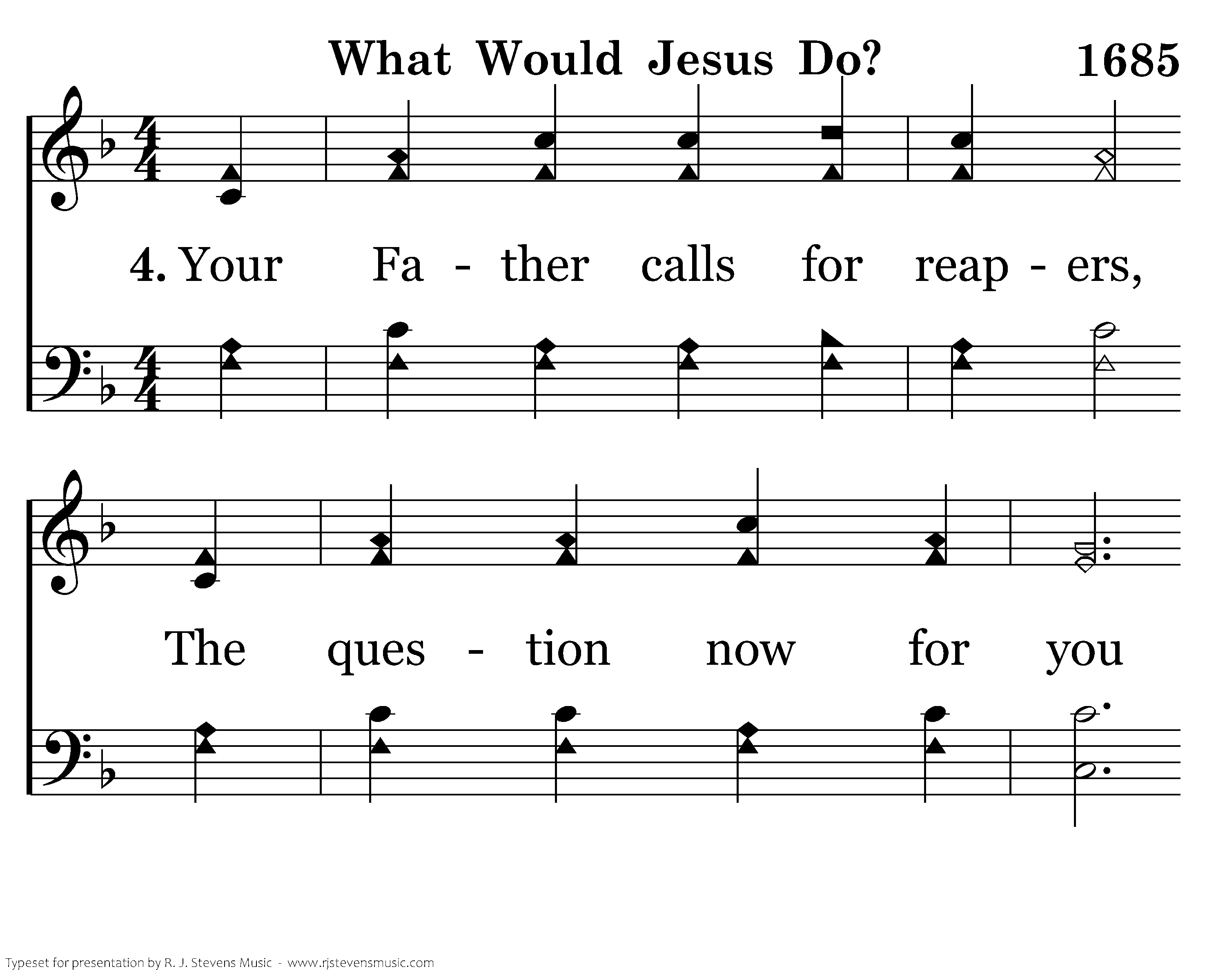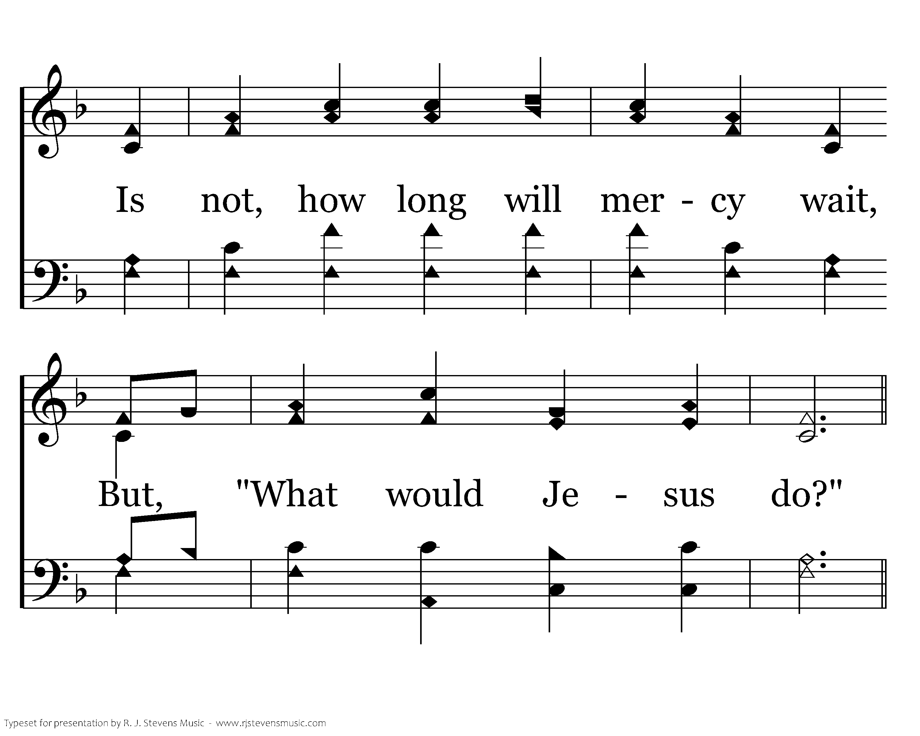 Your Father calls for reapers, The question now for you Is not, how long will mercy wait, But, "What would Jesus do?"