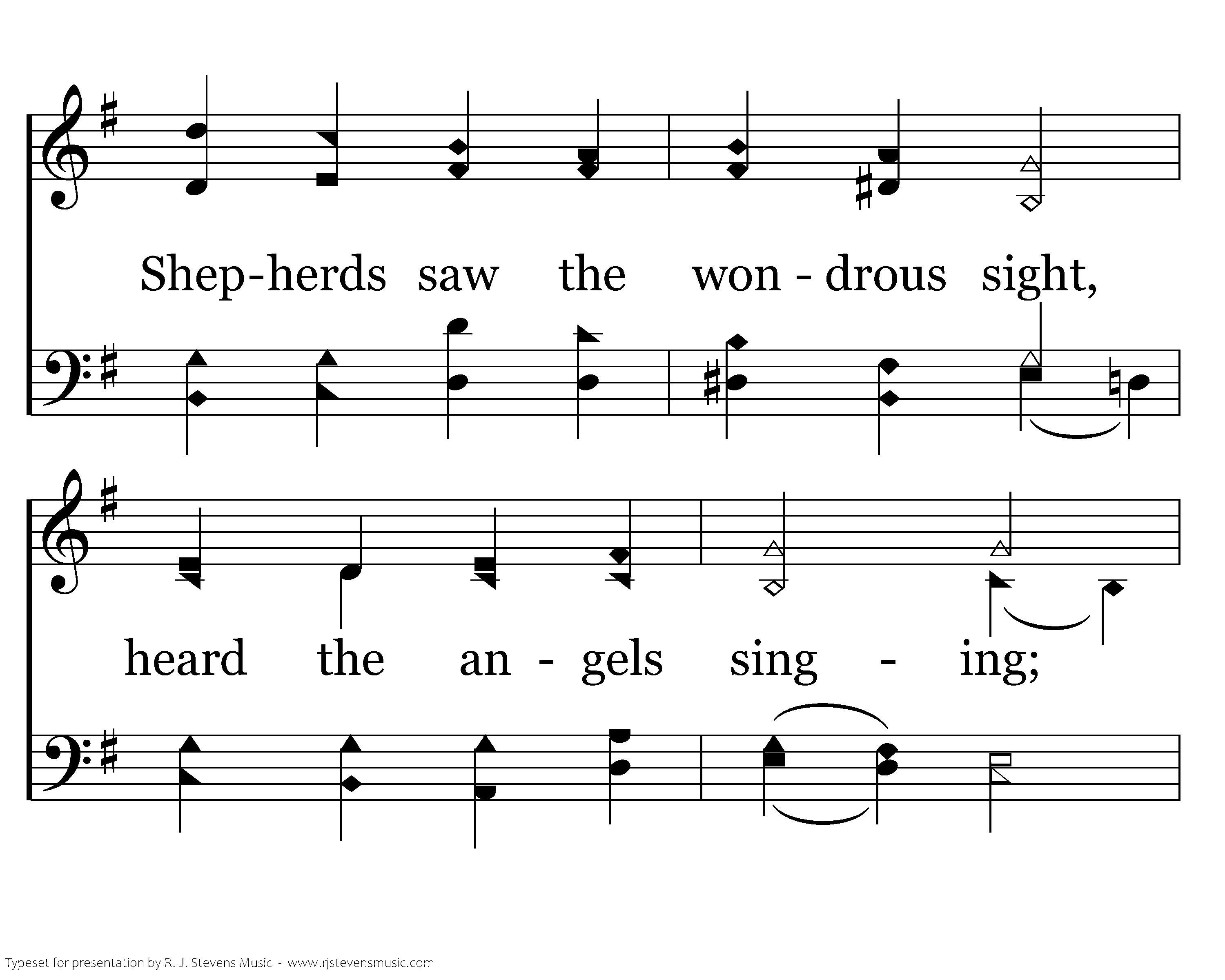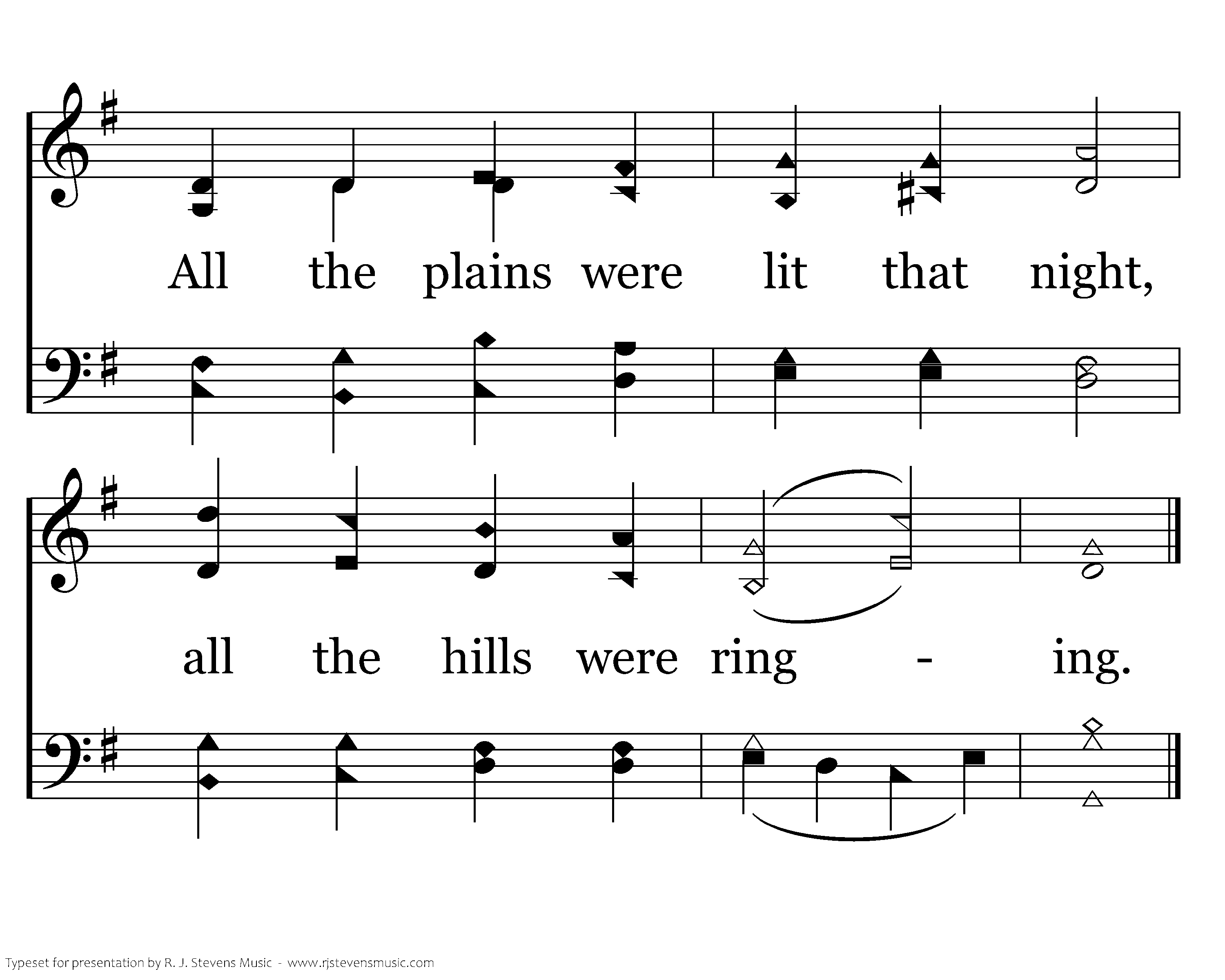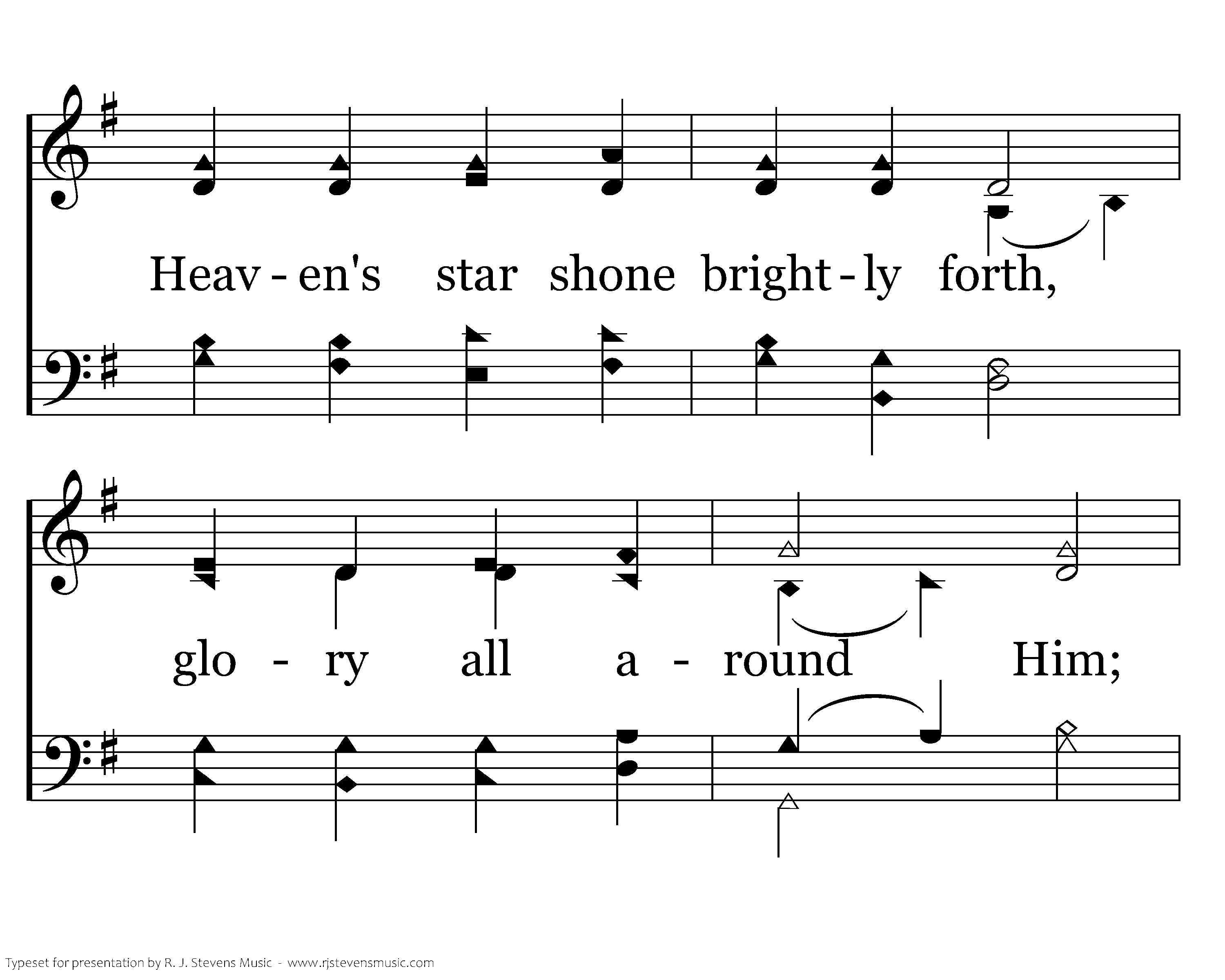Angels sang about His birth; wise men sought and found Him; Heaven's star shone brightly forth, glory all around Him; Shepherds saw the wondrous sight, heard the angels singing; All the plains were lit that night, all the hills were ringing.