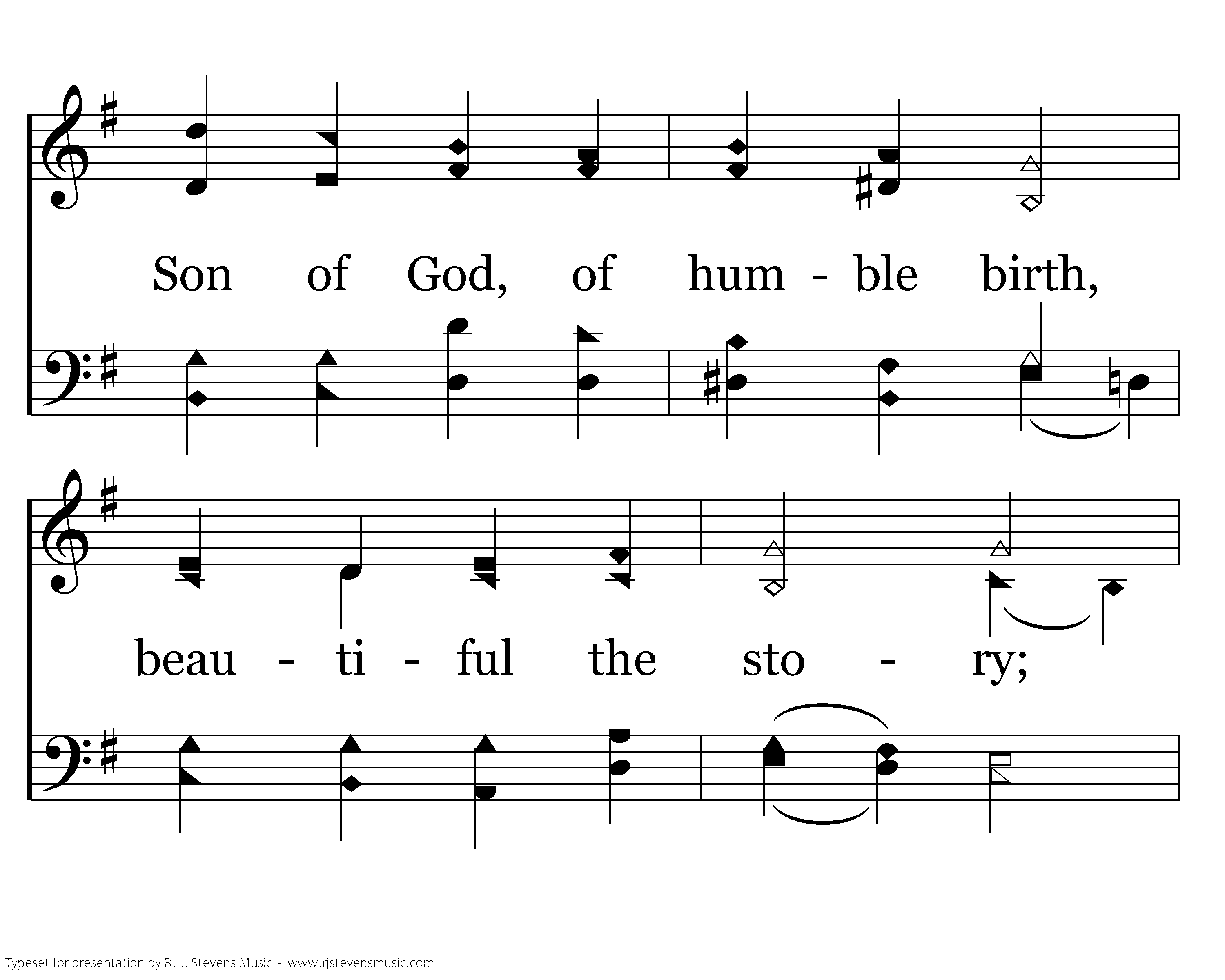 Gentle Mary laid her Child lowly in a manger; He is still the undefiled, but no more a stranger: Son of God, of humble birth, beautiful the story; Praise His Name in all the earth, hail the King of glory!