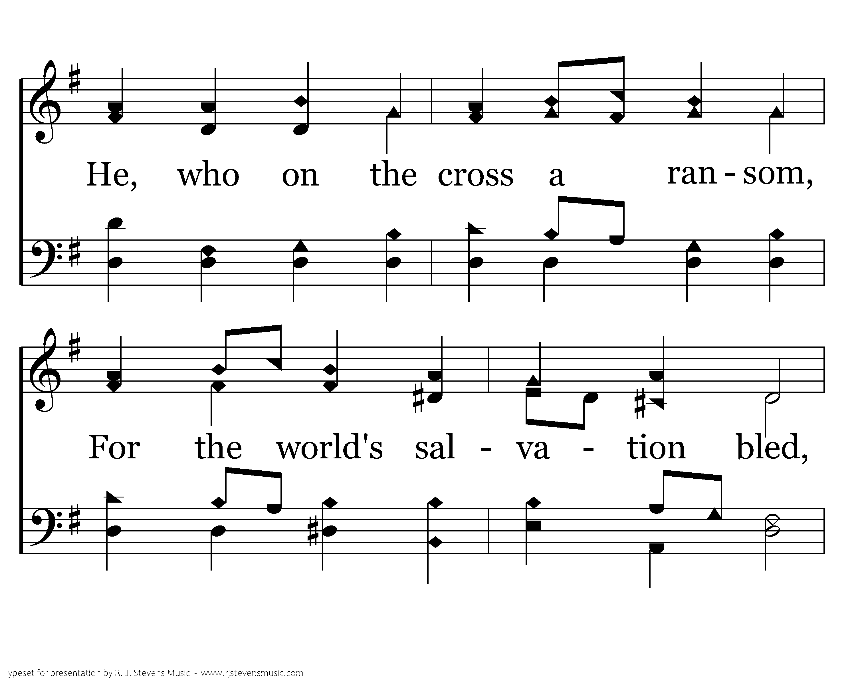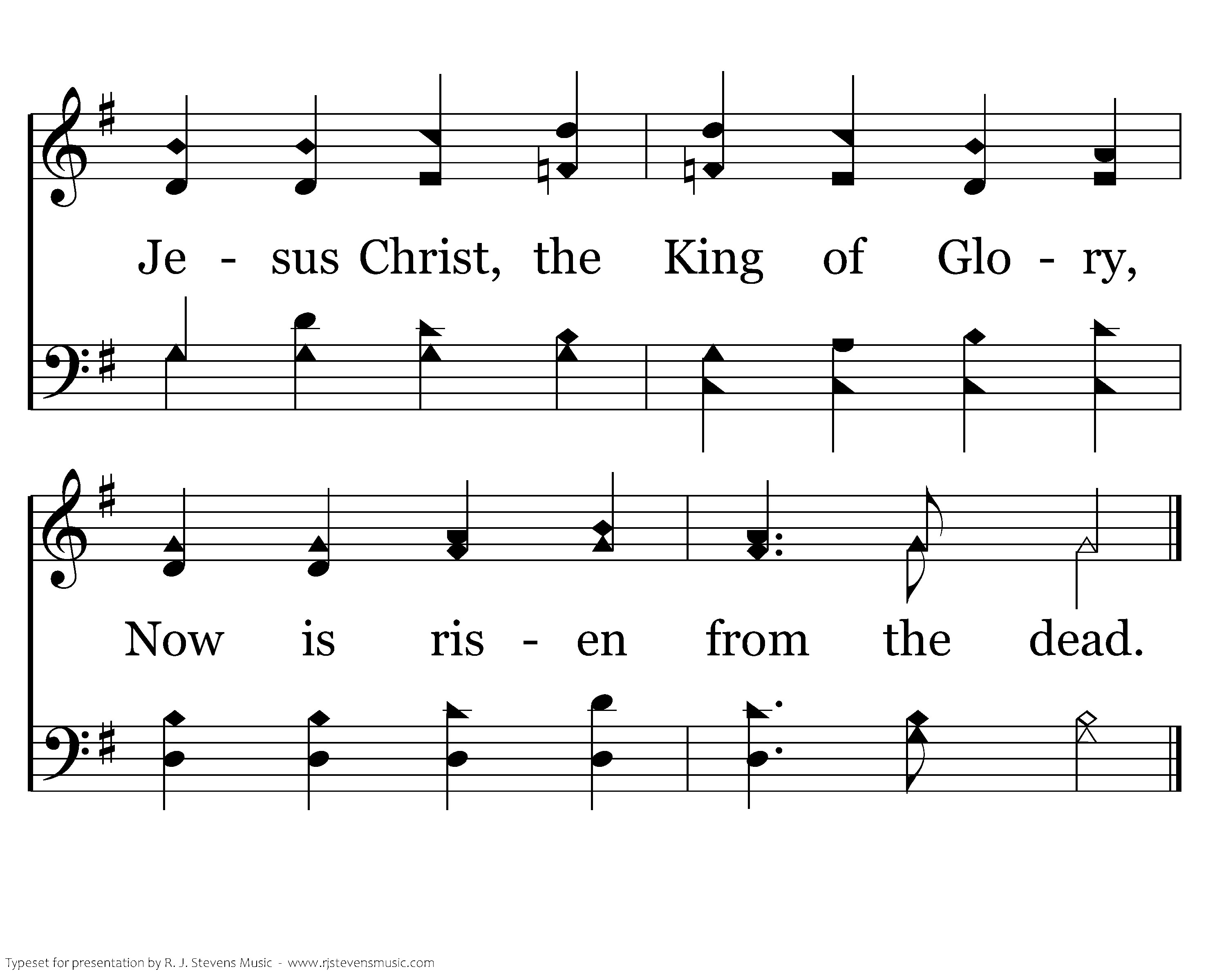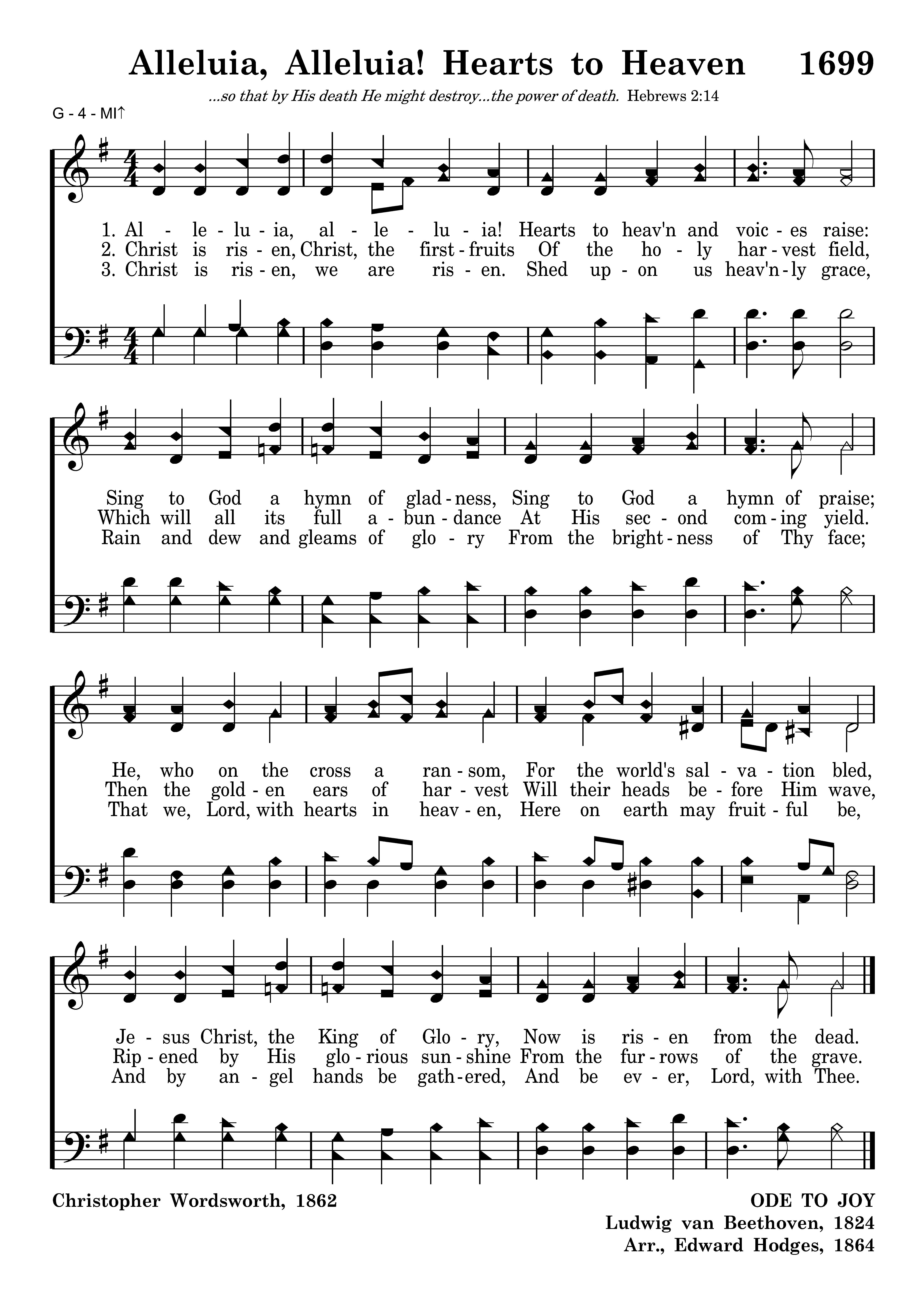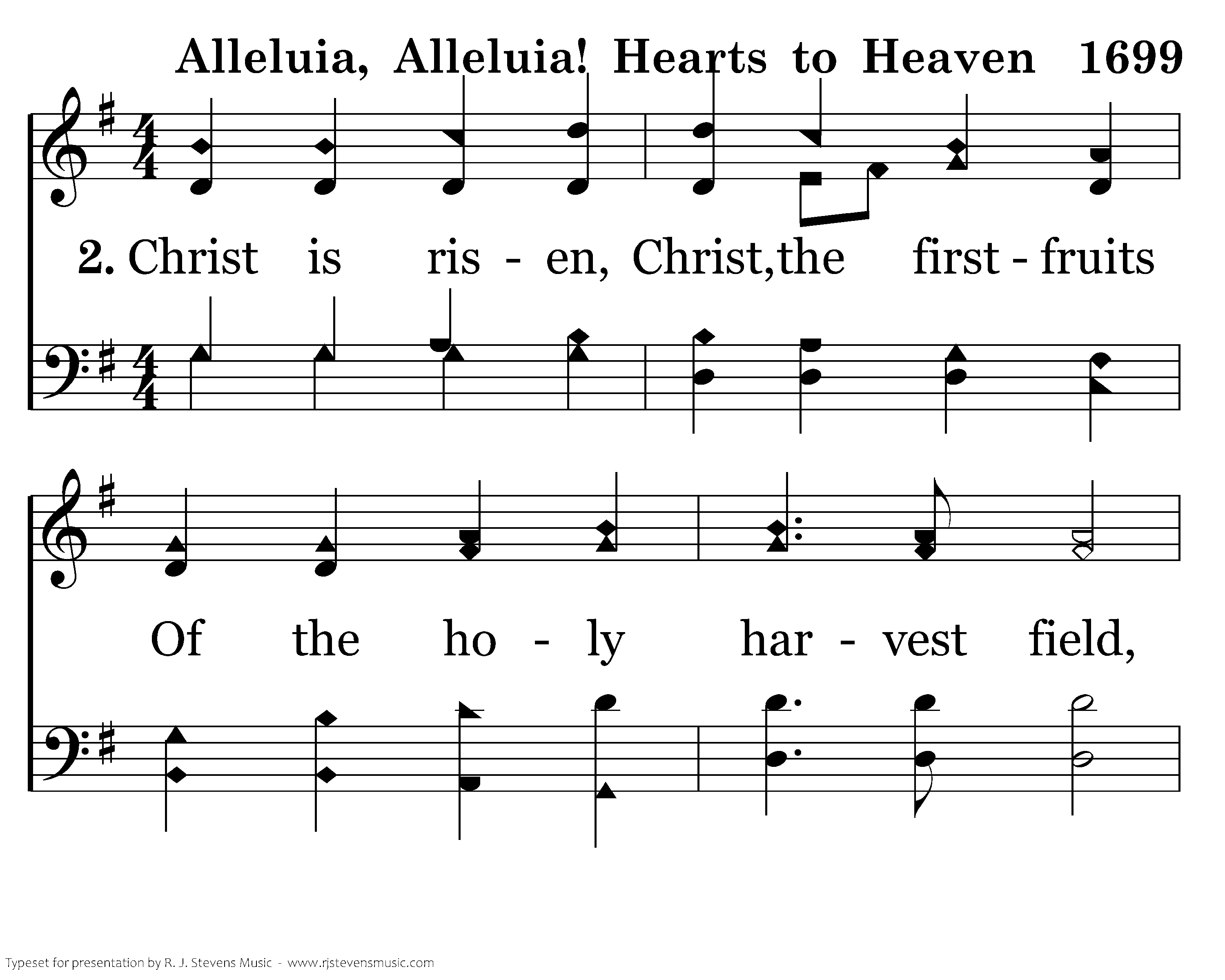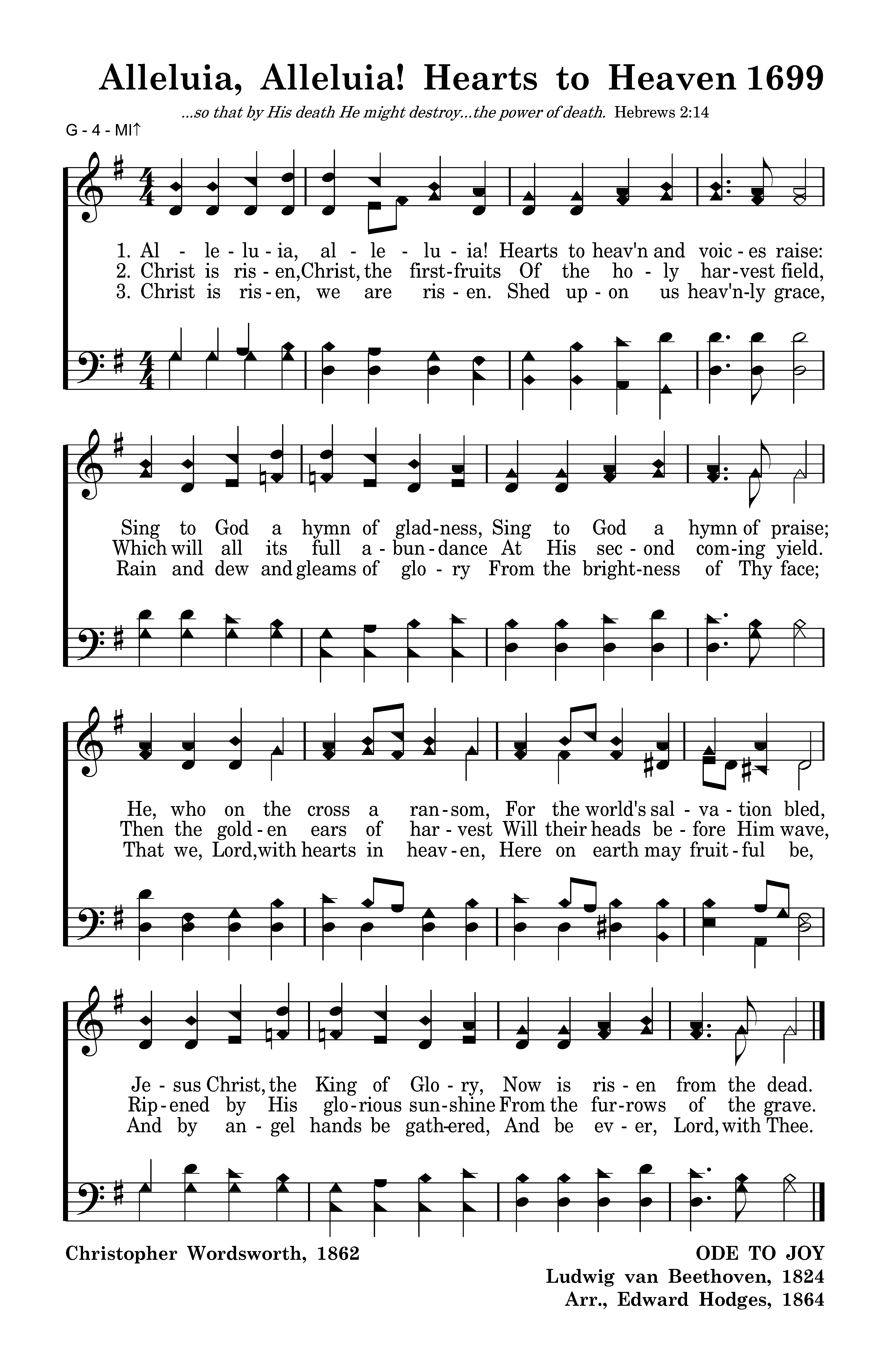 Alleluia, alleluia! Hearts to heav'n and voices raise: Sing to God a hymn of gladness, Sing to God a hymn of praise; He, who on the cross a ransom, For the world's salvation bled, Jesus Christ, the King of Glory, Now is risen from the dead.