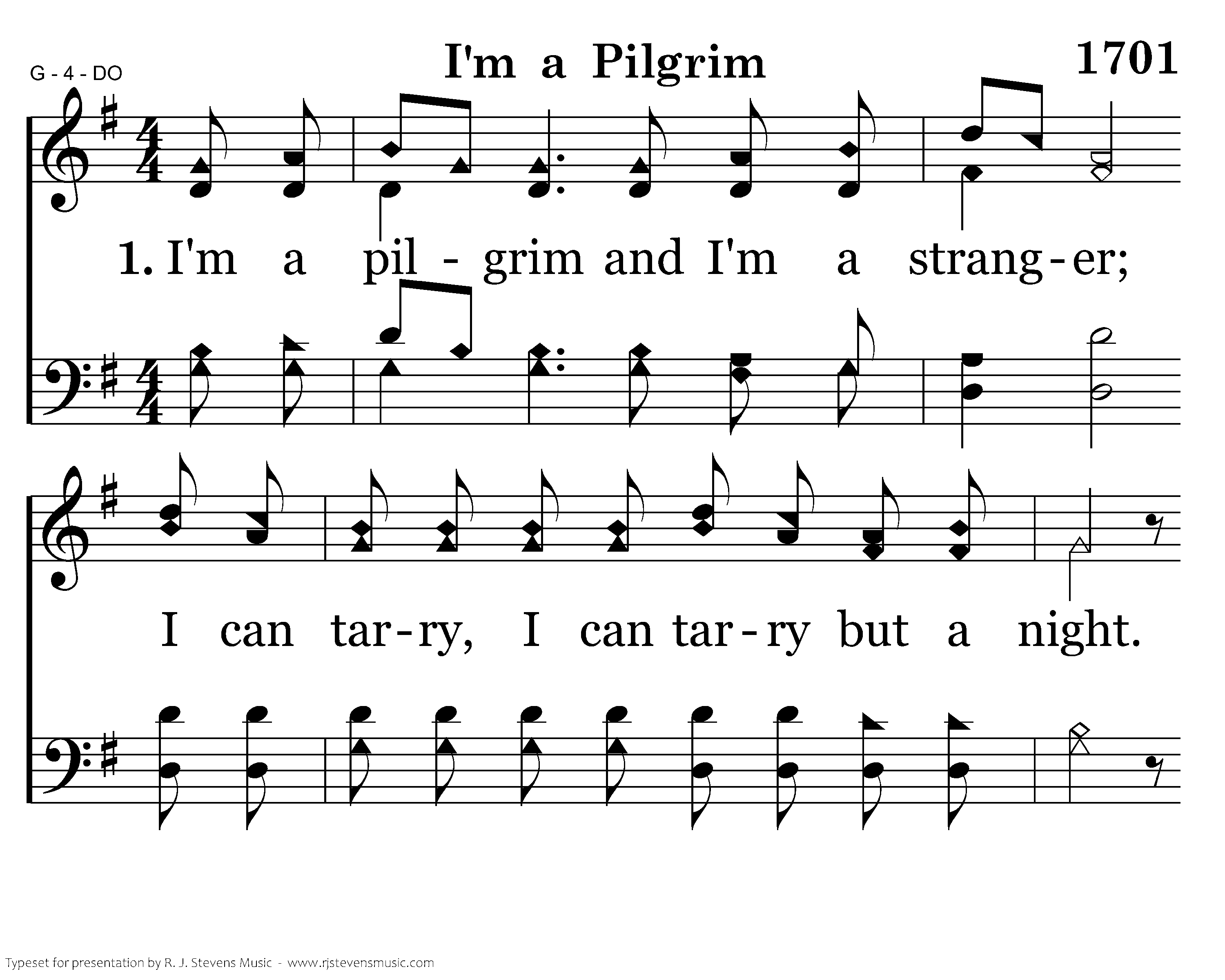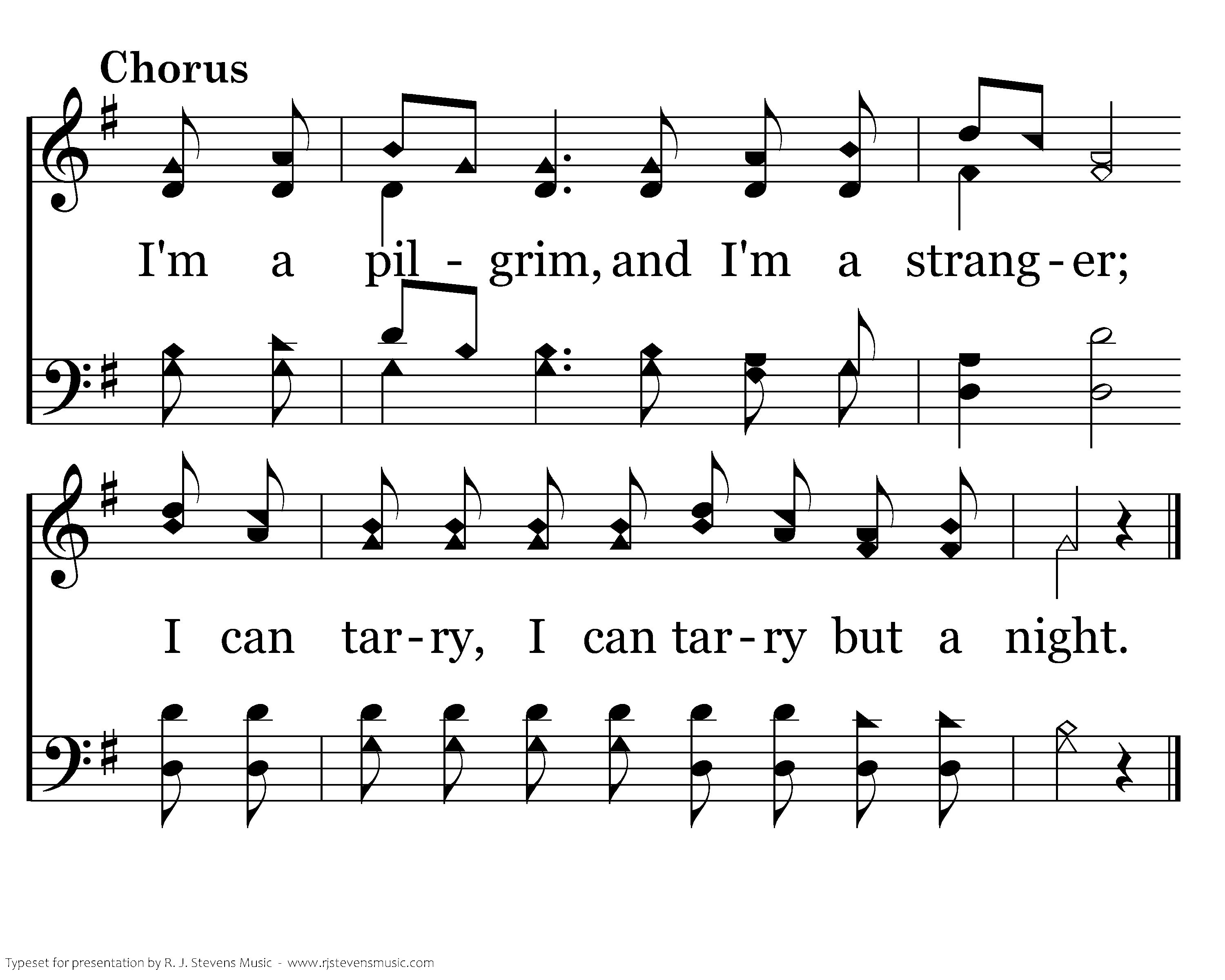 I'm a pilgrim and I'm a stranger; I can tarry, I can tarry but a night. Do not detain me, for I am going To where the fountains are ever flowing.