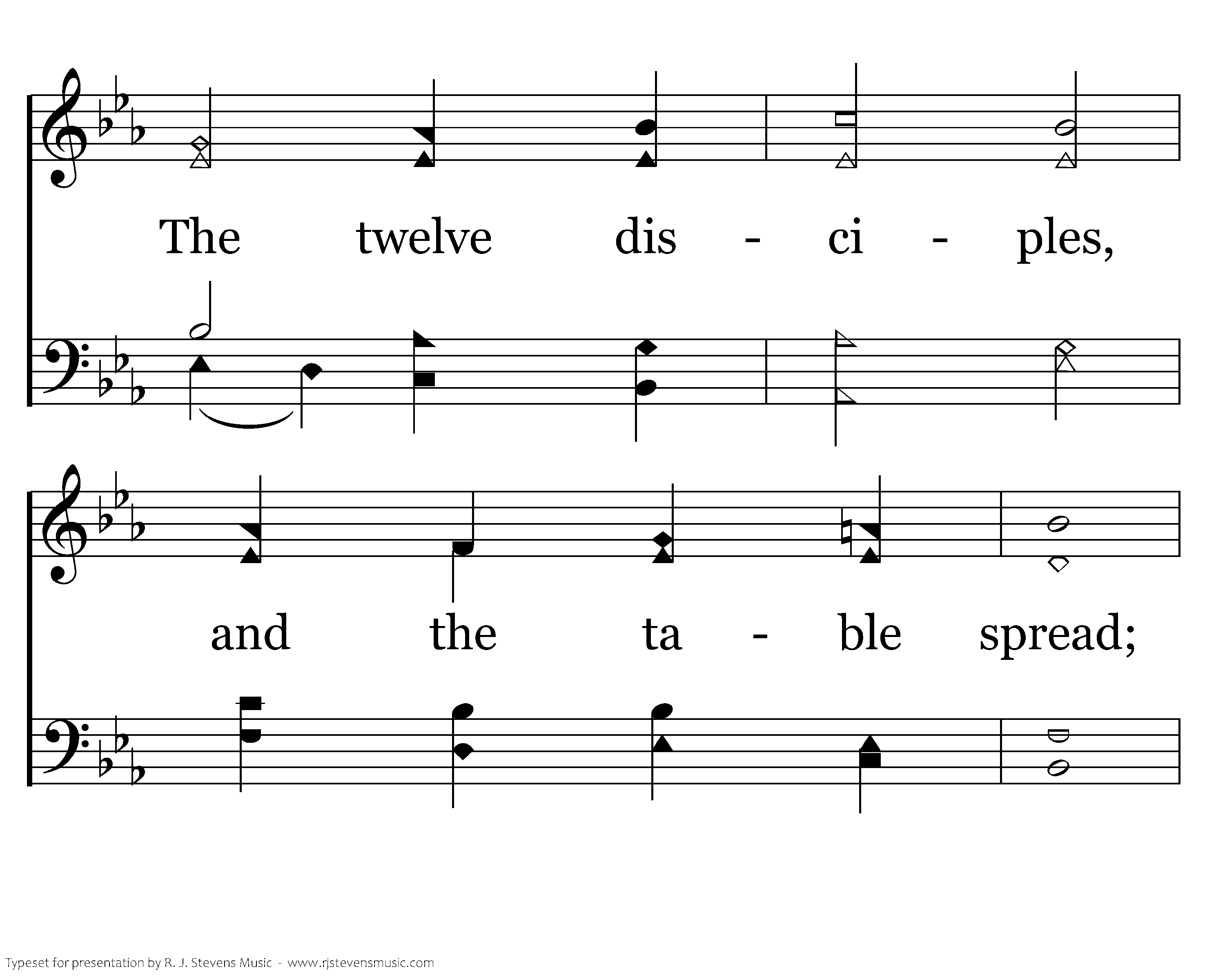 An upper room with evening lamps ashine, The twelve disciples, and the table spread; Now in our turn Christ bids us pour the wine, And in remembrance bless and break the bread.